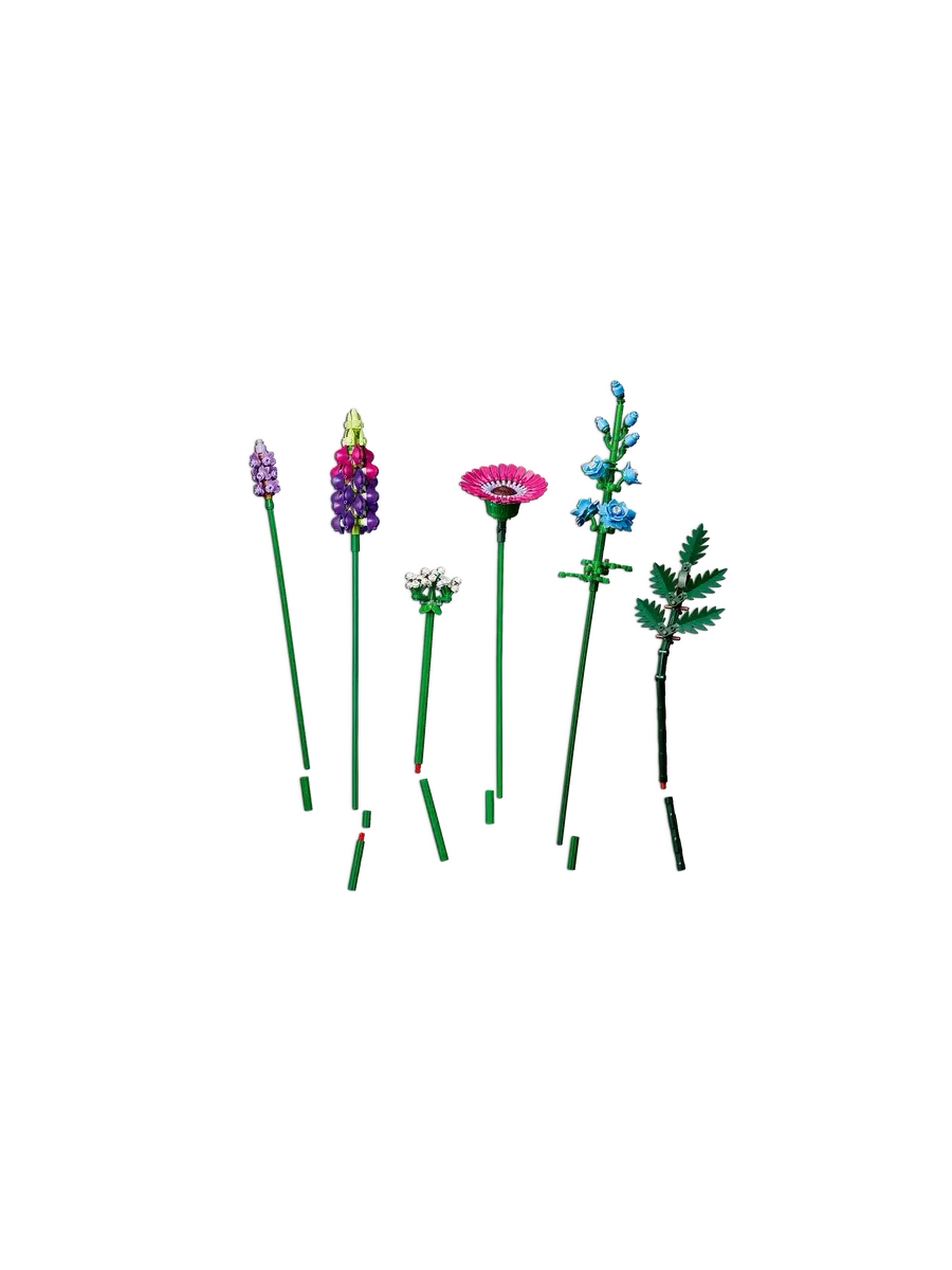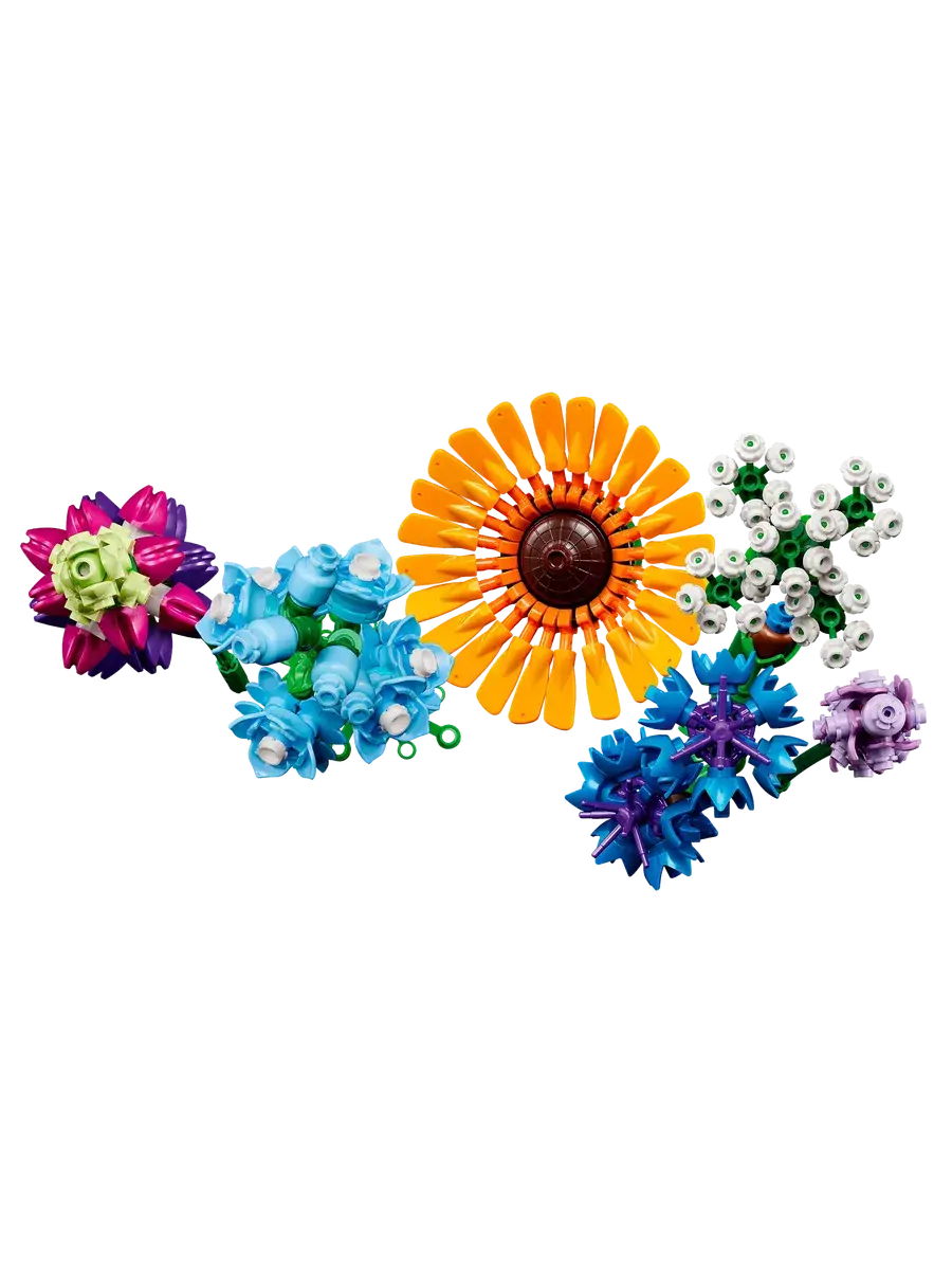Набор состоит из девяти видов разных цветов. Каждый цветок собран из замысловатых деталей. Цветы прекрасны как по отдельности, так и в виде букета. Стебельки цветов могут быть разной длины (благодаря стыкуемым элементам). Детали конструктора для девочек качественно сделаны, поэтому хорошо стыкуются.