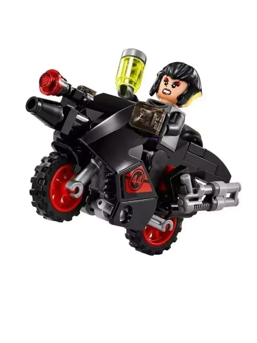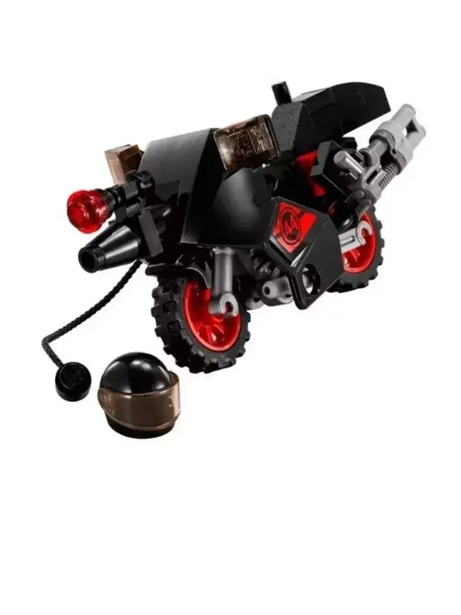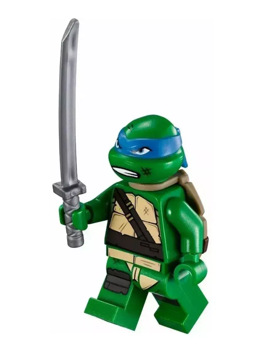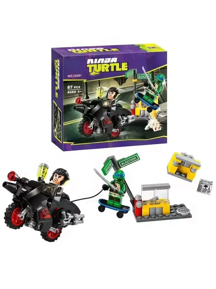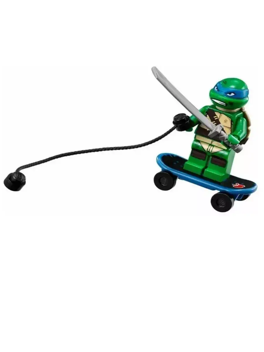 Держитесь крепче в седле Мотоцикла и верните мутаген! Караи захватывает одну из потерянных канистр мутагена и пытается убежать на своём супер–крутом мотоцикле. Помогите Леонардо прицепить веревку к задней части Байка Караи и прокатитесь на скейтборде с захватывающими ощущениями по городским улицам. Держитесь крепче, пока Караи разгоняется на Мотоцикле с двойным выхлопом и проезжает мимо дорожного знака–указателя. Накиньте лассо из верёвки на этот уличный указательный знак. Вот что произойдёт дальше ― держась за лассо, накинутое на опору дорожного указателя, Леонардо слегка повернёт в сторону, его скейтборд налетит на ограждение ремонтных работ и, использовав это ограждение в качестве своеобразного трамплина, он налетит на торговый газетный автомат, находящийся поблизости. Автомат взорвётся, Караи упадёт, и тогда Лео сможет забрать контейнер с мутагеном! Этот небольшой Конструктор состоит, фактически, из двух основных моделей–построек ― Это мощный Мотоцикл Караи и уличное сооружение, основной деталью которой, является автомат по продаже газет; а кроме него там находятся также некоторые другие городские атрибуты. Ну и плюс, конечно, пара замечательных персональных Мини фигурок героев мира TMNT с личным оружием и аксессуарами (Черепашка–Ниндзя Леонардо и один из врагов Черепашек ― Девушка–Боец по имени Караи).