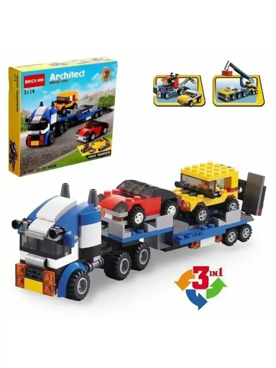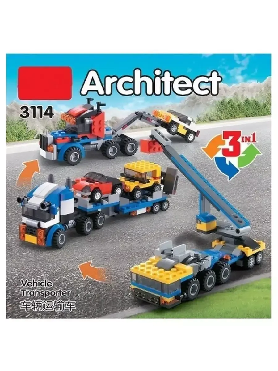 Конструктор машинка транспортировщик автомобилей 3 в 1 это уникальный конструктор по типу лего, который позволяет из 264 деталей создать сразу 3 модели различной автотехники, это машина автовоз с двумя машинками, подъемный кран, и буксировщик автомобилей (строительный кран, строительная техника, машинка джип, грузовик, кара, автокран, подъемный кран, автокран, гоночная машина). Фантазии нет предела с супер разнообразным конструктором по типу лего техник architect машина техника 3 в 1. Конструктор это отличный подарок ребенку на день рожденья, 23 февраля, новый год, или любой другой праздник. Конструктор лего развивает моторику, фантазию, воображение, техническое мышление и креативность. В комплекте находится подробная инструкция по сборке 3 моделей. Конструктор изготовлен из высококачественного пластика, что позволяет сколько угодно раз разбирать и собирать различные модели на любой вкус.