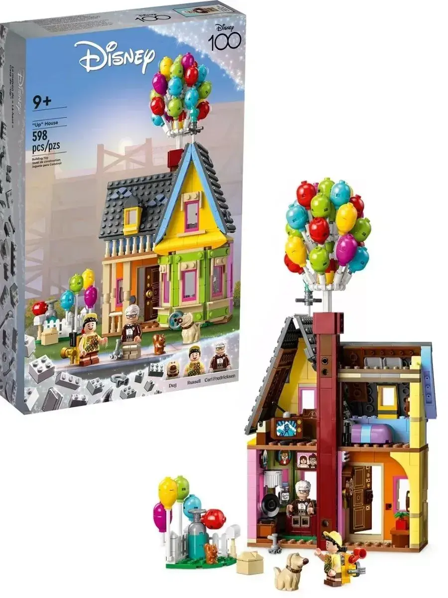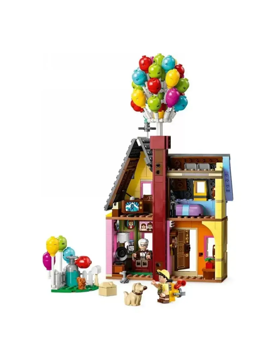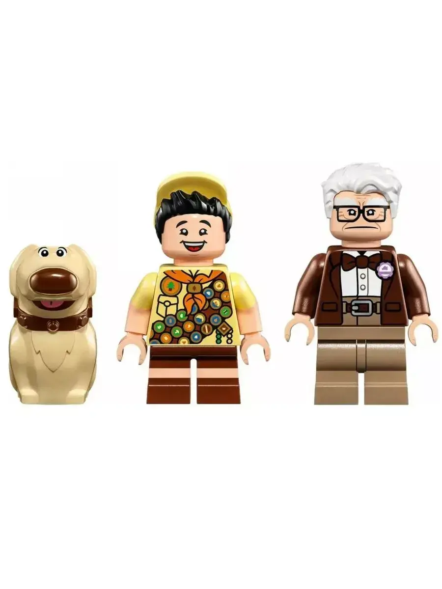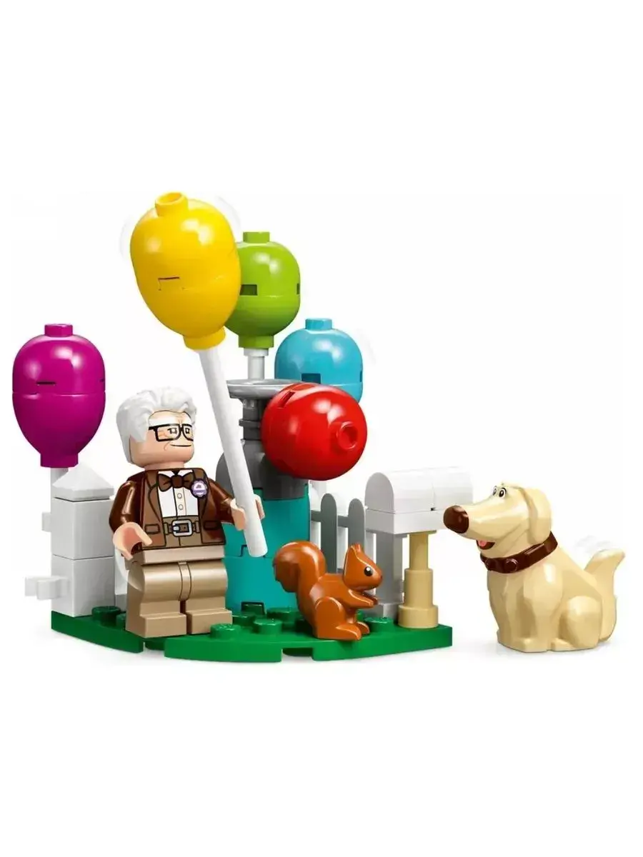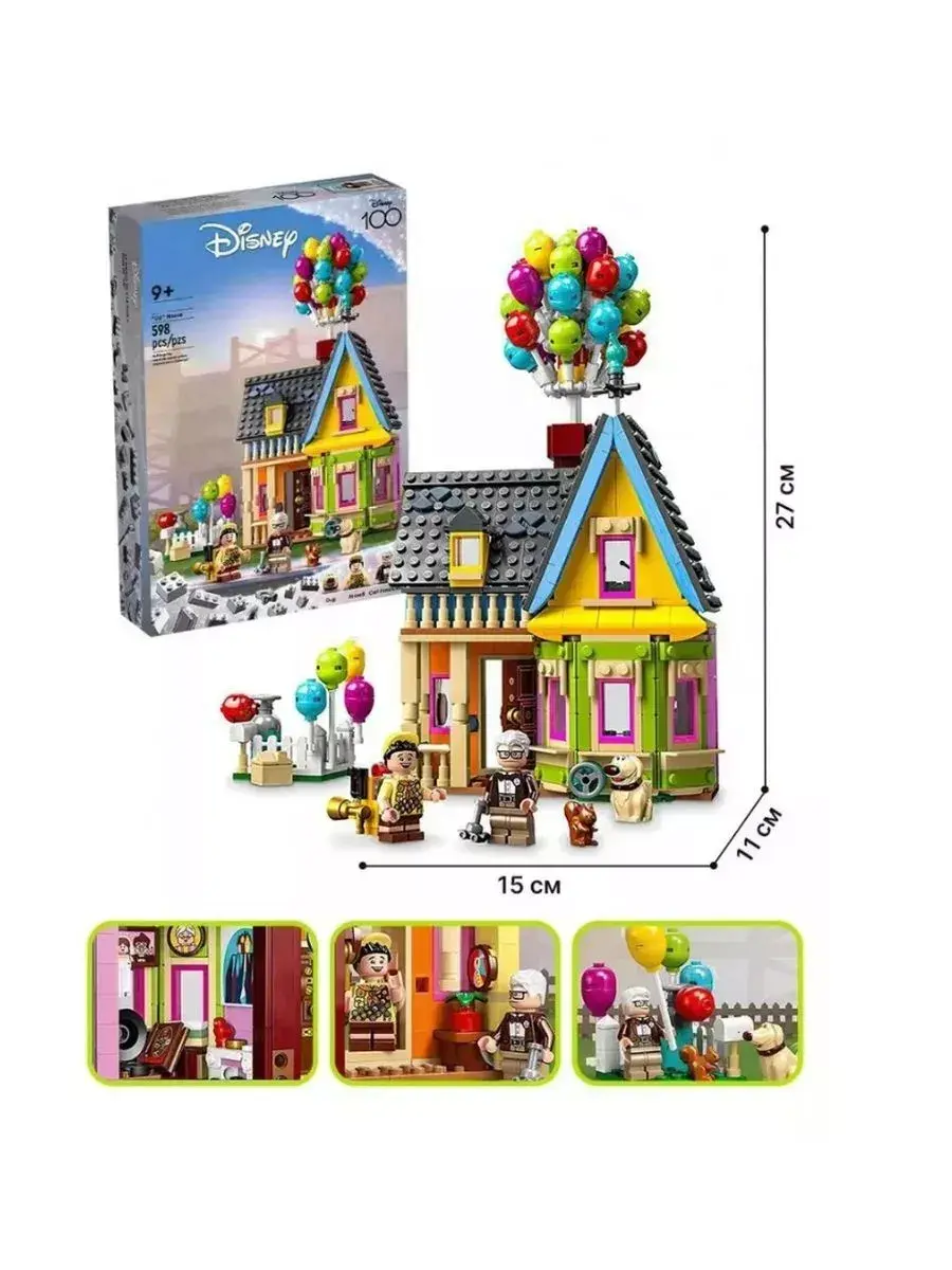 Конструктор Дом из мультфильма Вверх из 598 деталей в собранном виде имеет размеры 11*15*27 см. Соберите летающий дом из культового мультфильма «Вверх» от студий Дисней и Пиксар — это двухэтажный коттедж, полностью повторяющий мультяшный прототип по цвету и интерьеру: прихожая с часами и картиной, кровать на втором этаже у окна, кресло, торшер и проигрыватель пластинок в гостиной, телевизор и ящик с книжкой на чердаке, высокая крыша с дымоходом, из которого выходит целое облако разноцветных воздушных шариков. Дополнением к летающему зданию служит заборчик, за которым стоит баллон и воздушные шарики возле почтового ящика. В набор входят минифигурки персонажей: Карл Фредриксен с палочкой и двумя эмоциями, Рассел в кепке с рюкзаком и фигурка собаки Дага. Создавайте свои игровые сценарии и новые сюжеты из мира Дисней.