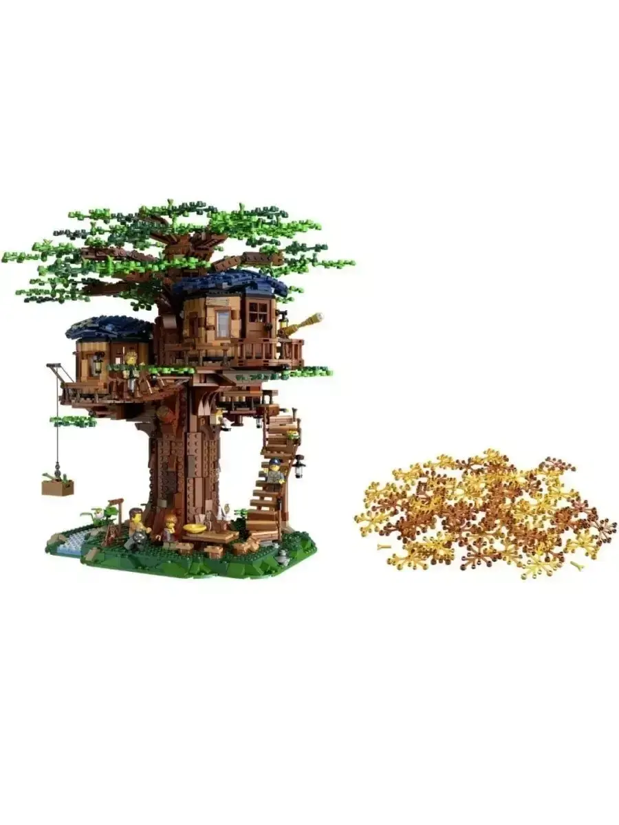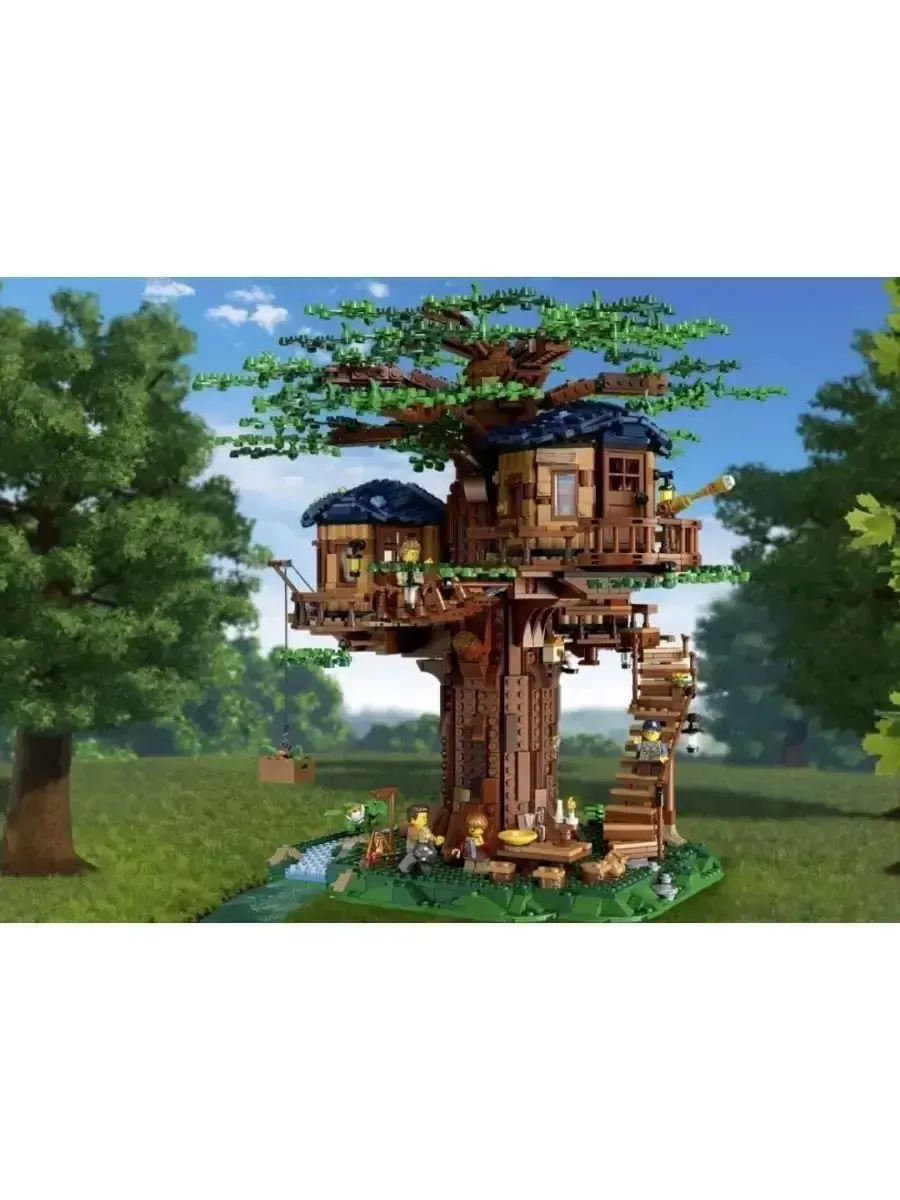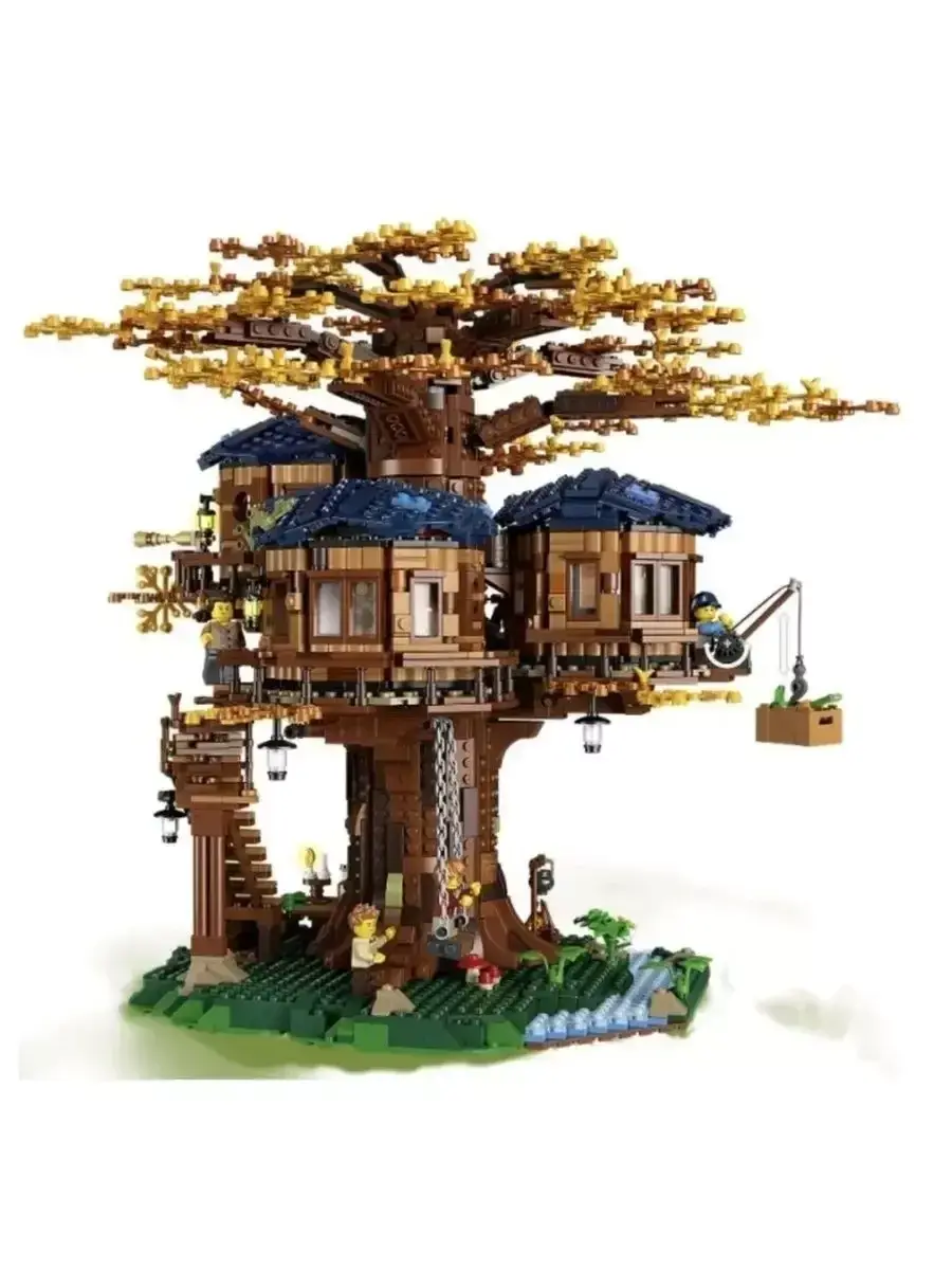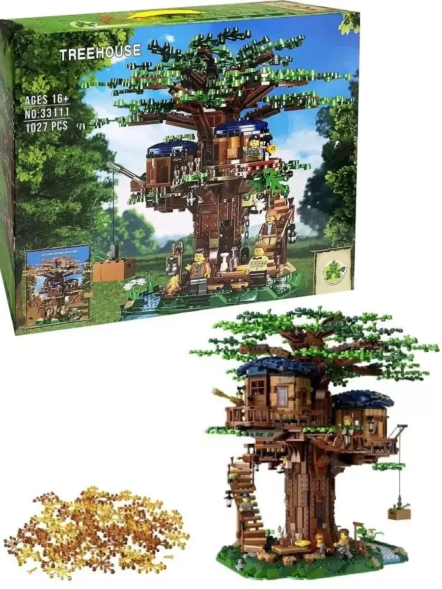 Конструктор Дом на дереве - станет отличным подарком для Вашего ребенка! Представленный комплектом из 1013 элементов, он создает фантастическую площадку для игры и фантазирования. Ключевой объект сборки высокое дерево с ветвями, усыпанными листвой зеленого цвета. Оно уходит глубоко корнями под землю, питаясь грунтовой водой и ловя капельки летнего дождя. Величие деревянистого растения выражается в мощи ствола и пышности кроны. Ландшафтным обрамлением этой жизненной формы выступают сочная растительность и водоем, дарящий дереву прохладу в жаркое время года.