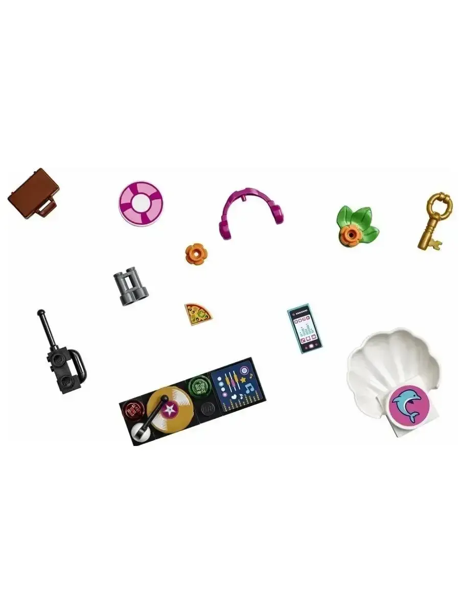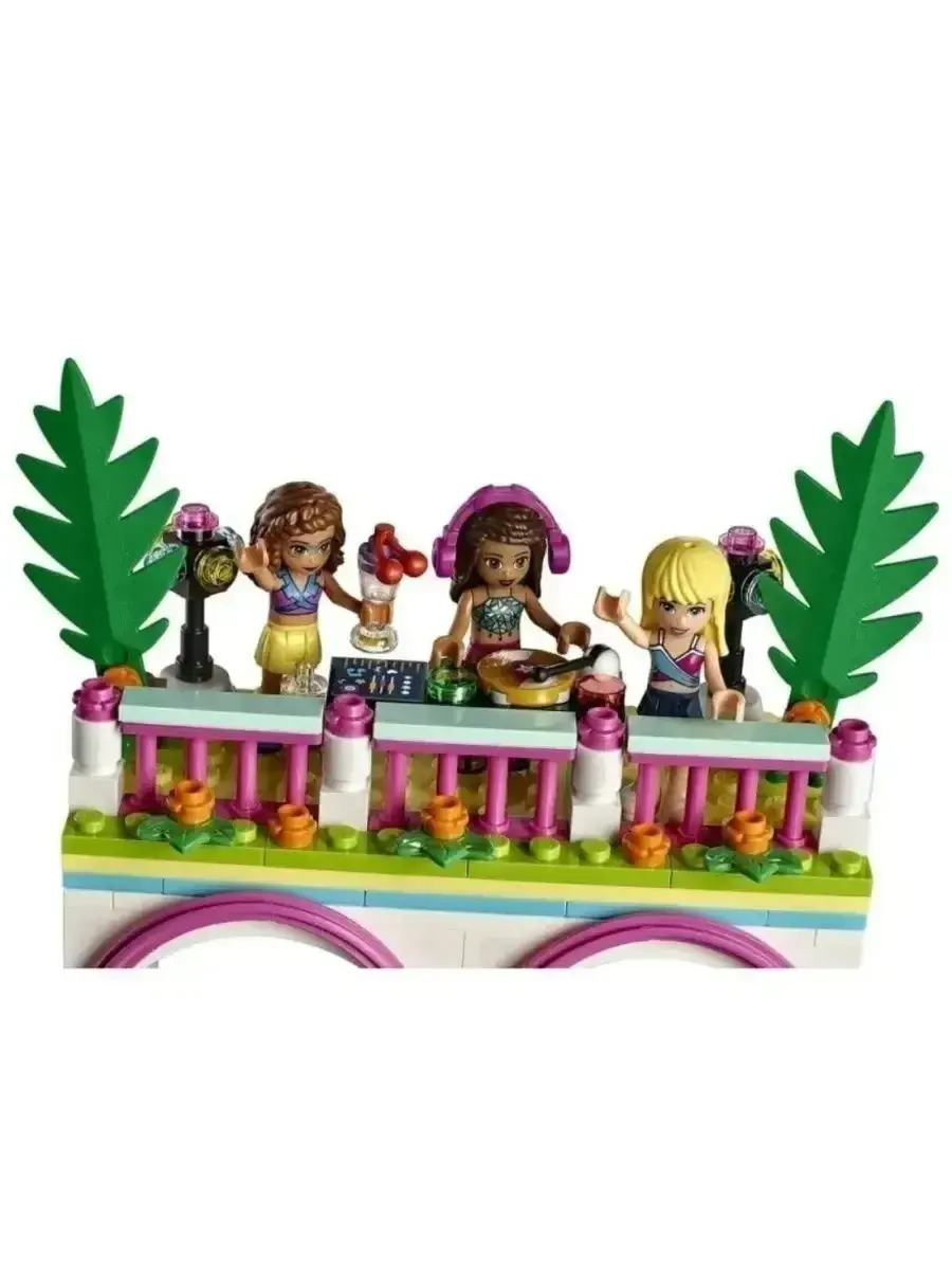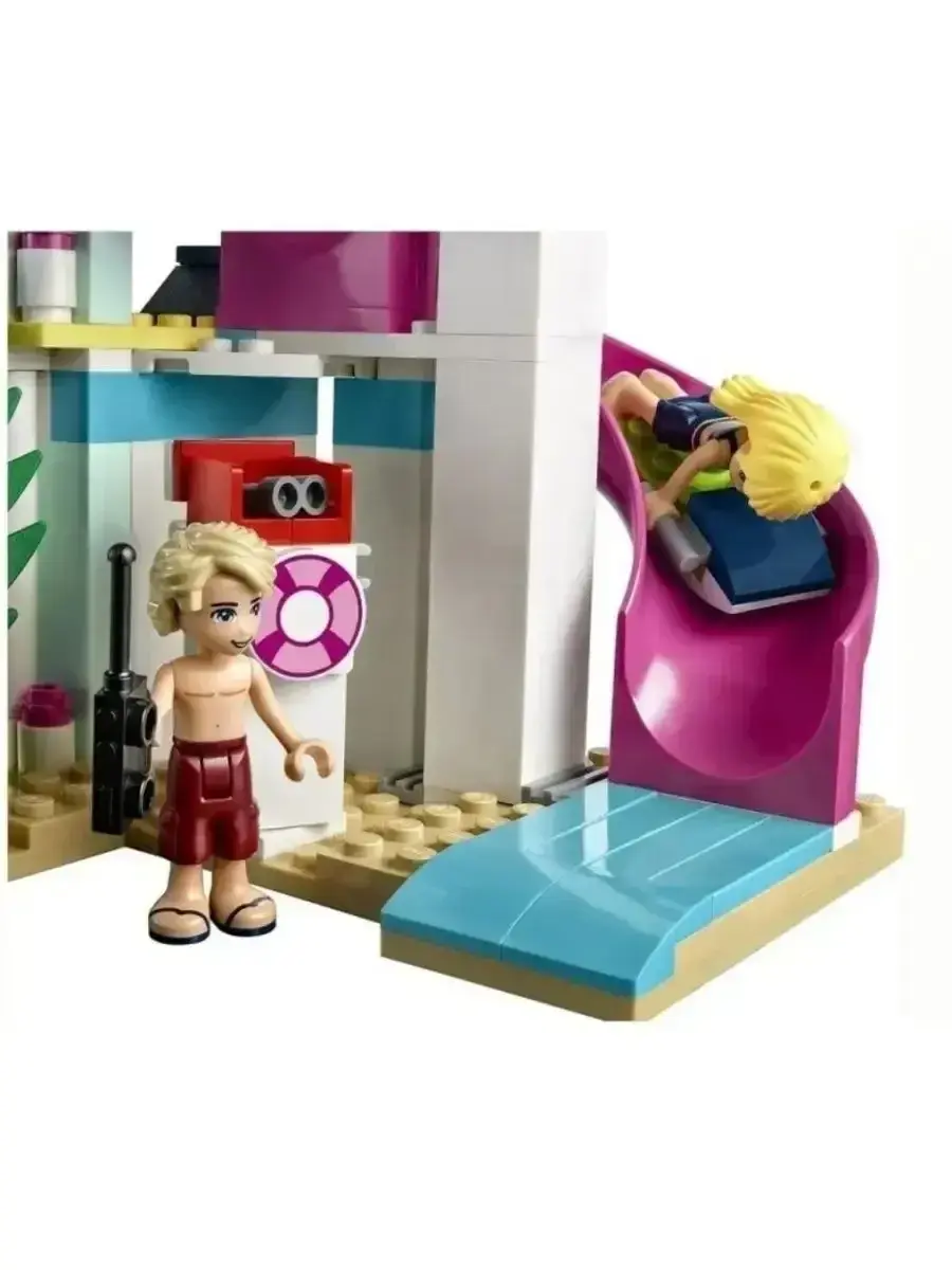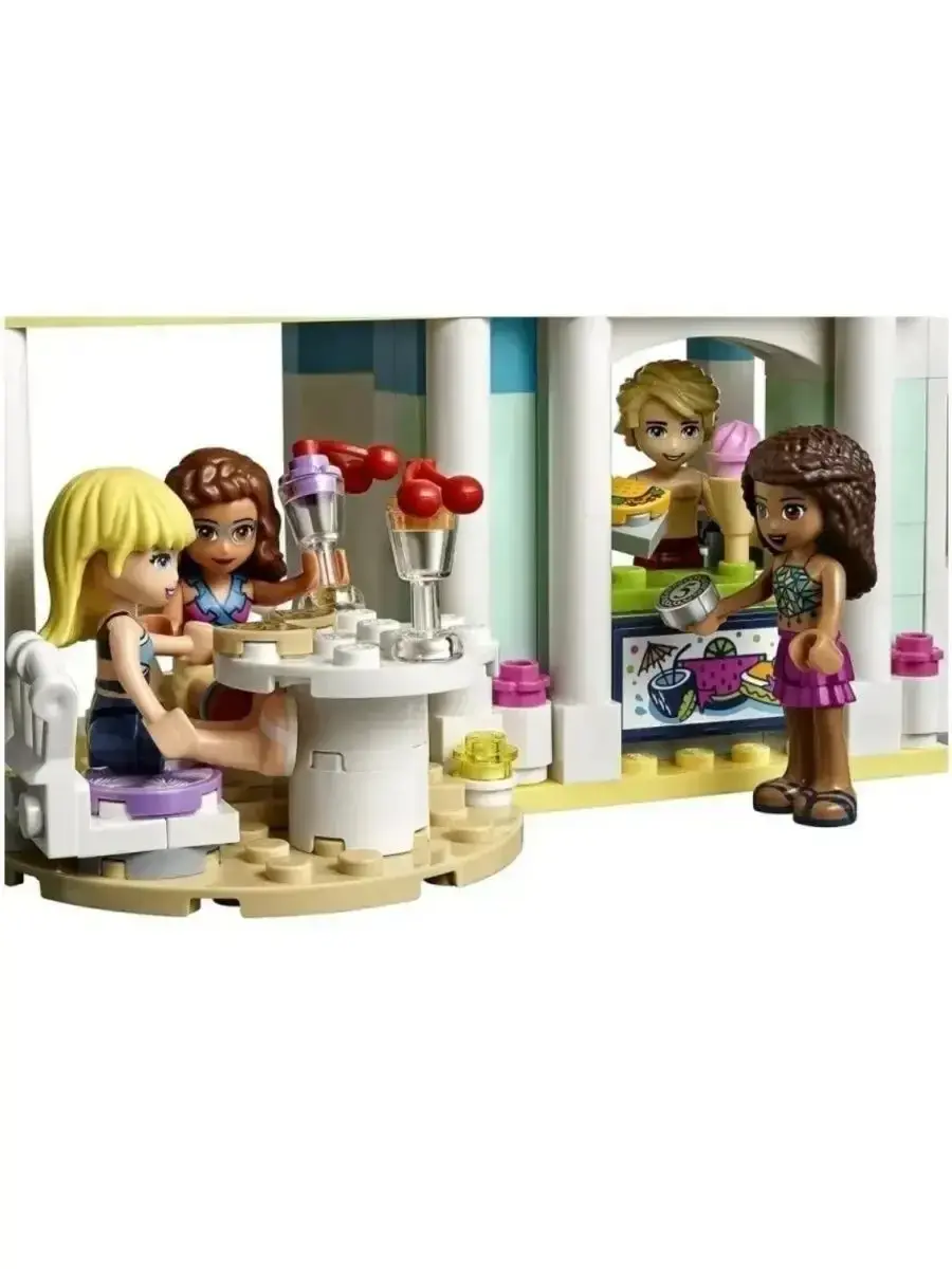 В комплект входят разнообразные элементы для создания просторного курорта с бассейнами, зонами отдыха, кафе, спортивными площадками и уютными комнатами для гостей. В набор включены фигурки героинь серии «Френдс», которые готовы наслаждаться отдыхом, веселиться и устраивать праздничные мероприятия. Ребёнок сможет разыгрывать увлекательные сюжеты, связанные с отдыхом, дружбой и приключениями.