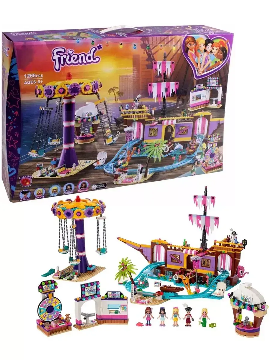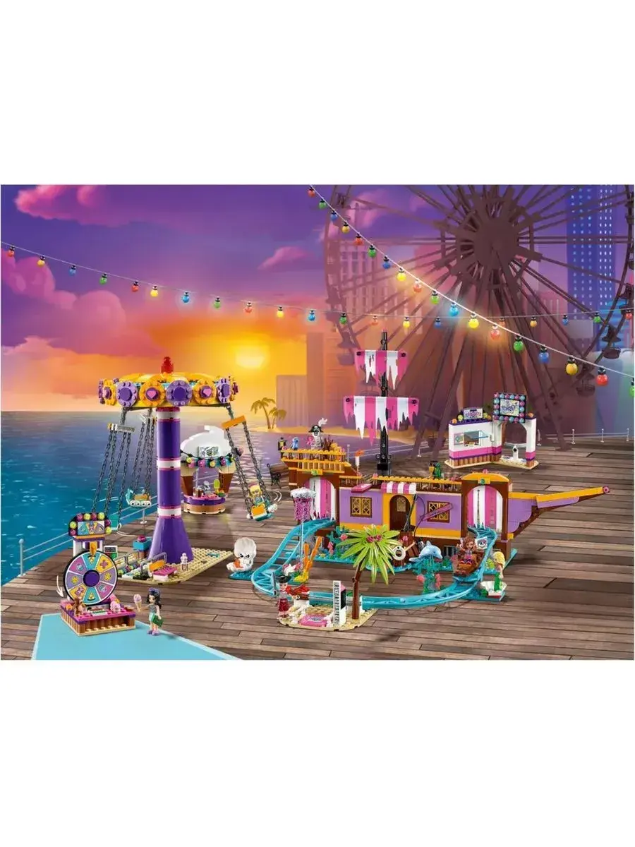 Конструктор «Френдс: Прибрежный парк развлечений» (1266 деталей) — это масштабный и яркий набор, который переносит ребёнка в волшебный мир веселья, аттракционов и морского настроения. Постройте собственный парк развлечений на берегу моря, наполненный красочными аттракционами, кафе, билетными кассами и элементами декора, чтобы героини могли весело проводить время в любое время года!