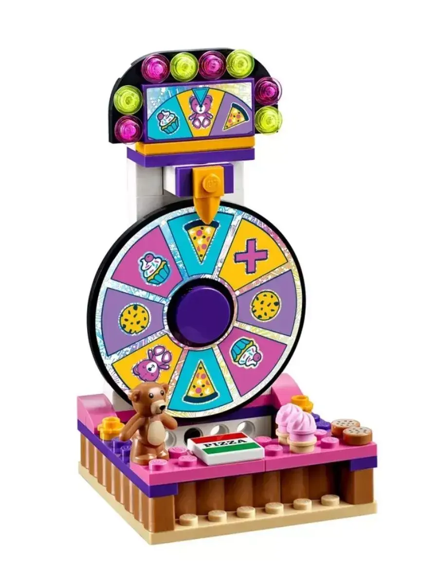 Набор включает в себя большой колесо обозрения, карусель, автомат с призами, стенд с едой, фотозону, арку с фонарями, фигурки персонажей «Френдс» и множество тематических аксессуаров: билеты, мороженое, напитки, воздушные шары, призы и сувениры. Всё это делает игру живой, насыщенной и увлекательной. Подвижные элементы, вращающиеся части и светлые цвета превращают процесс сборки в настоящее удовольствие.