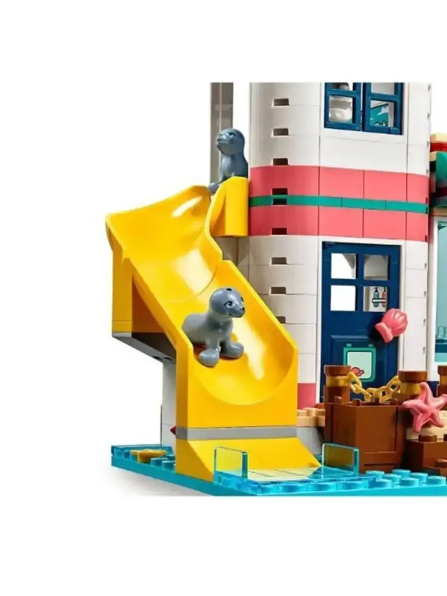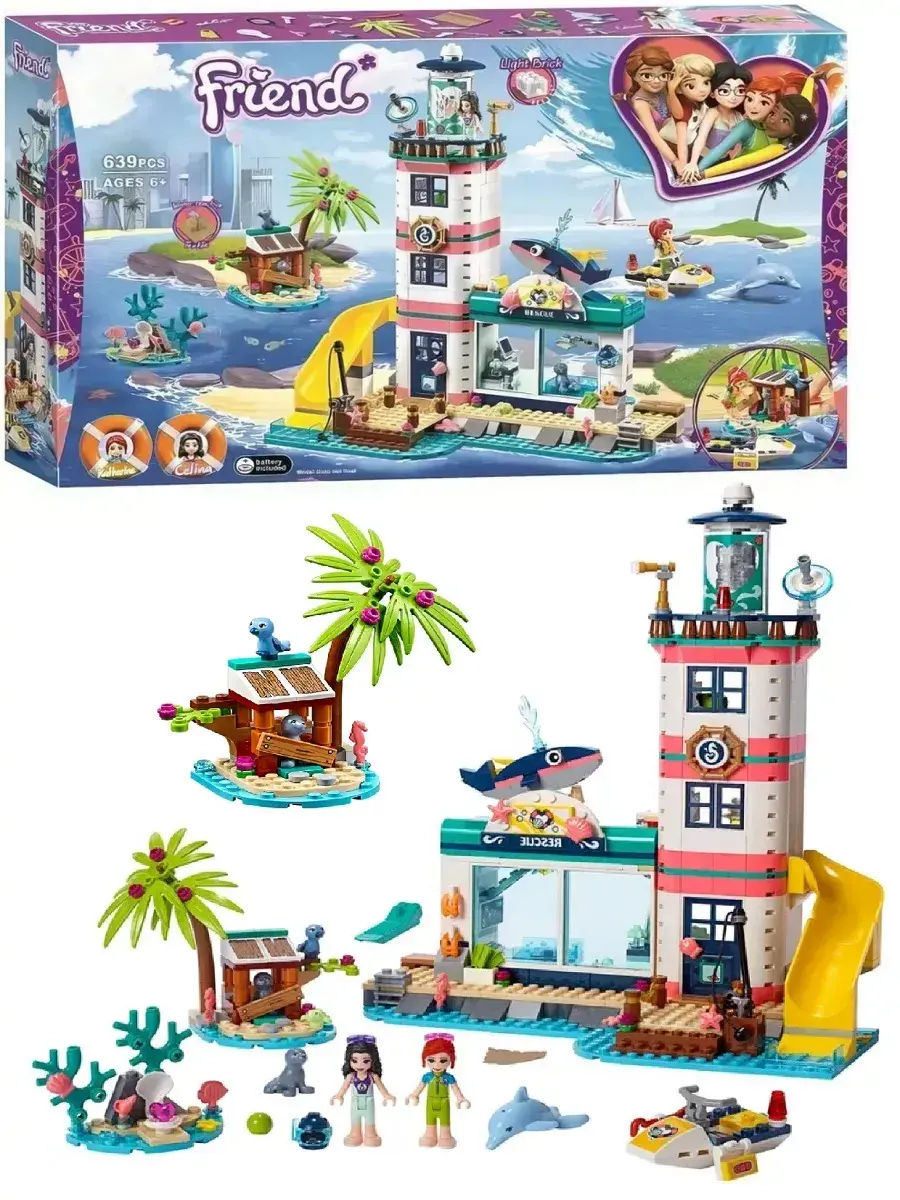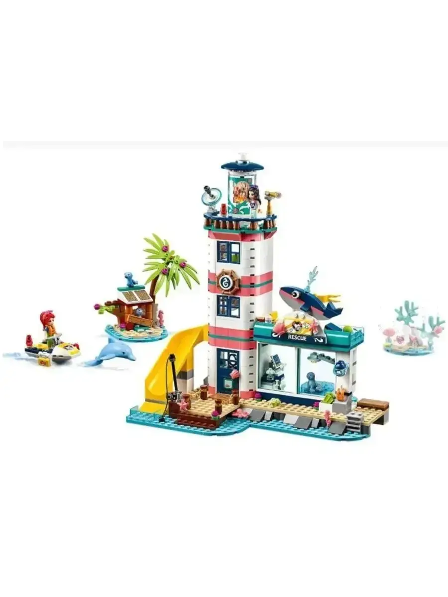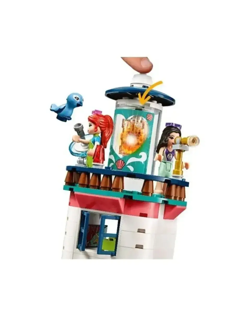 В комплект входят разнообразные детали для создания детализированного маяка с обзорной площадкой, спасательным постом, жилыми и техническими помещениями. Здесь есть всё необходимое для организации работы спасательного центра: оборудование, лодка для спасения, средства связи и аксессуары. В набор включены фигурки героев серии "Френдс", которые готовы прийти на помощь и совершать подвиги, помогая жителям города и туристам.