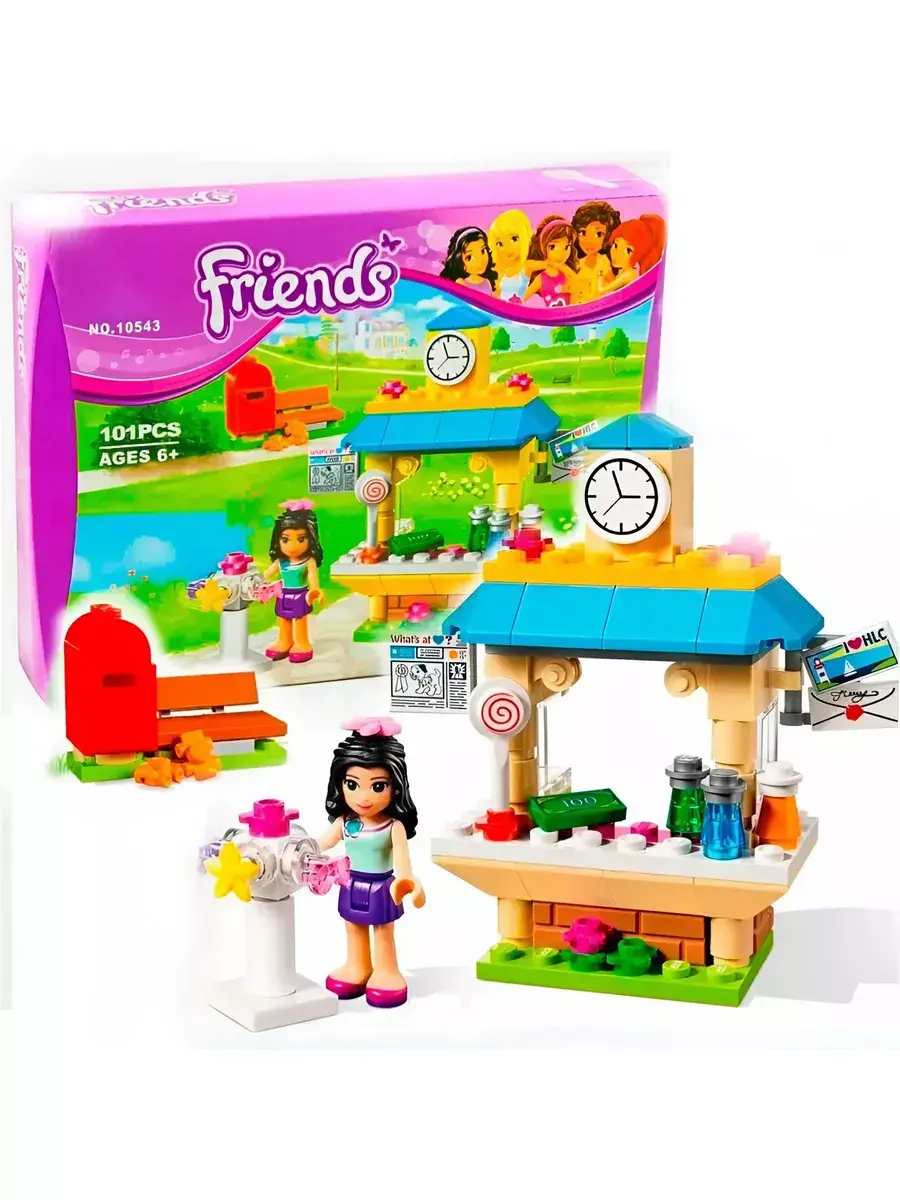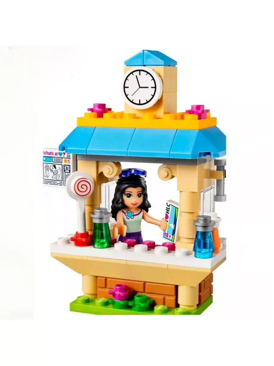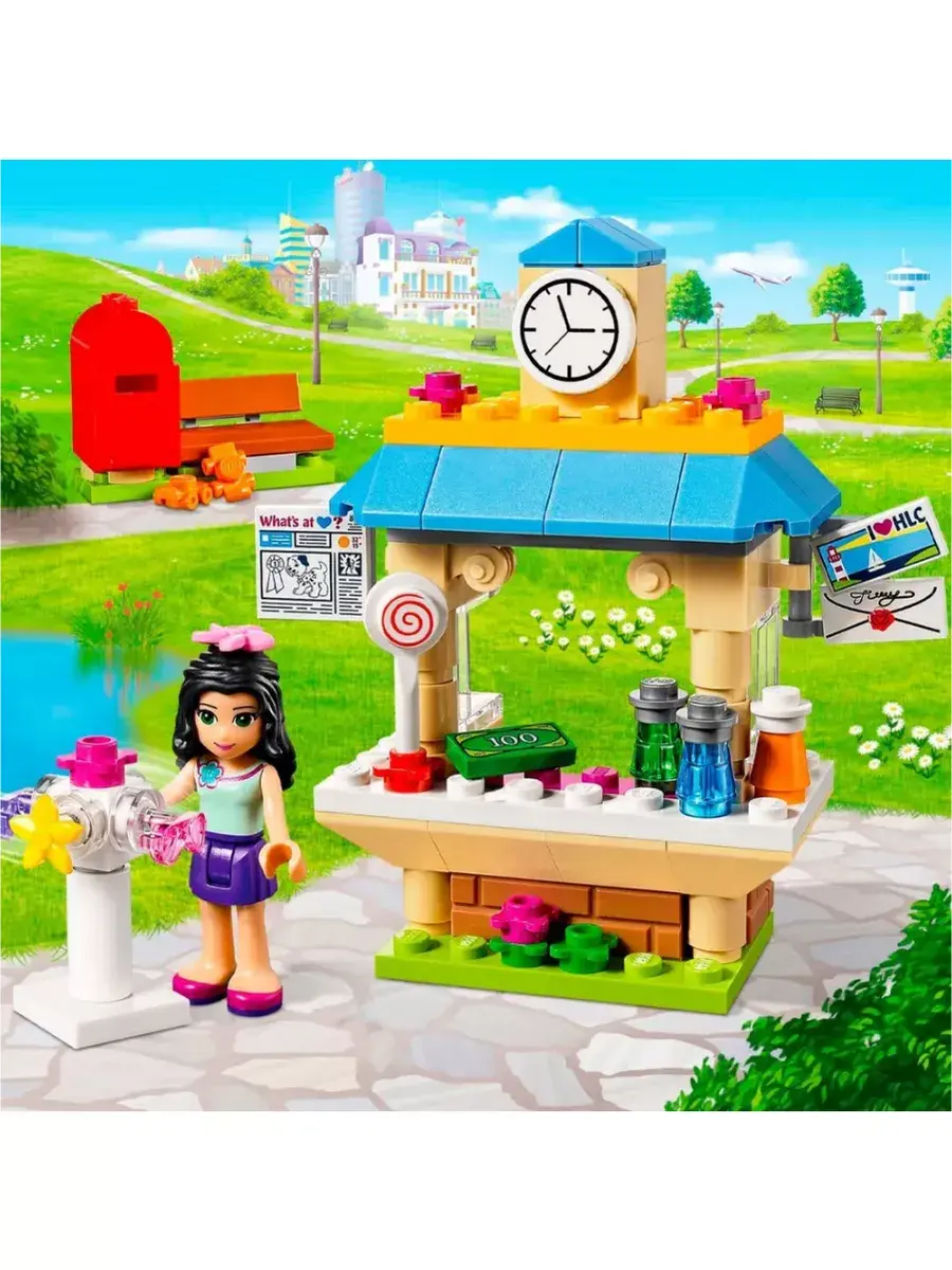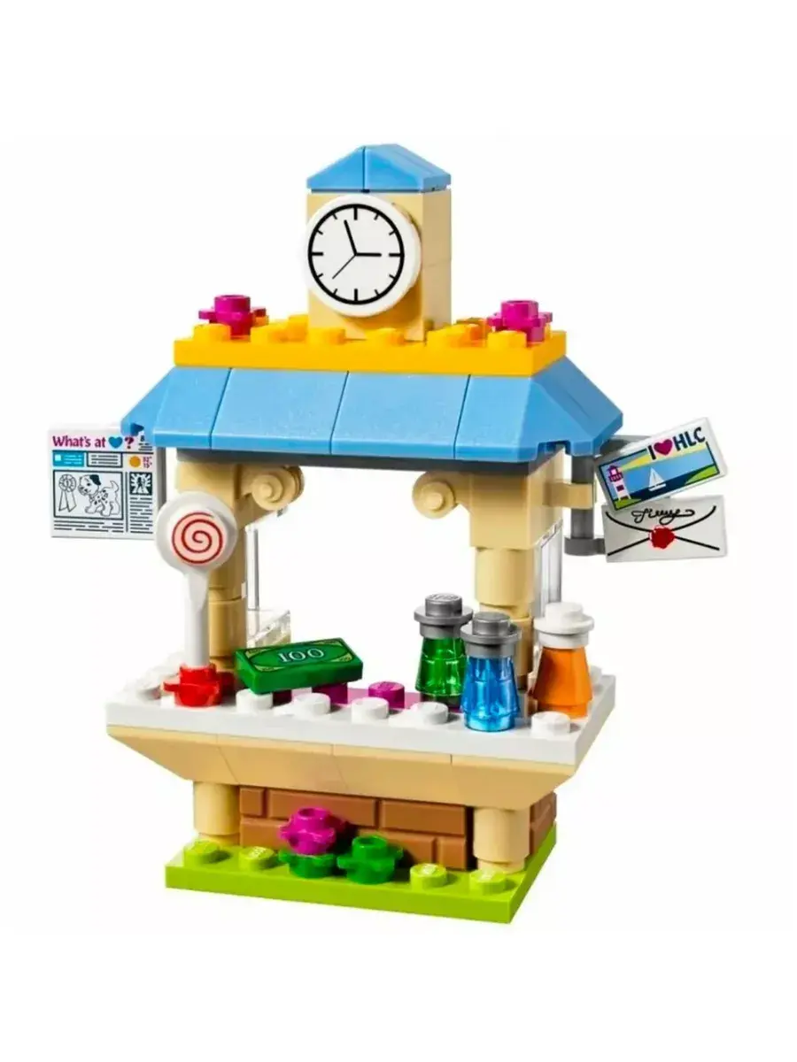 Конструктор представляет собой небольшой туристический киоск с бежевыми колоннами, оранжевой крышей и круглыми часами. Под голубым козырьком выставлены номера свежих газет, почтовые конверты и открытки с видами Хартлейк Сити.