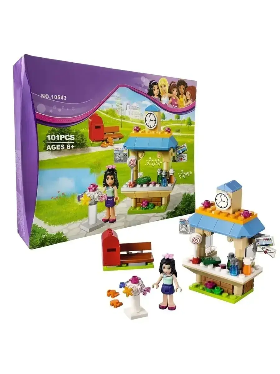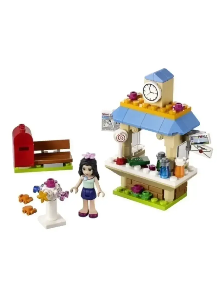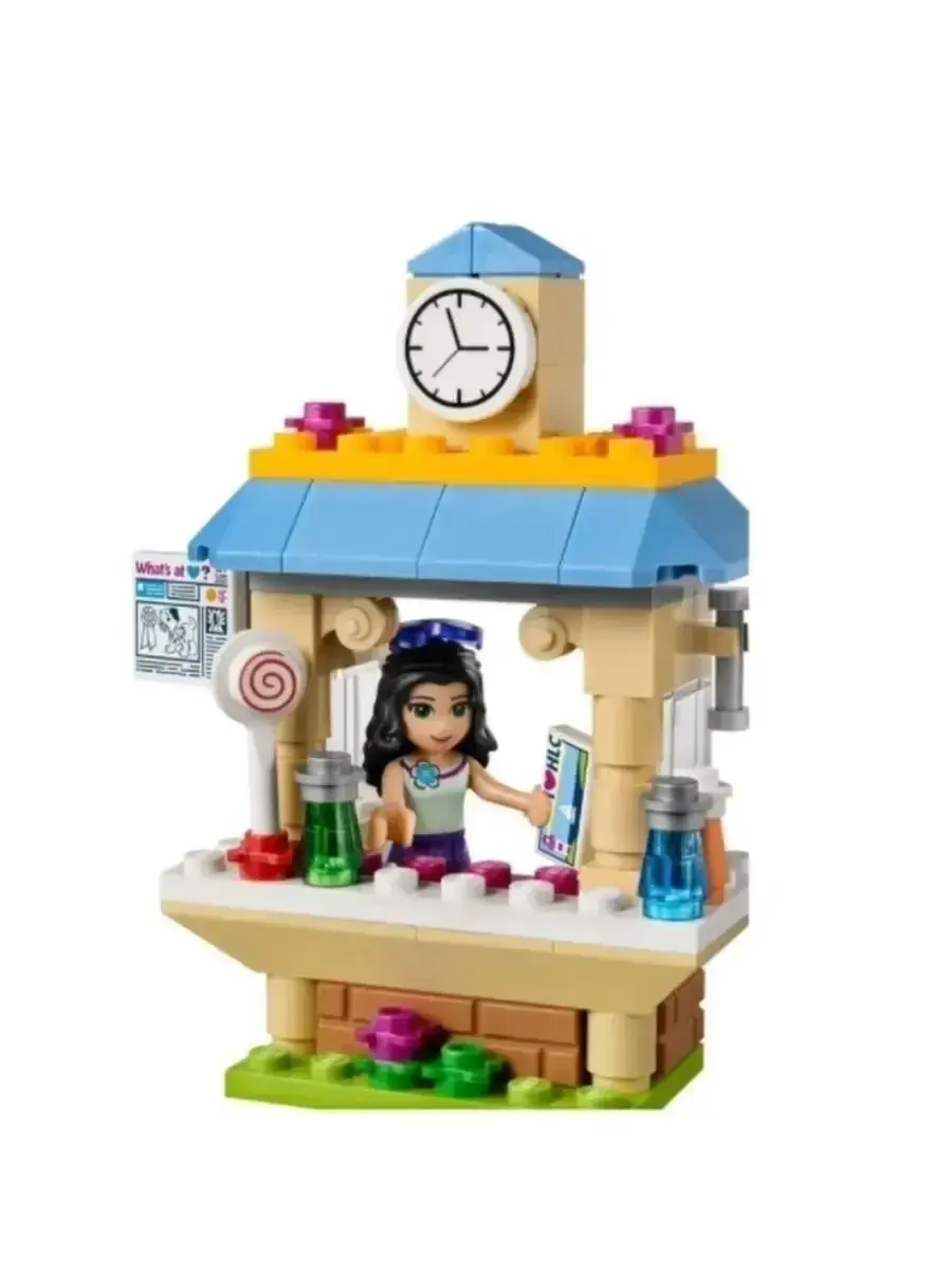 В комплект входят детали для сборки стильного туристического киоска с прилавком, полками и зонтиком, где Эмма и её друзья смогут продавать прохладительные напитки, закуски и сувениры. Набор включает фигурку Эммы и аксессуары, которые делают игру более реалистичной и интересной. С помощью этого конструктора ребёнок сможет разыгрывать различные игровые ситуации: встречать туристов, помогать им выбирать товары и создавать доброжелательную атмосферу.