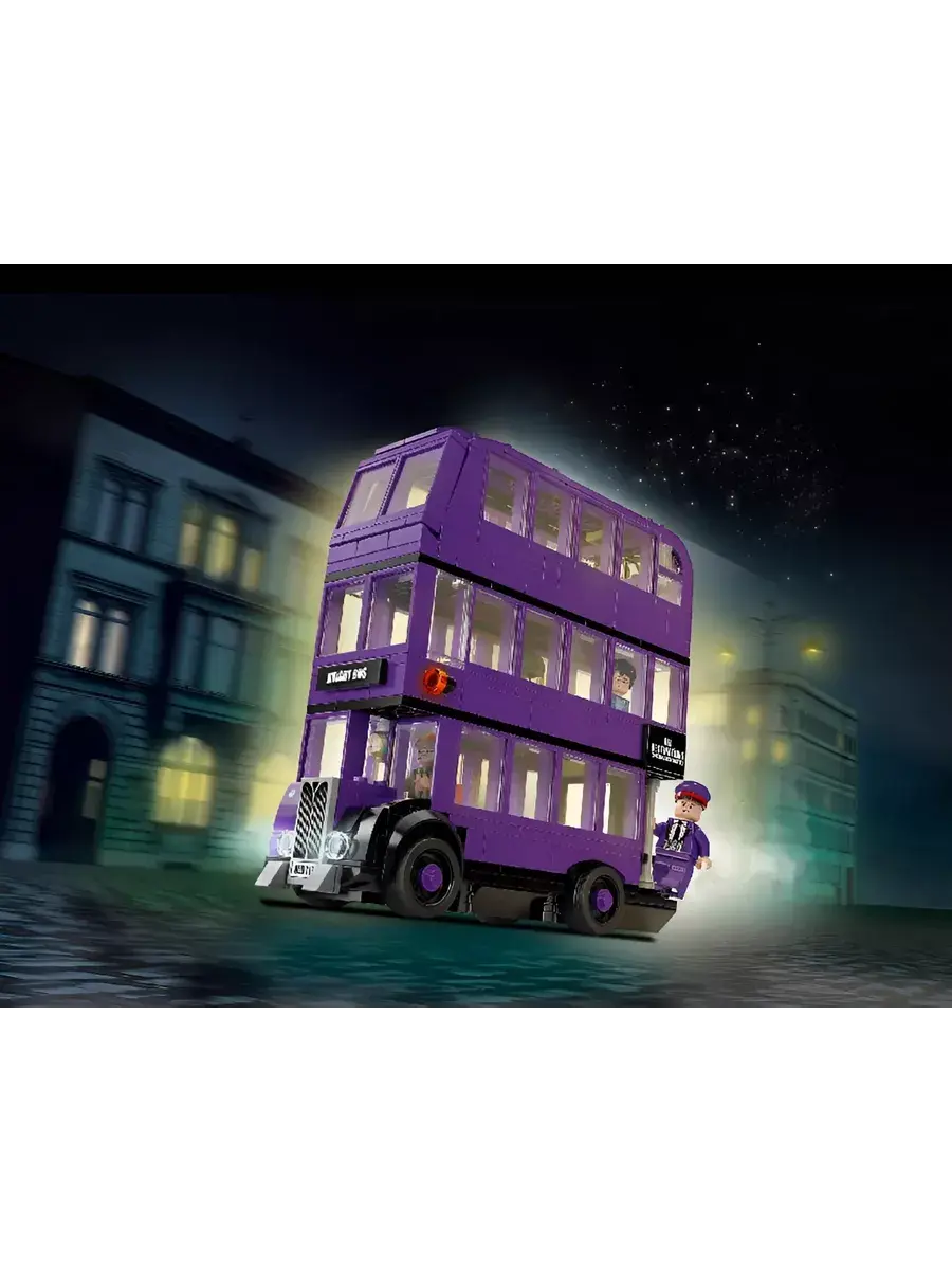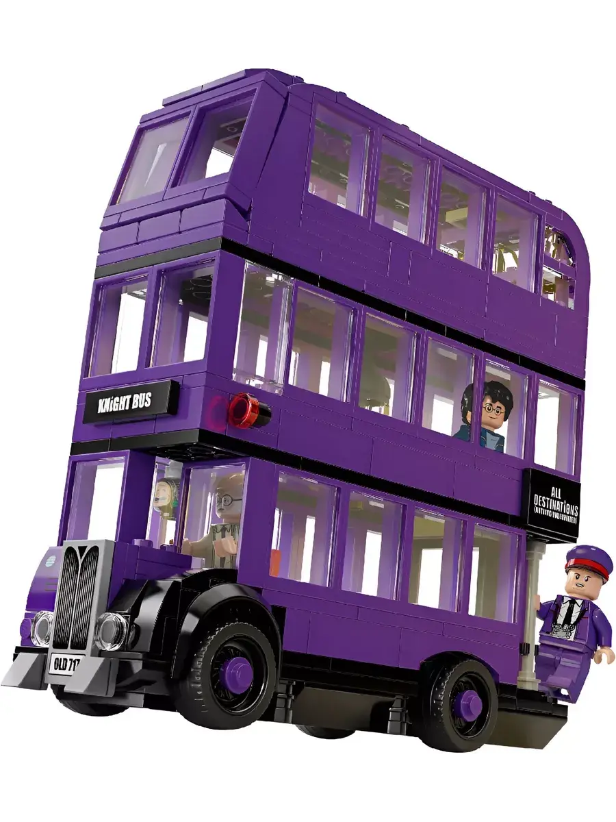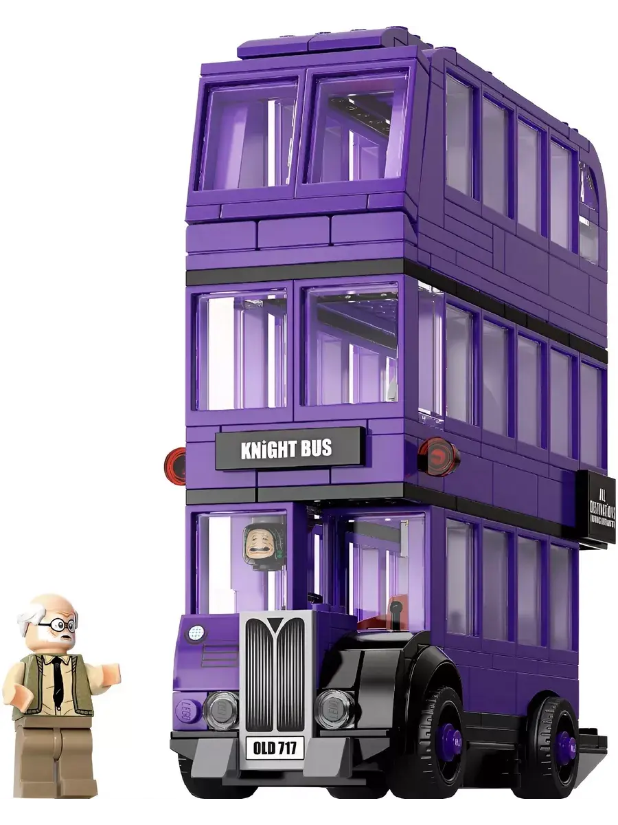 Автобус "Ночной рыцарь" выполнен в реалистичном дизайне, с открывающимися элементами и вращающимися колесами. В комплекте 403 детали, из которых можно собрать трехъярусный фиолетовый автобус.