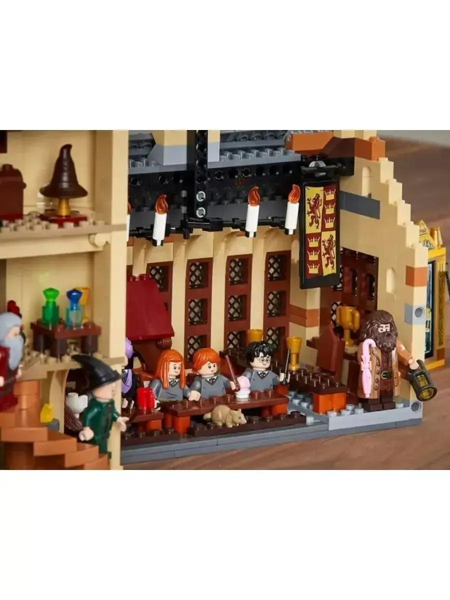 В комплект входят мини-фигурки Гарри Поттера, Гермионы, Рона и профессоров, а также множество аксессуаров — столы, стулья, факелы и волшебные свечи, парящие в воздухе. Особое внимание уделено деталям архитектуры: высокие окна с витражами, резные деревянные панели и знаменитый потолок, отражающий небо.