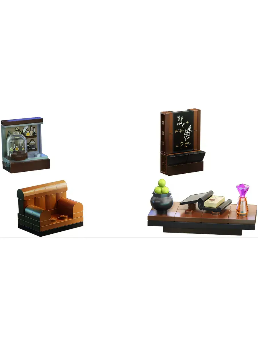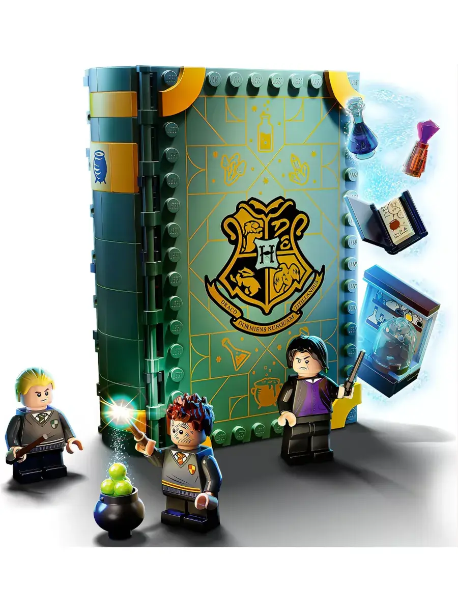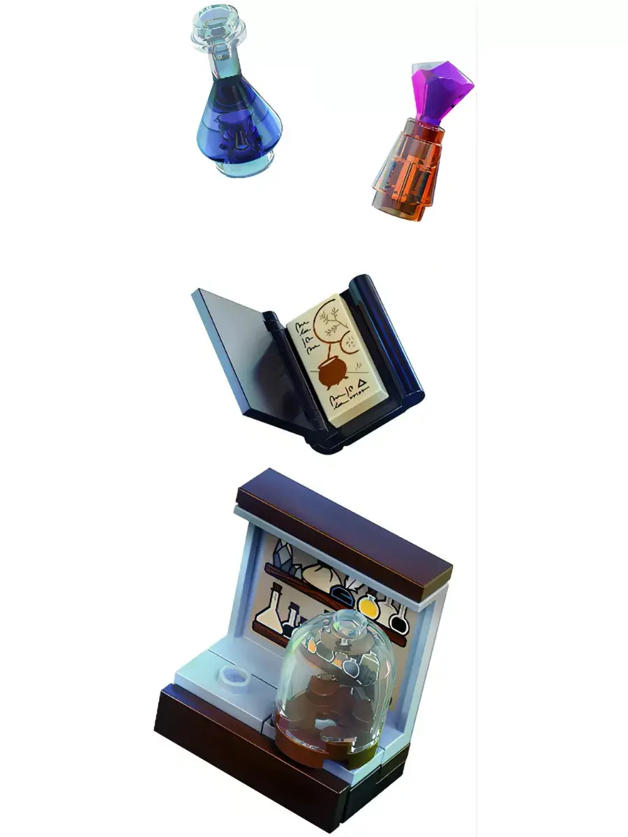 В набор входят более 300 тщательно проработанных деталей, включая мини-фигурки Гарри Поттера, профессора Снегга и других учеников. Книга-конструктор раскрывается, открывая страницы с тайными рецептами и полками с магическими ингредиентами — бутылочками, травами и зельями. Воссоздайте магическую атмосферу учебного класса, где каждая деталь продумана до мелочей.