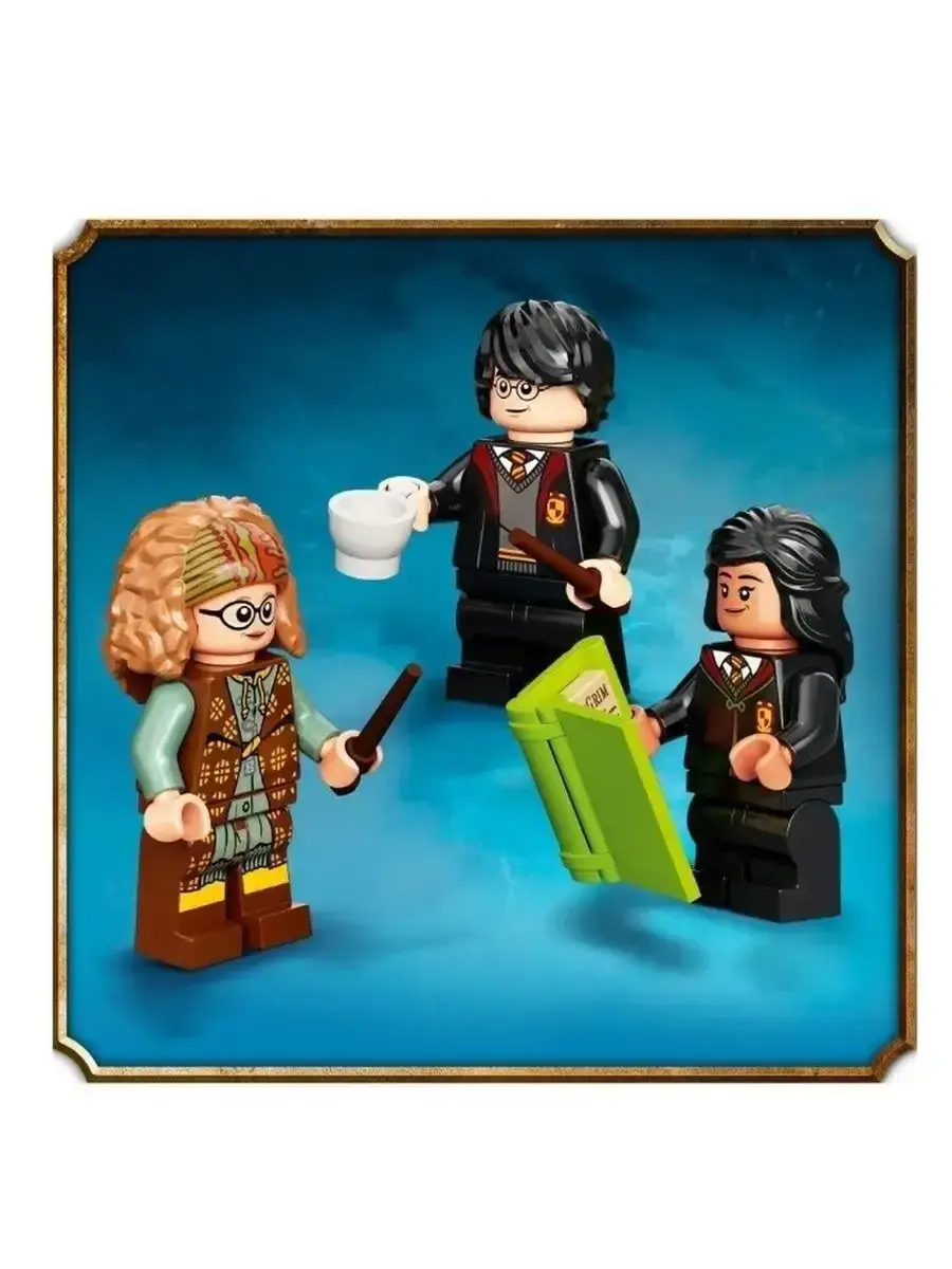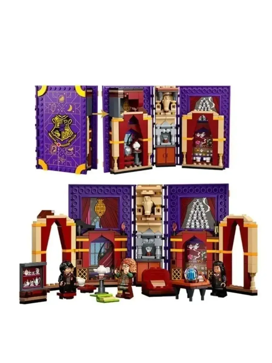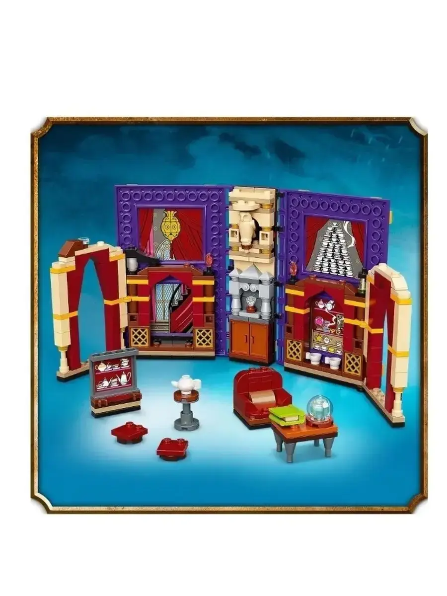 В комплект входят мини-фигурки Гарри Поттера, профессор Трелони и Патиль Парвати, а также множество тематических аксессуаров: кресла, столы, лампы, чайные чашки и другие элементы интерьера, придающие сцене аутентичность. Особенностью набора является складная конструкция: после игры его можно аккуратно сложить в виде волшебной книги с обложкой, стилизованной под учебник.