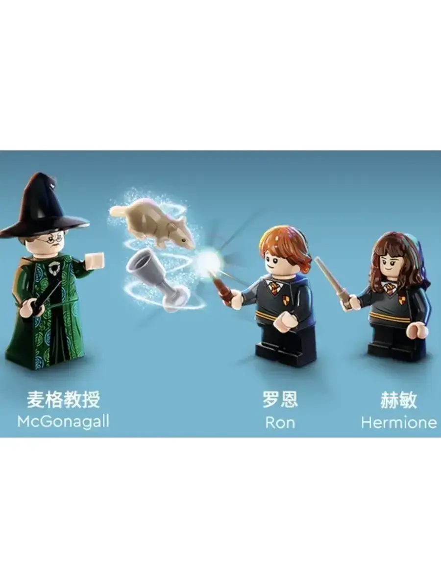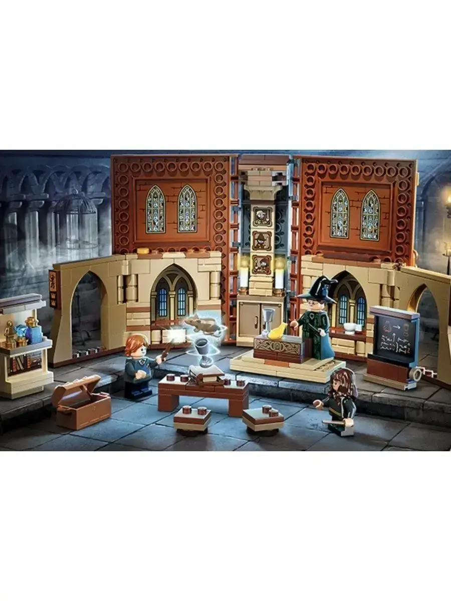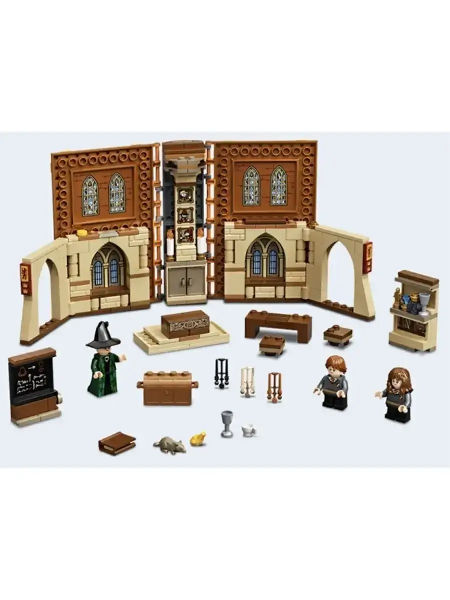 В комплект входят мини-фигурки Гермионы Грейнджер, Рона Уизли и профессора Макгонагалл, а также волшебные предметы: парты, учебники, магические палочки, шкаф с элементами трансфигурации и доска с заклинаниями. Благодаря складной конструкции набор удобно хранить и брать с собой. Детали легко соединяются, обеспечивая стабильную и прочную сборку, а пошаговая инструкция делает процесс понятным и увлекательным.