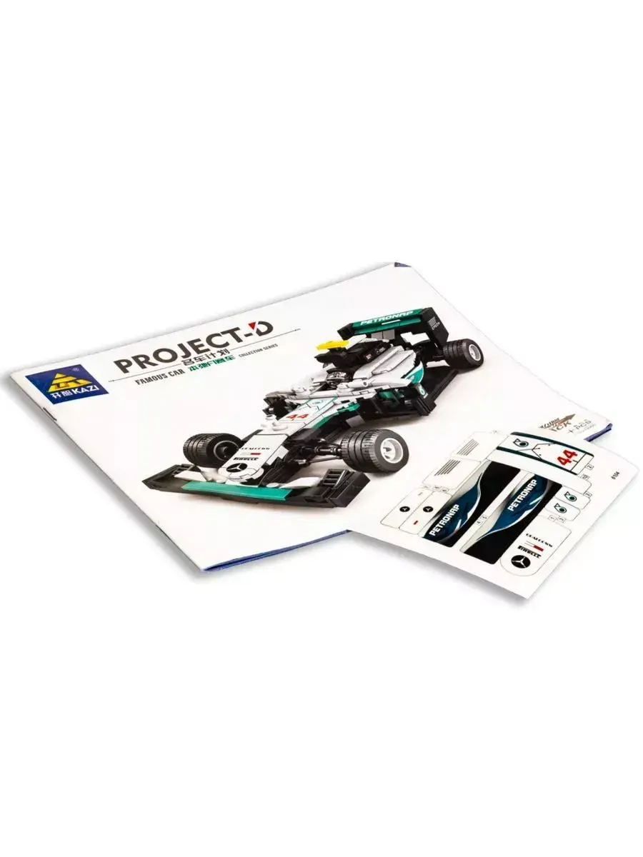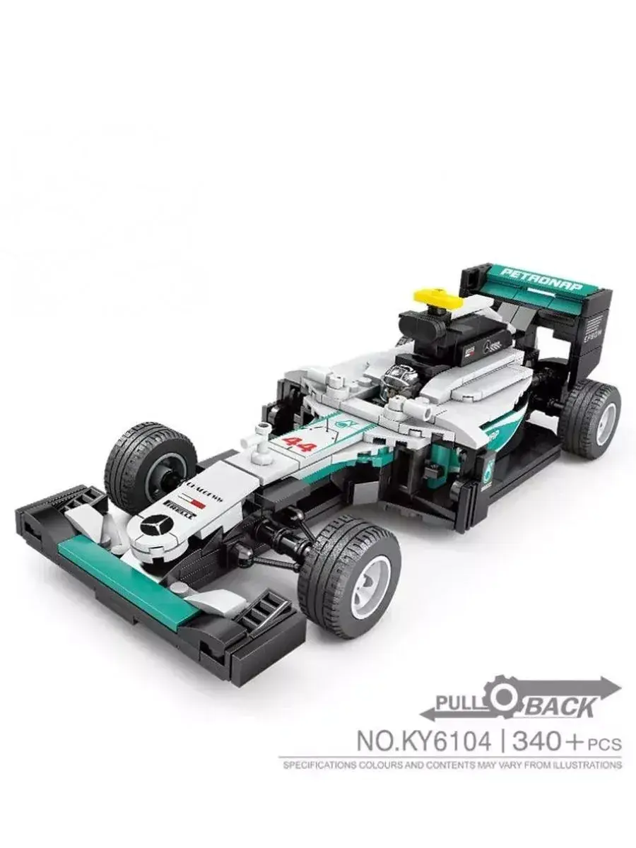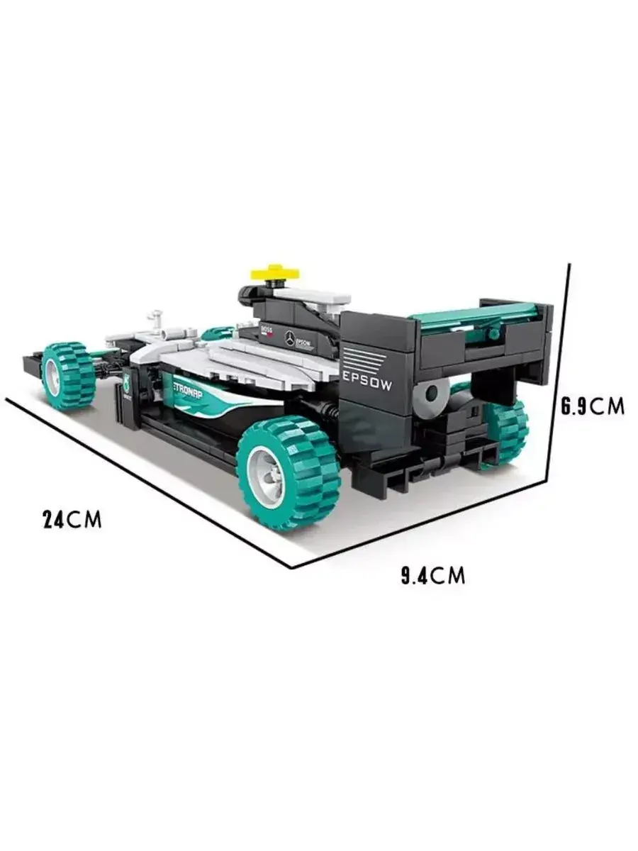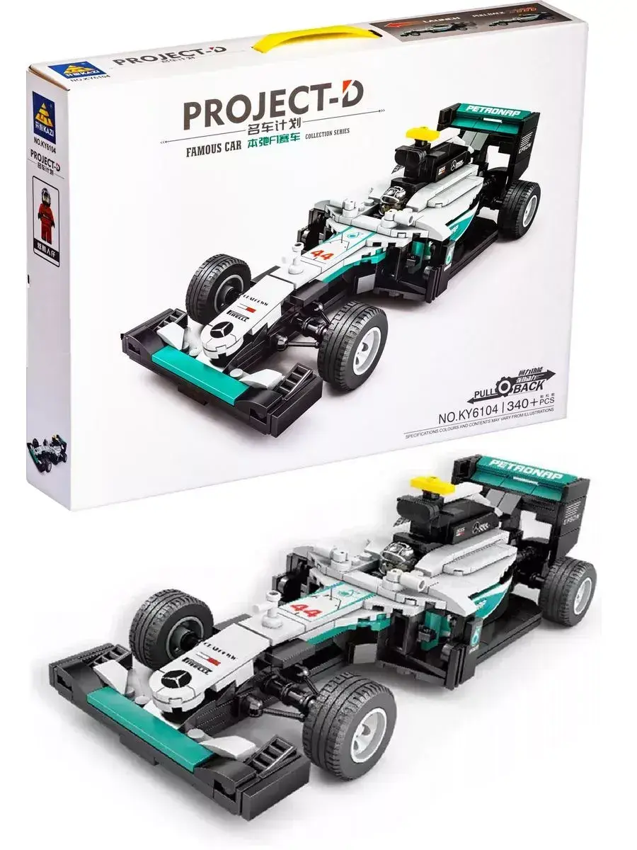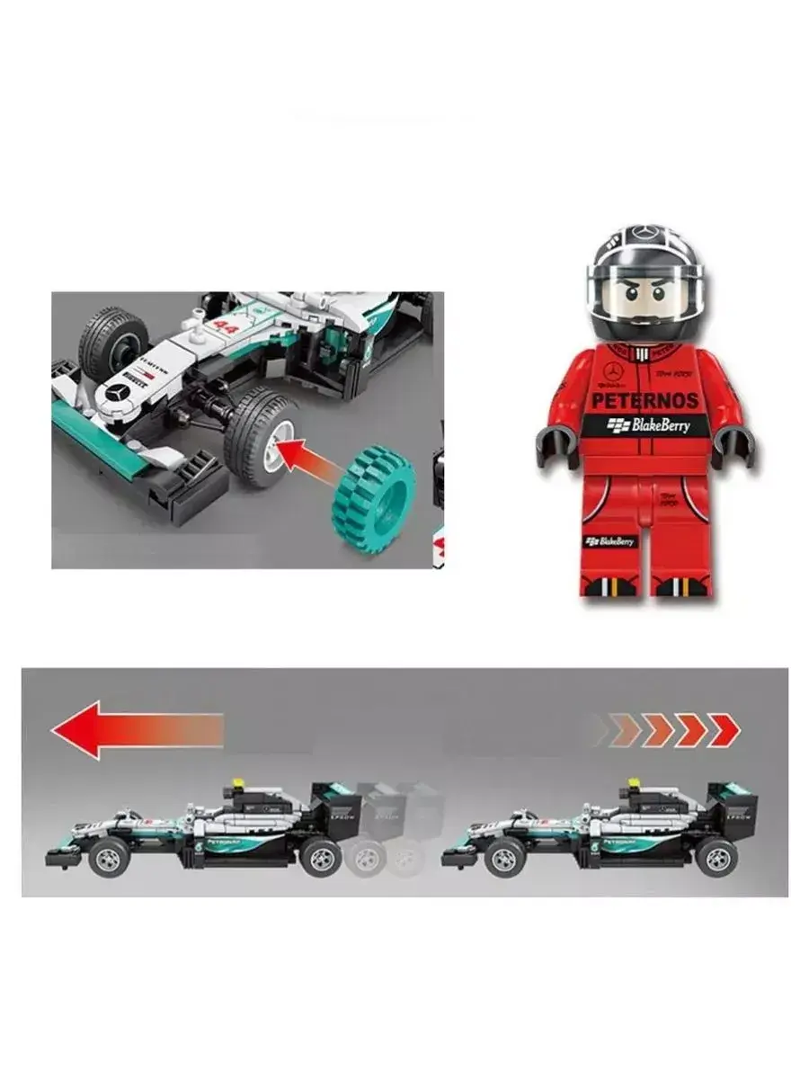 Модель гоночного болида создана в черно-белом цвете с широкой низкопрофильной резиной на белых литых дисках, резину можно менять с черной на бирюзовую. Усиленный кузов и передний бампер обеспечивают безопасность, а большой задний спойлер — отличную аэродинамику. Автомобиль оборудован инерционным двигателем «Pull Back — откати и отпусти», что позволяет создавать множество сюжетов из мира шоссейных автогонок и ралли. Отличный подарок для мальчиков доставит немало удовольствия как во время сборки и игры с минифигуркой гонщика, так и украшая выставочную полку. В набор входит минифигурка персонажа: гонщик в шлеме.