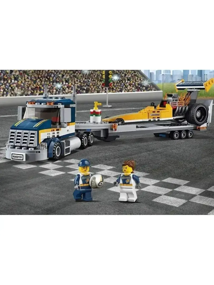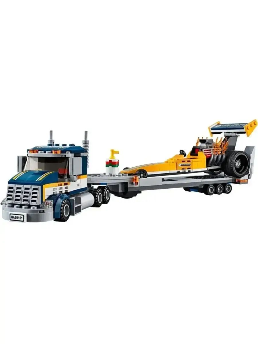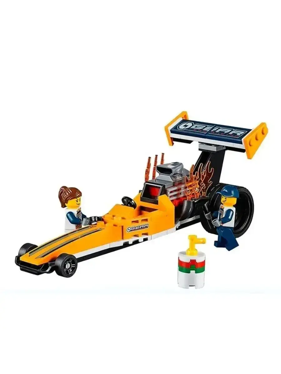 Драгстер представляет собой супермощный автомобиль, предназначенный для участия в соревнованиях на скорость. Его главной задачей является преодоление гоночной трассы максимально быстро.Размер драгстера в собранном виде составляет 8х21х6 смПогрузите драгстер на транспортировочный грузовик (8х14х5 см). Его кабина оборудована множеством реалистичных деталей, таких как прозрачные фары, усиленная радиаторная решётка, сигнальные огни, боковые зеркала, топливный бак и выхлопные трубы.Сзади предусмотрен надёжный крепёж, обеспечивающий соединение с мобильной платформой (29х5х2 см).Припаркуйтесь и подготовьте автомобиль к гонке. Затяните болты и заполните бак горючим из бочки. Потом залезайте на водительское сиденье и поезжайте к стартовой черте. Когда загорится зеленый свет, жмите на газ и вперед! можете собрать транспортировочный грузовик (8х14х5 см). Сзади предусмотрен надёжный крепёж, обеспечивающий соединение с мобильной платформой (29х5х2 см). Её конструкция разделена на два уровня. Наверху можно перевозить техническое оборудование и топливо, а внизу – драгстер.