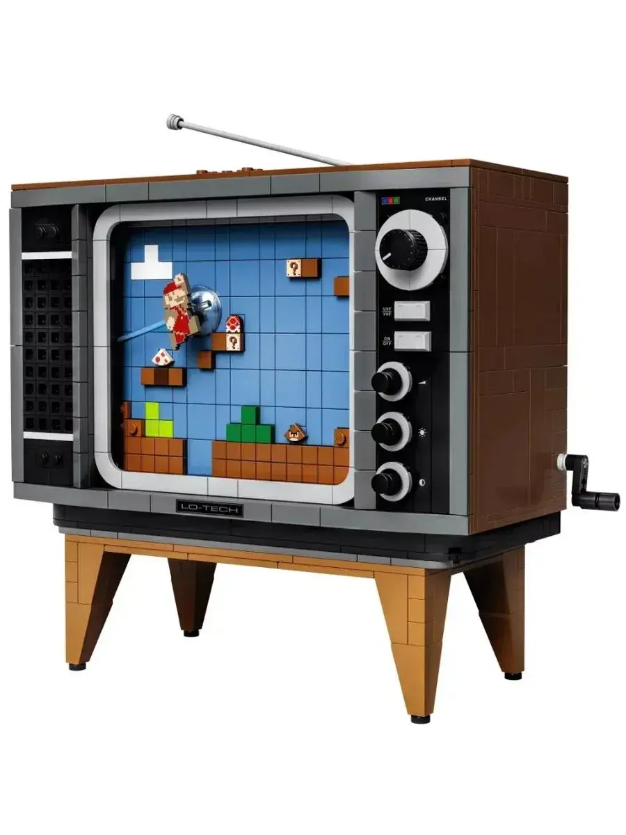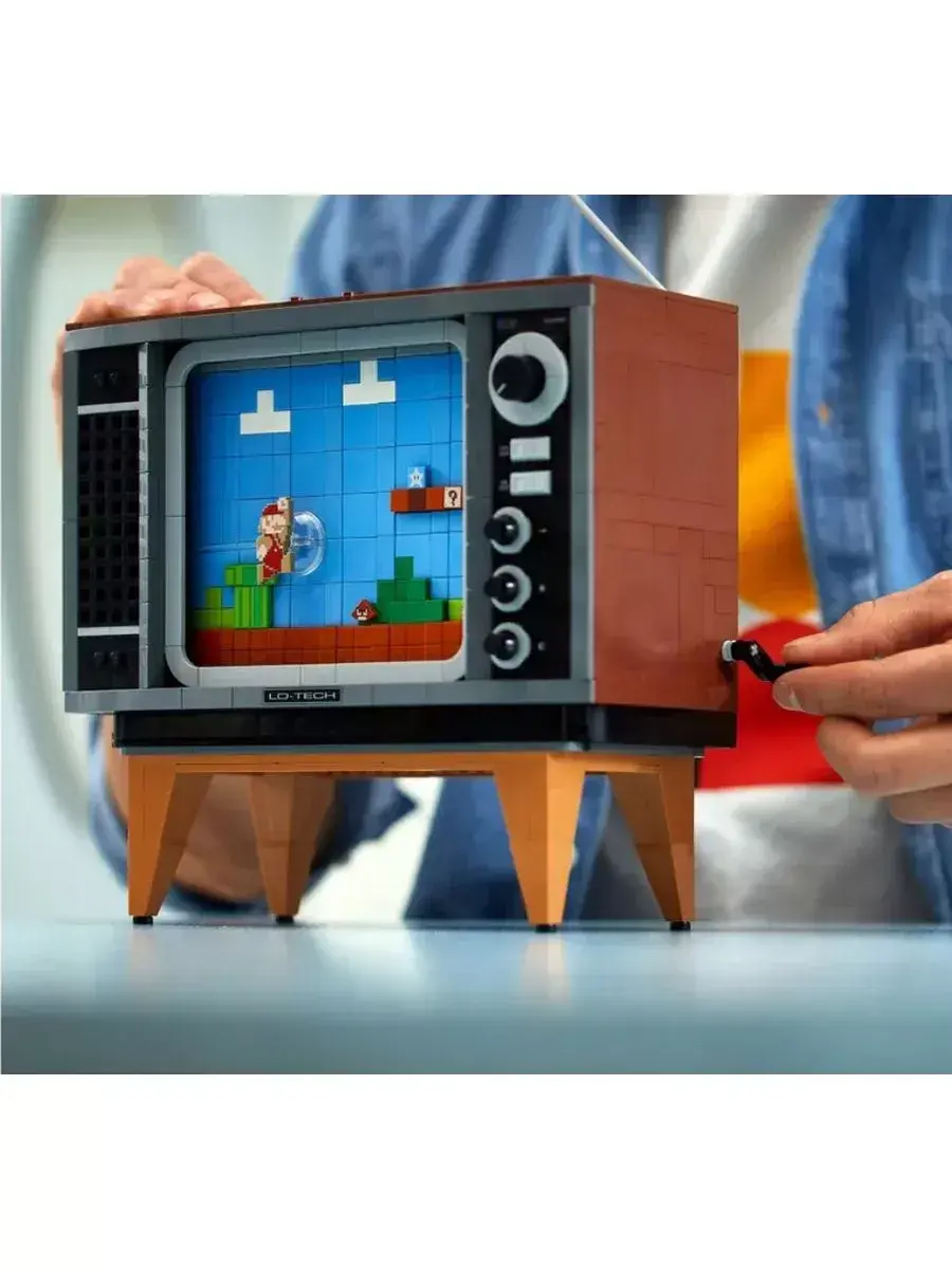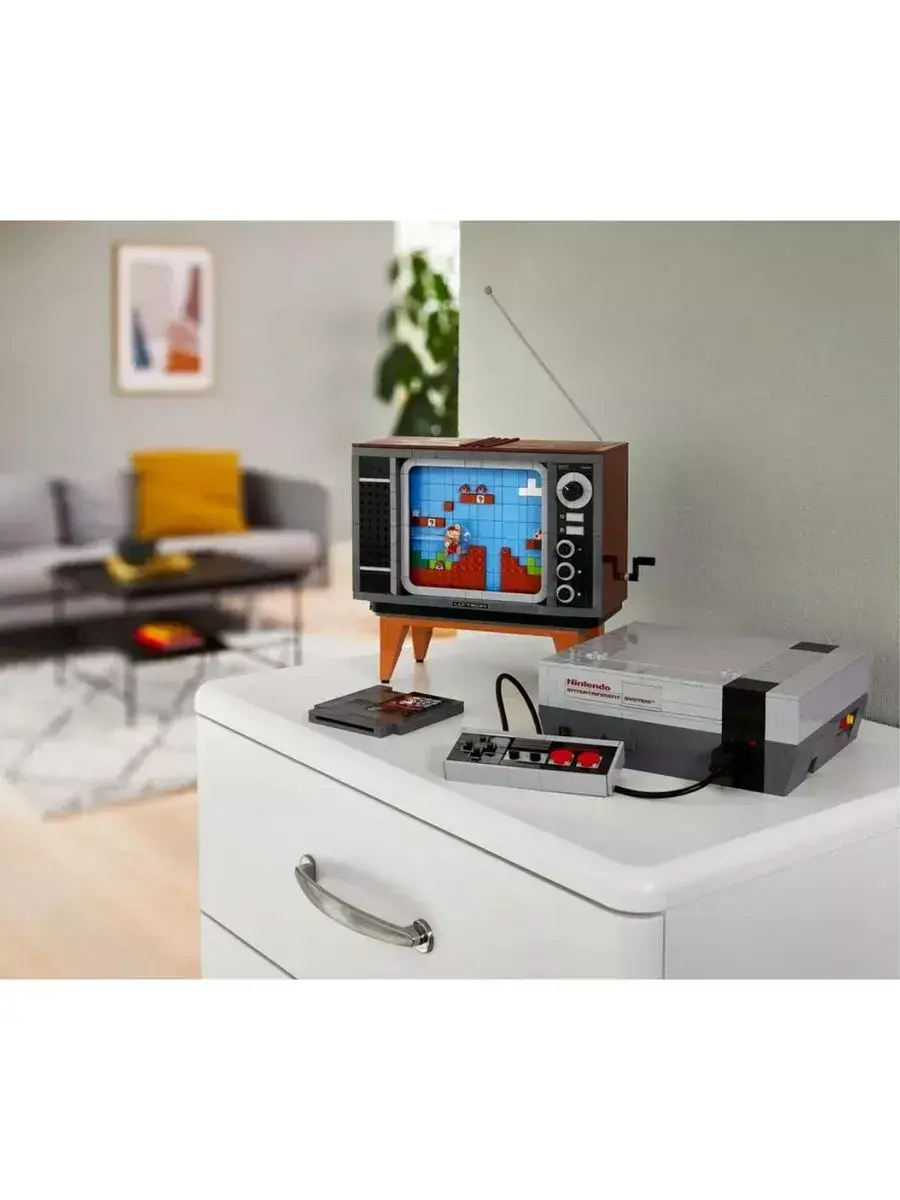 Реальные детали консоли NES, включая контроллер и открытый слот для сборки игровых наборов. Телевизор оснащен экраном с прокруткой, управляемым ручкой, а кукла Марио реагирует на врагов, препятствия и силы на экране вверху. Необходимо использовать в сочетании с наборами Mario во вводном курсе Super Mario Adventure для активации интерактивных функций набора. Поклонники Super Mario Bros будут довольны наличием кабелей и разъемов, подключаемых к NES, вращающимися ручками переключения каналов и реалистичными функциями блокировки. Размер этого сборного телевизора составляет 22,5 см в высоту, 23,5 см в ширину и 16 см в глубину. Он используется с моделью NES для создания классных дисплеев.