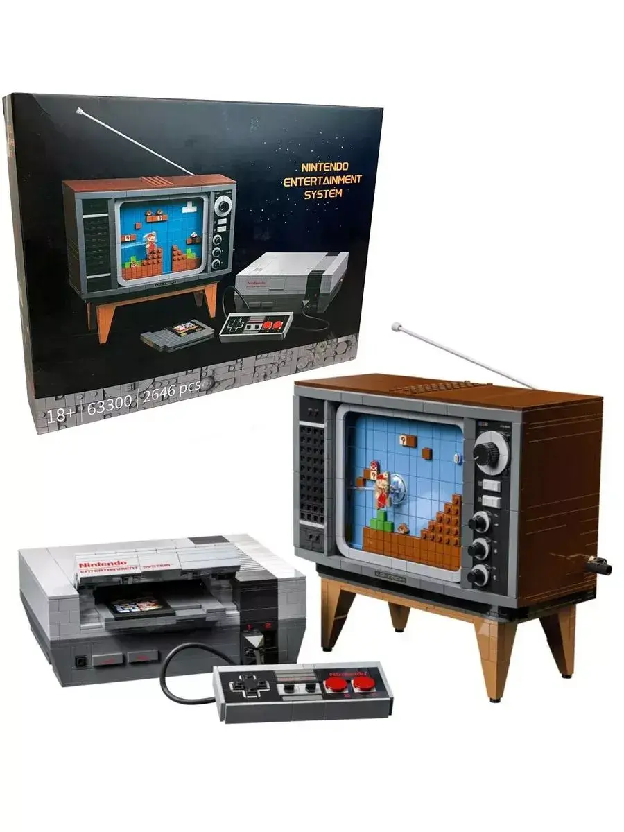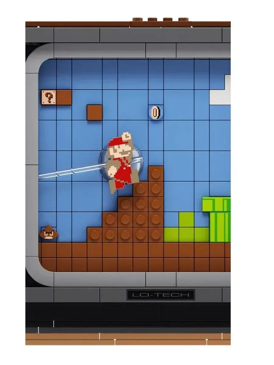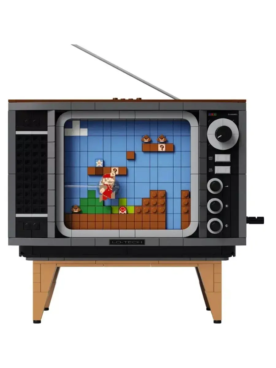 Реальные детали консоли NES, включая контроллер и открытый слот для сборки игровых наборов. Телевизор оснащен экраном с прокруткой, управляемым ручкой, а кукла Марио реагирует на врагов, препятствия и силы на экране вверху. Необходимо использовать в сочетании с наборами Mario во вводном курсе Super Mario Adventure для активации интерактивных функций набора. Поклонники Super Mario Bros будут довольны наличием кабелей и разъемов, подключаемых к NES, вращающимися ручками переключения каналов и реалистичными функциями блокировки. Размер этого сборного телевизора составляет 22,5 см в высоту, 23,5 см в ширину и 16 см в глубину. Он используется с моделью NES для создания классных дисплеев.