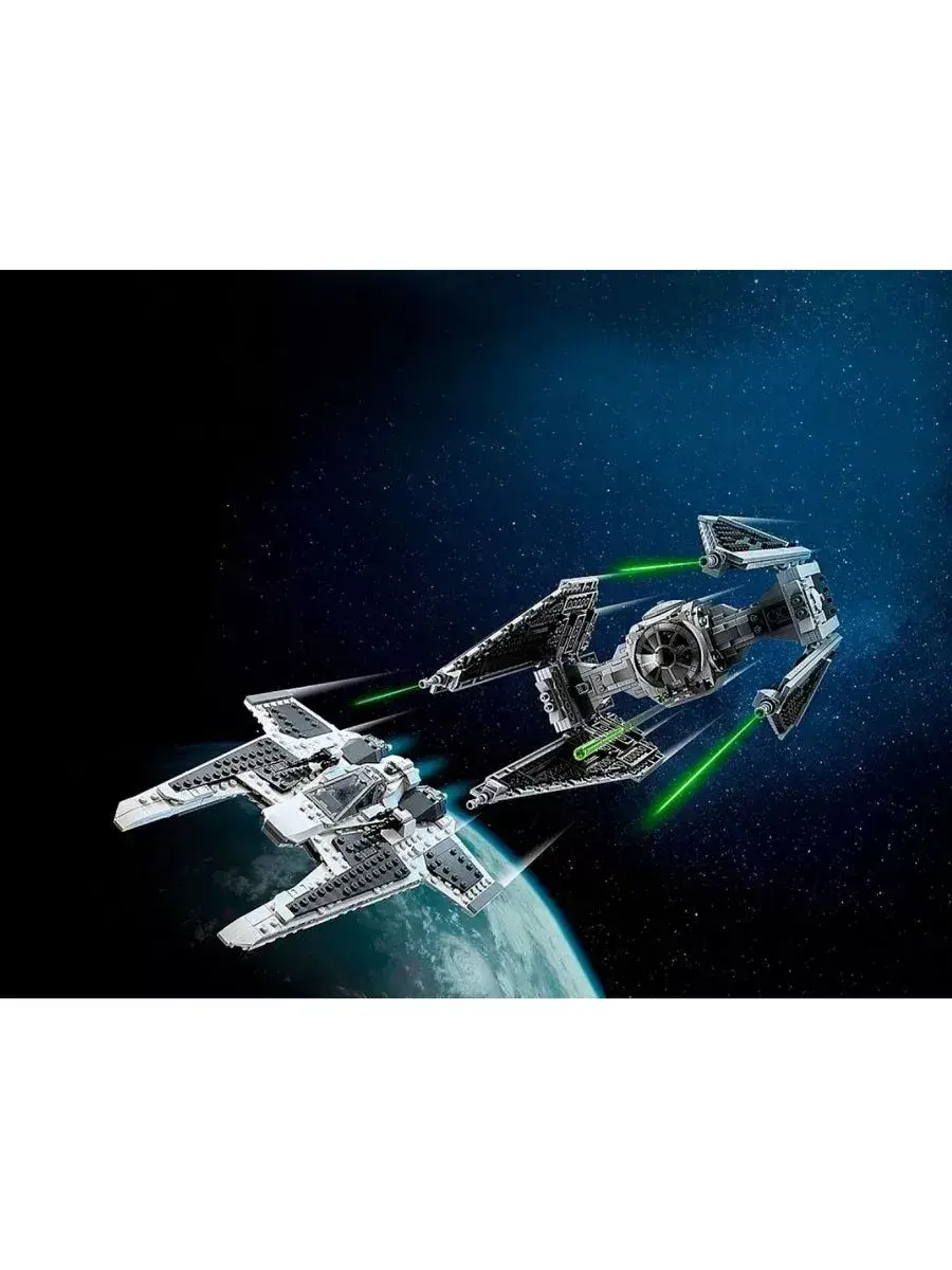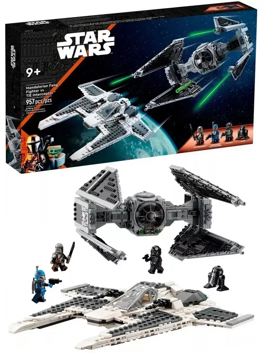 Конструктор Star Wars Mandalorian Fang Fighter vs. TIE Interceptor Истребитель типа «Клык» против перехватичка СИД 957 деталей. С этим сборным набором дети могут разыгрывать битвы между мандалорским истребителем типа Клык и перехватчиком СИД. В нем представлены истребитель типа Клык, дебютировавший в третьем сезоне популярного сериала Disney, и классический TIE-перехватчик. У каждого есть открывающаяся кабина для минифигурки и 2 подпружиненных шутера, а у Клыка еще и отсек для хранения оружия. Отличный подарок для детей от 9 лет. Набор также включает в себя 3 минифигурки с оружием, в том числе мандалорца с темным мечом.