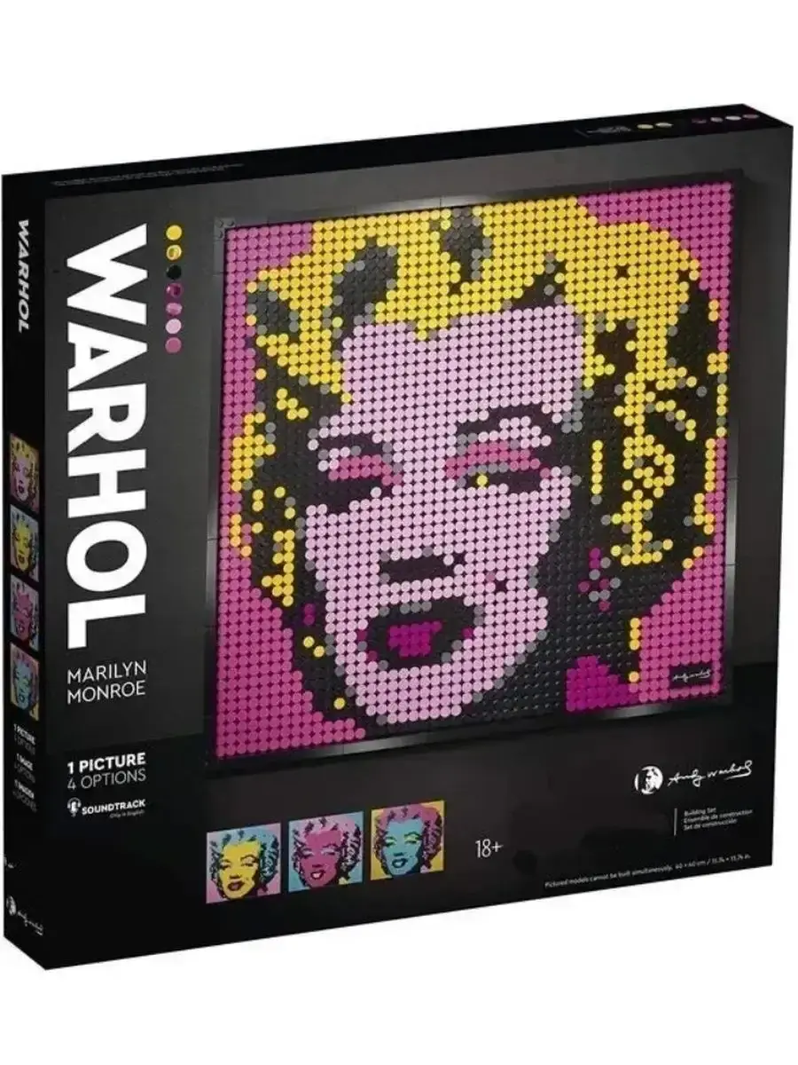 Ты когда-нибудь мечтал воссоздать картину Энди Уорхола? Теперь ты можешь собрать собственную копию этого легендарного портрета Мэрилин Монро в ярком розовом цвете или создать другой портрет в совершенно новых цветах. Собирая эту модель и слушая подкаст, входящий в набор, ты узнаешь неожиданные подробности жизни Энди Уорхола и Мерилин Монро. Когда портрет будет готов, добавь к нему эксклюзивную плитку с подписью и повесь картину на стену или поставь её на полку. Вы сможете собрать этот набор Мэрилин Монро Энди Уорхола, включающий в себя детали для сборки четырёх различных вариантов этой легендарной картины. Вы отлично проведёте время, конструируя модель, и затем сможете повесить готовую работу на стену. Размеры модели: чуть более 40 х 40 см
