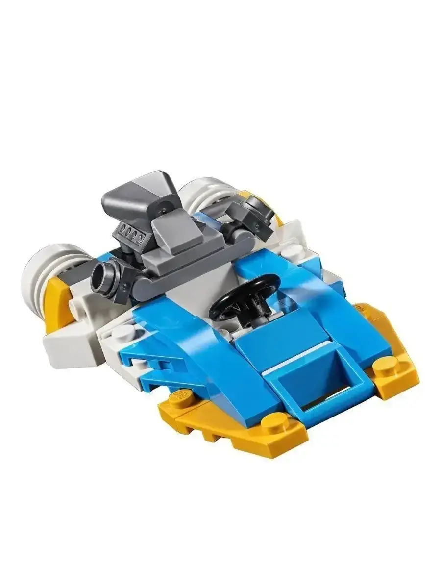 Подарок в каждом конструкторе! Для участия в скоростных заездах Вам понадобится самый мощный и маневренный гоночный автомобиль. Его главной задачей будет не только прохождение всех виражей трассы, но и опережение других, не менее быстрых соперников. Если всё пройдёт удачно, то победа будет обеспечена, и высшая ступень пьедестала почёта будет принадлежать только Вам. Вперёд! В наборе Вы найдёте модель гоночного болида. Его корпус выполнен в бело-голубом цвете с добавлением контрастных жёлтых полос. Центральное место в конструкции занимает открытая кабина. Она оборудована нишей для гонщика, рулевым управлением и боковыми зеркалами. Перед кабиной виден удлинённый носовой обтекатель. Его главной функцией является снижение внешнего сопротивления, и как следствие повышение скоростных характеристик. Задняя часть машины прекрасно детализирована. Здесь установлен мощный четырехцилиндровый двигатель с воздухозаборником и угловатый спойлер, помогающий болиду лучше входить в повороты и разгоняться на прямых участках. Отдельного внимания заслуживают колёса автомобиля. Они снабжены низкопрофильными шинами, обеспечивающими максимальное сцепление с трассой. Размер гоночного болида составляет 4х15х6 см. При желании его можно переделать в гоночный автомобиль (4х9х6 см) или быстроходный катер (6х9х6 см).