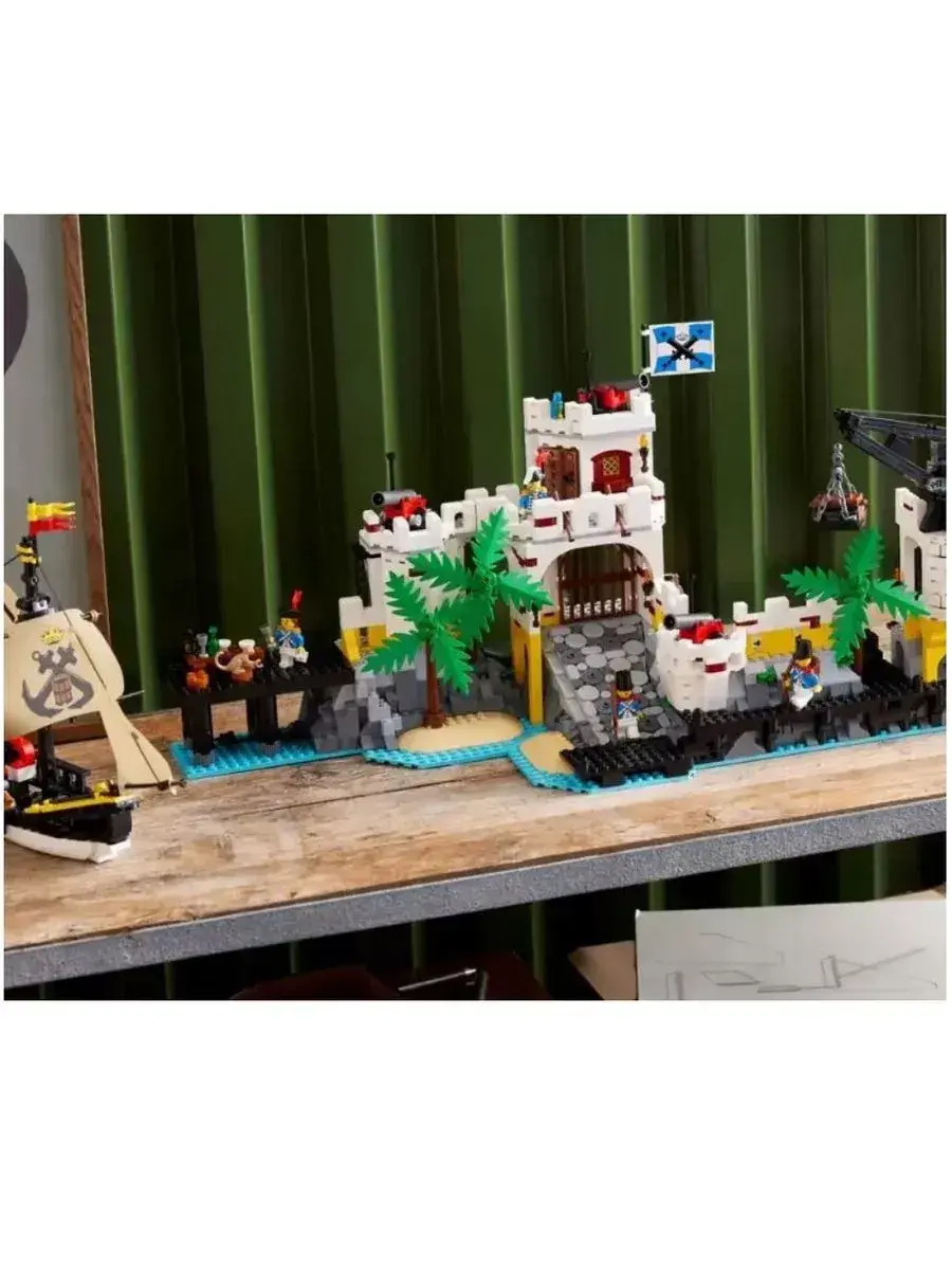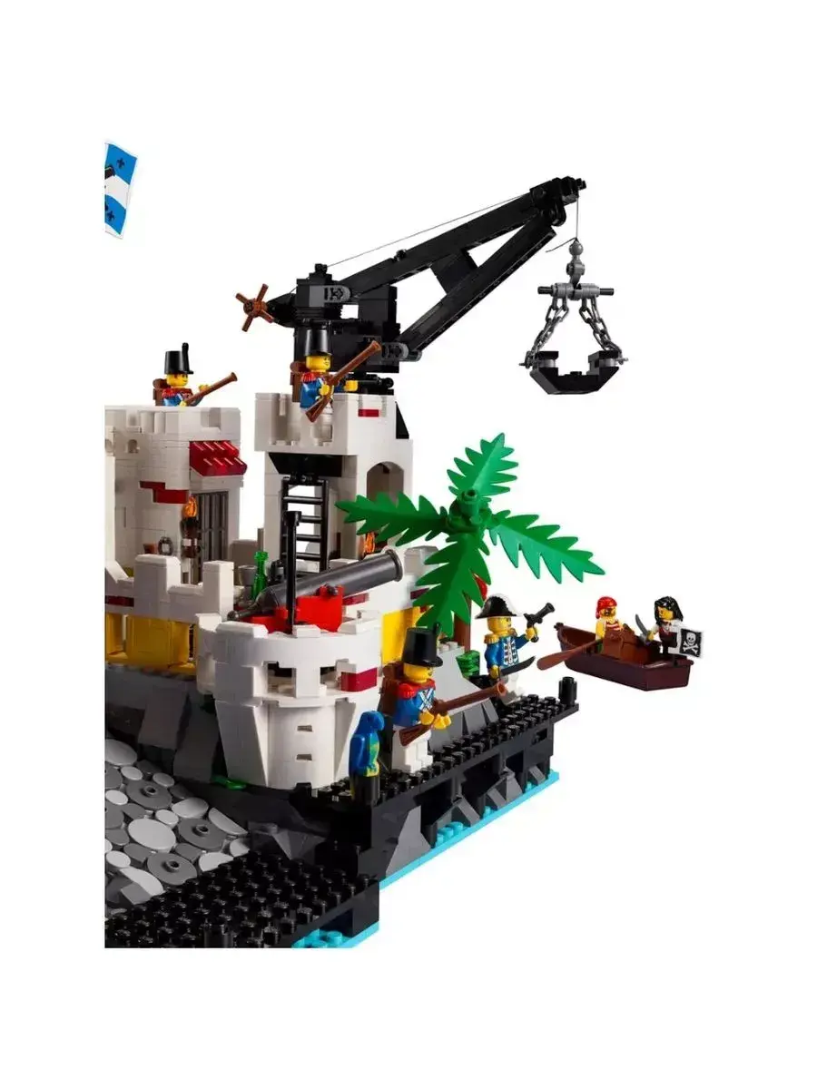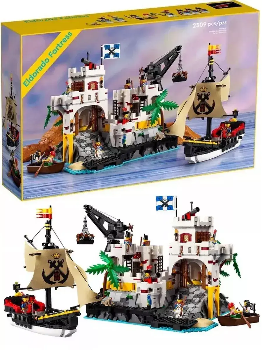 Окунись в атмосферу пиратских наборов 80-х годов прошлого века с конструктором Крепость Эльдорадо. Это целый гигантский форт, возведенный в виде прибрежной крепости. Здесь есть множество детализированных комнат, наполненных ящиками и различной бытовой утварью. У форта даже есть подъемный кран. Швартуй свой пиратский корабль и грузи награбленное золото, только не забудь, что у крепости Эльдорадо есть вооруженная охрана, которую ты можешь обойти на шлюпке. В наборе 6 имперских солдат и двое пиратов. Размеры — форт (в открытой конфигурации) имеет высоту более 27 см, ширину 70 см и глубину 24 см.