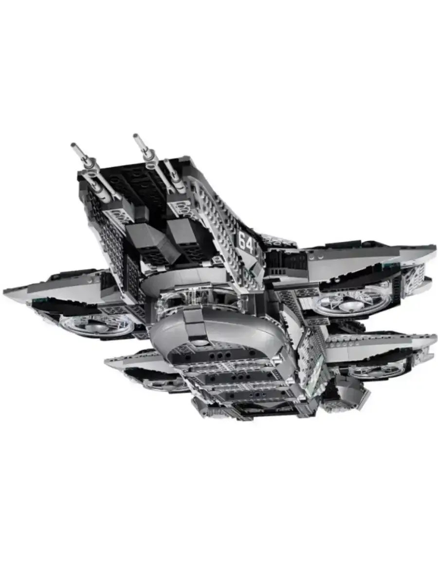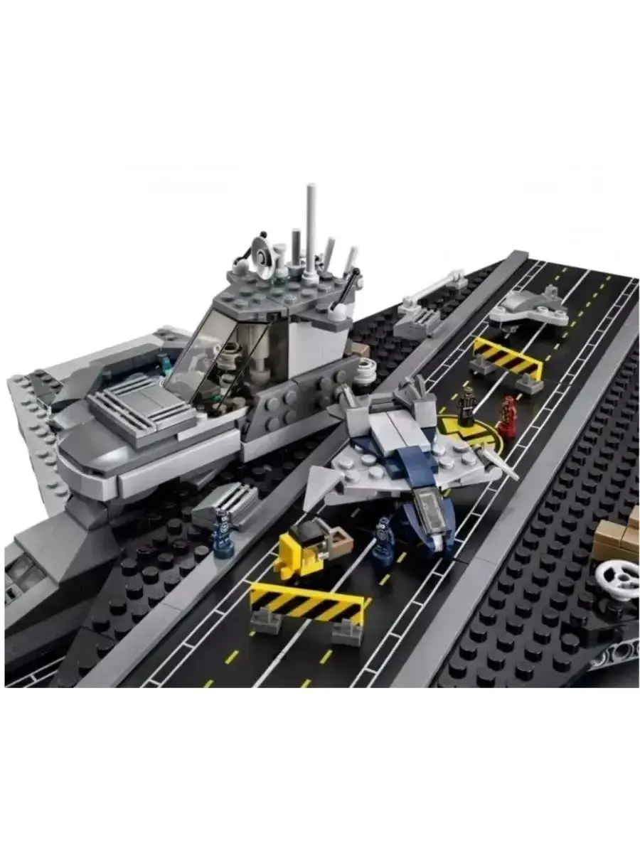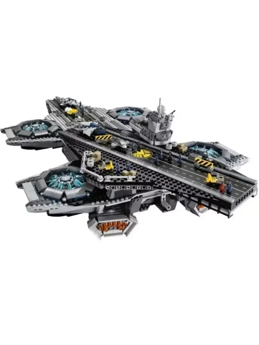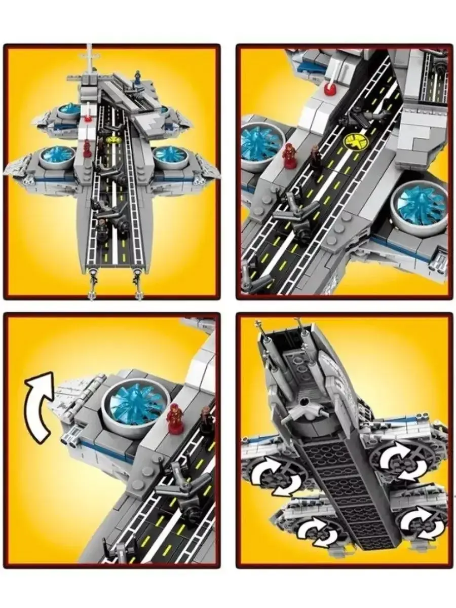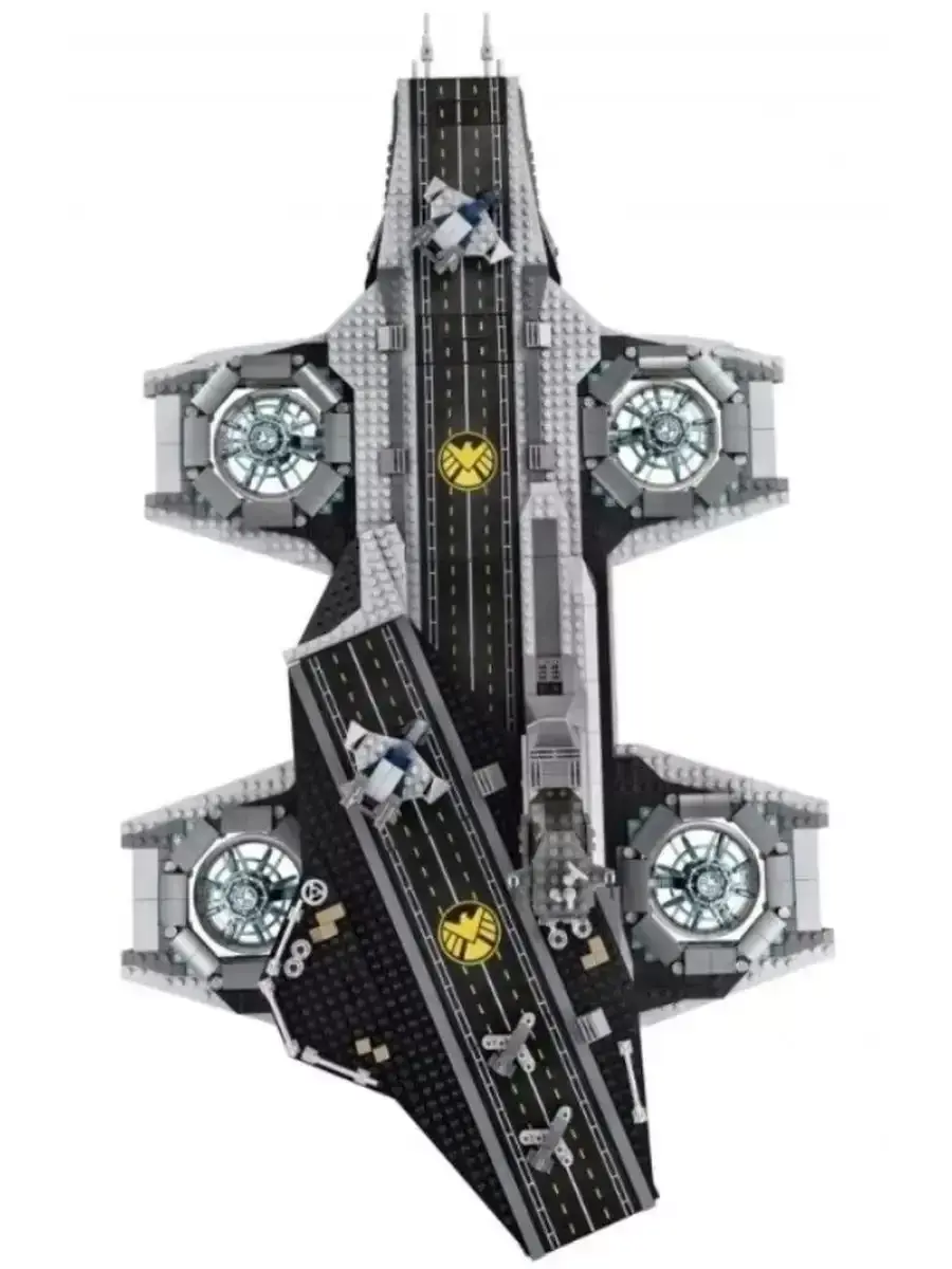Модель оснащена двумя взлётно-посадочными полосами, миниатюрными Квинджетами, истребителями и наземными транспортными средствами поддержки. Детализированный интерьер и палуба позволяют воссоздать сцены из фильмов и комиксов. В комплект входят минифигурки любимых супергероев Marvel, а также 4 микро-фигуры, которые можно разместить на палубе и внутри авианосца для максимальной реалистичности.