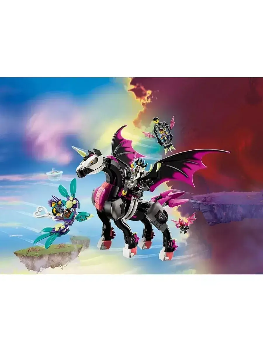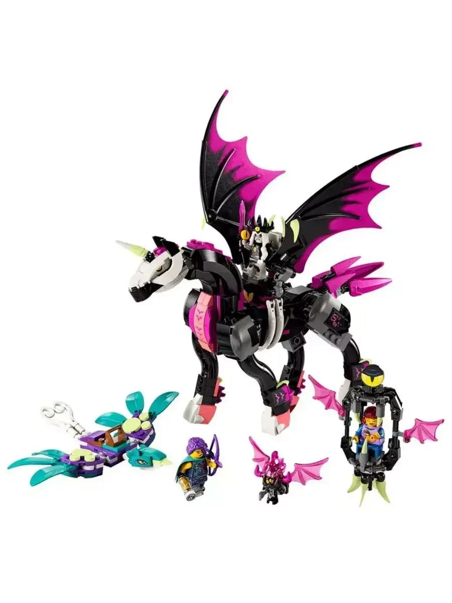 В комплект входят детали для сборки реалистичной модели Пегаса с большими крыльями, выразительной головой, гривой и хвостом. Особое внимание уделено подвижности крыльев и ног, что позволяет оживить игрушку и использовать её в динамичных играх. Дополнительно в наборе могут быть аксессуары и фигурки персонажей, которые дополнят игровую сюжетную линию.