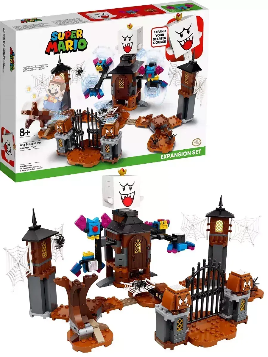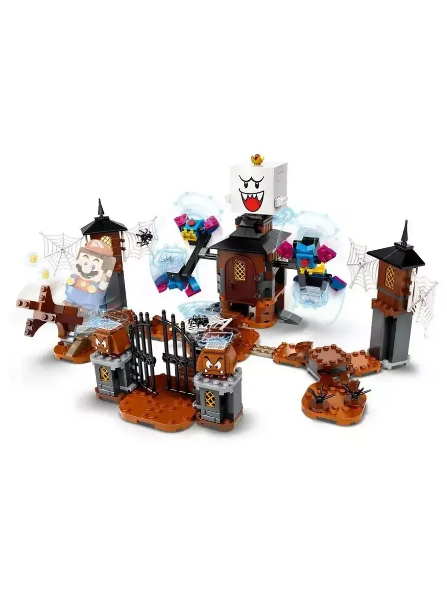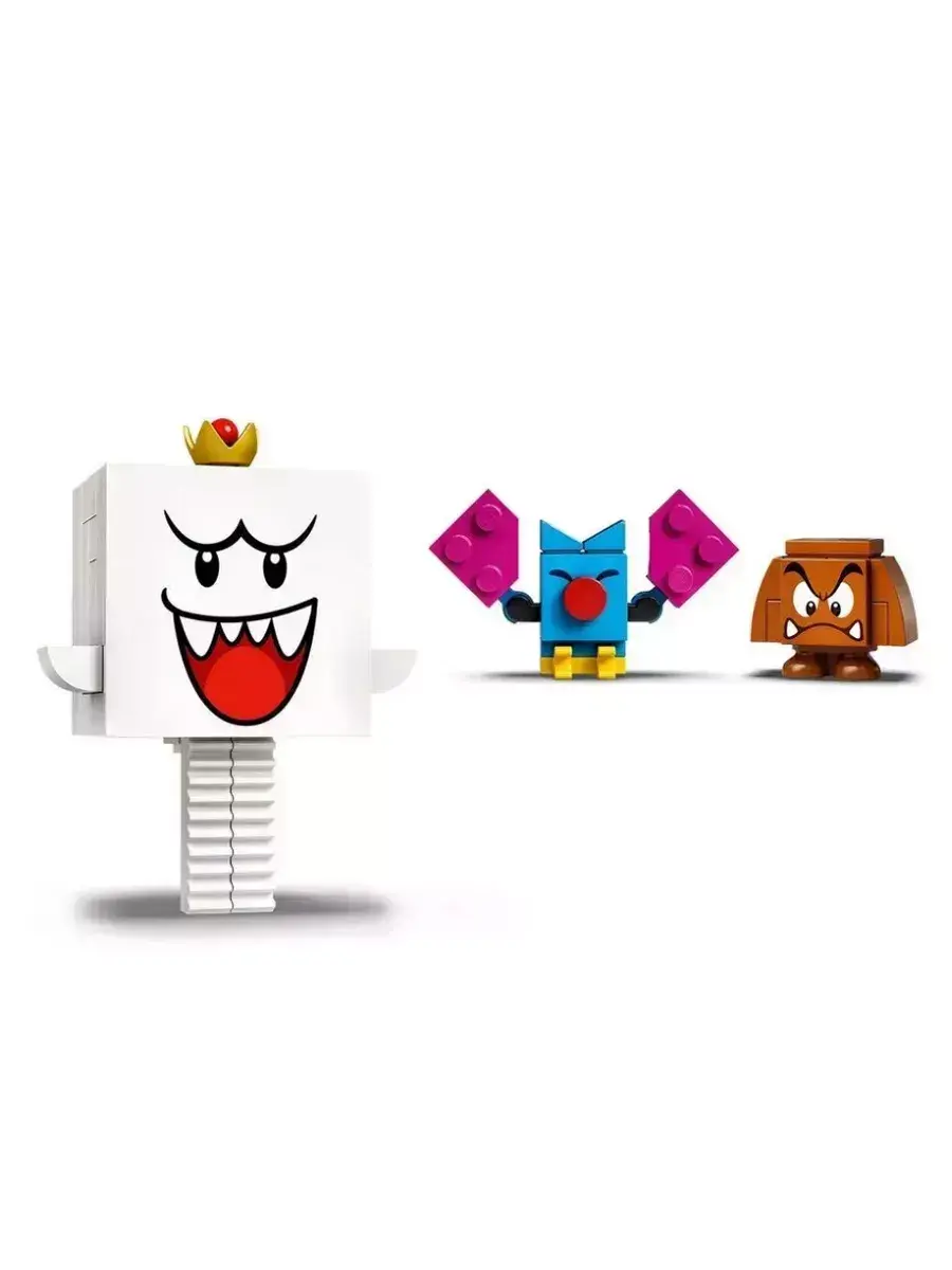 Создай новый игровой уровень с призраками с помощью этого дополнительного набора и Стартового набора Супер Марио. Победи Гумб, охраняющих ворота. Зайди во двор с призраками, прыгай на паутину и перепрыгни через дерево, чтобы собрать монеты. Продолжай прыгать на летучих мышей, пока Король Бу не упадёт, чтобы получить Суперзвёздочку, которую он охранял. Используй её силу, чтобы победить Короля!