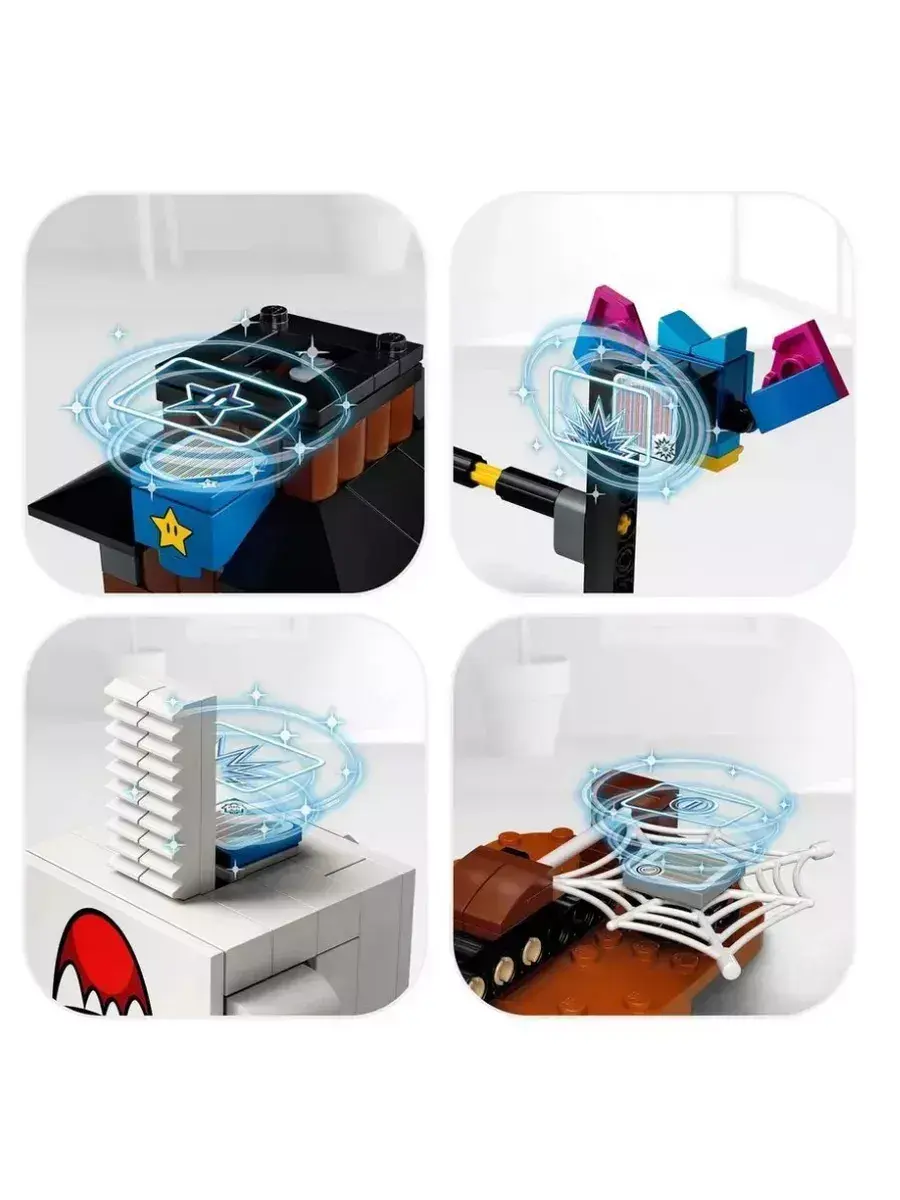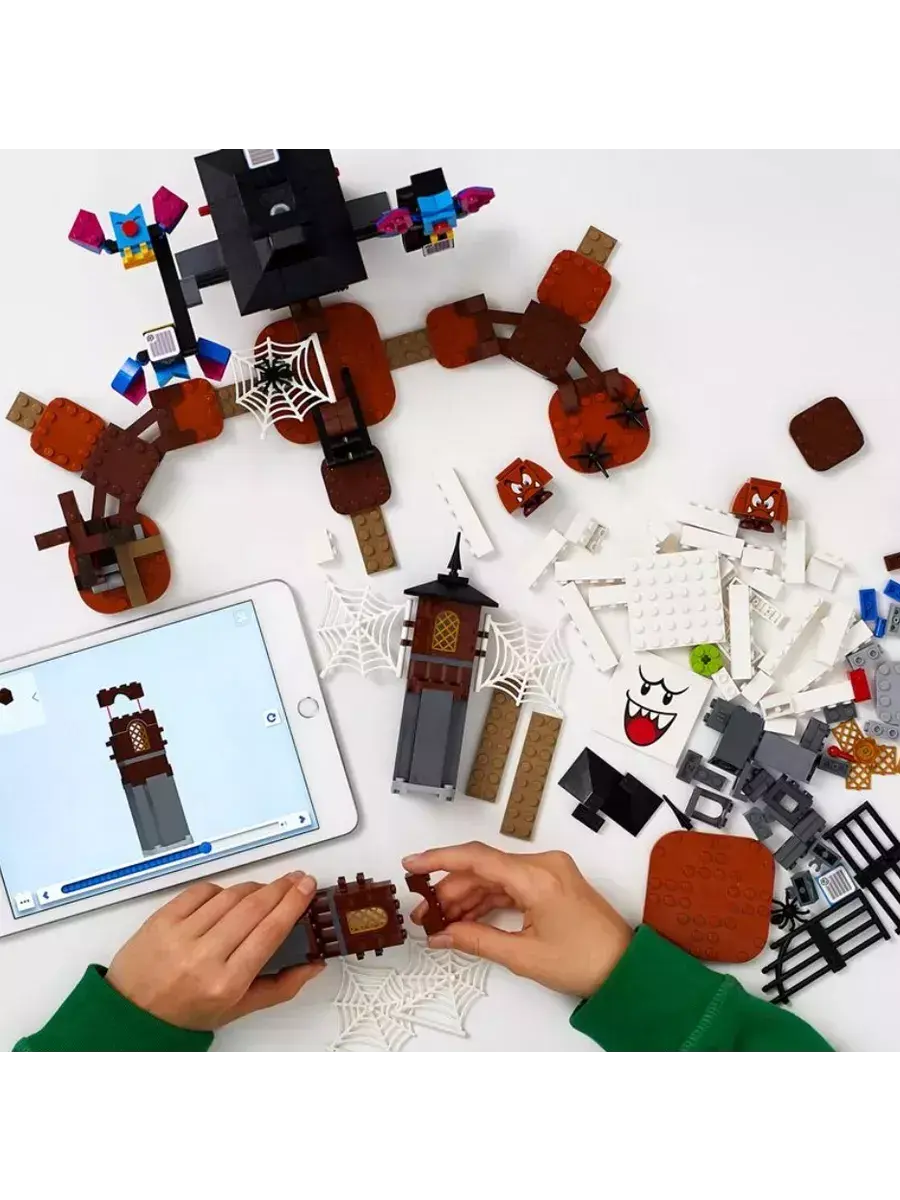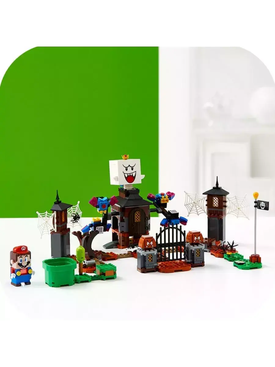 Создай новый игровой уровень с призраками с помощью этого дополнительного набора и Стартового набора Супер Марио. Победи Гумб, охраняющих ворота. Зайди во двор с призраками, прыгай на паутину и перепрыгни через дерево, чтобы собрать монеты. Продолжай прыгать на летучих мышей, пока Король Бу не упадёт, чтобы получить Суперзвёздочку, которую он охранял. Используй её силу, чтобы победить Короля!