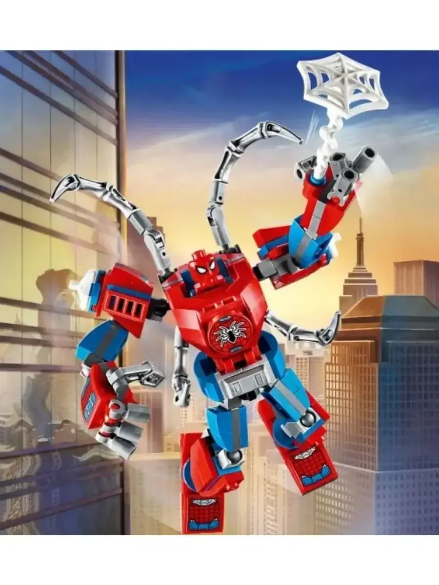 В комплект входят элементы для создания яркой и динамичной сцены с участием Человека-Паука, а также его фирменное оружие — паутина. Модель оснащена подвижными частями, что позволяет придавать герою различные боевые и акробатические позы, делая игру более реалистичной и интересной.