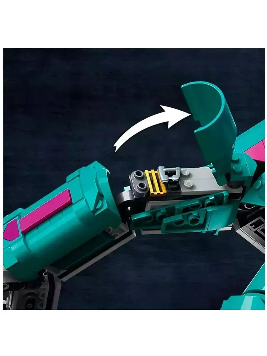 Много возможностей для игры — универсальный космический корабль имеет открывающуюся кабину для 3 минифигурок, секретный отсек для еще одной минифигурки, оружейный магазин и 2 небольших космических корабля, которые можно присоединить.