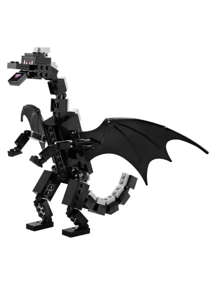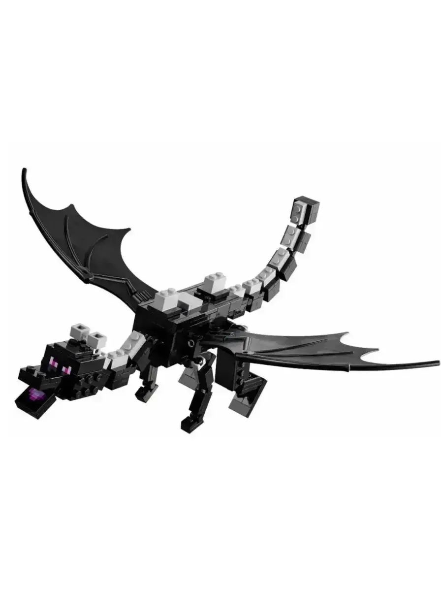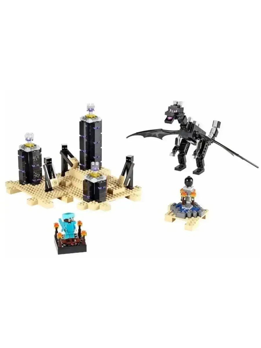 В комплект входят большая сборная фигура Дракона Края с подвижными крыльями, хвостом и головой, фигурка героя (чаще всего в алмазной броне), эндермены, обсидиановые колонны с кристаллами Края, оружие и игровые элементы. Дракон выглядит внушительно и позволяет разыгрывать сцену сражения с максимальной реалистичностью в рамках стиля Minecraft.