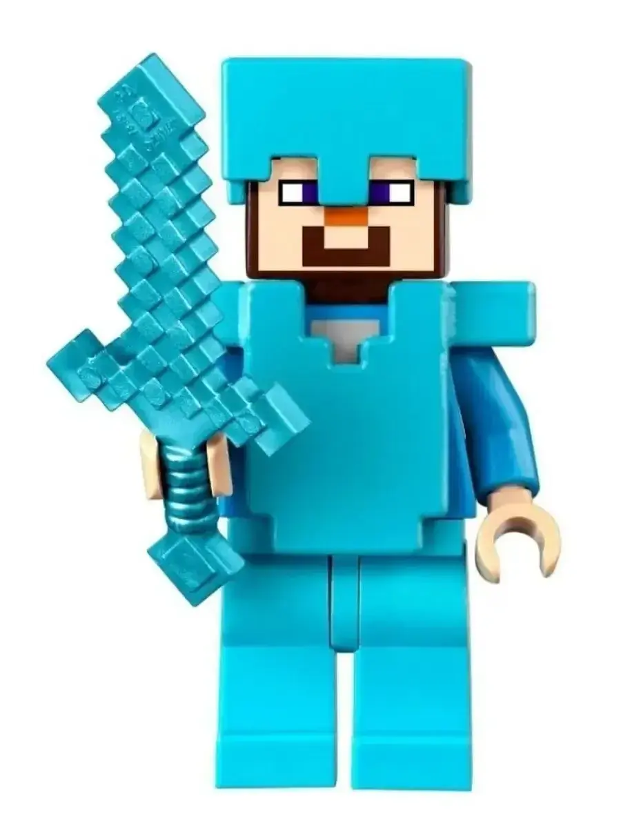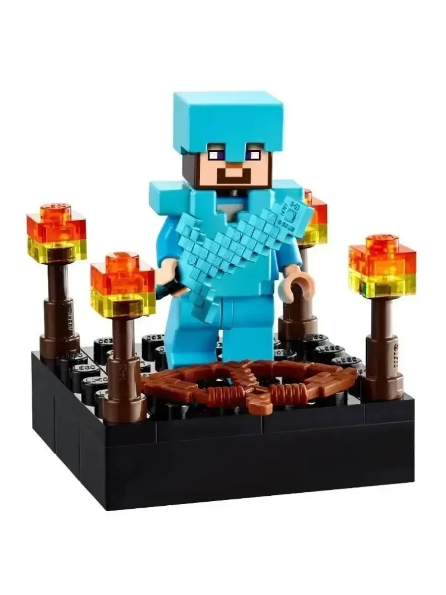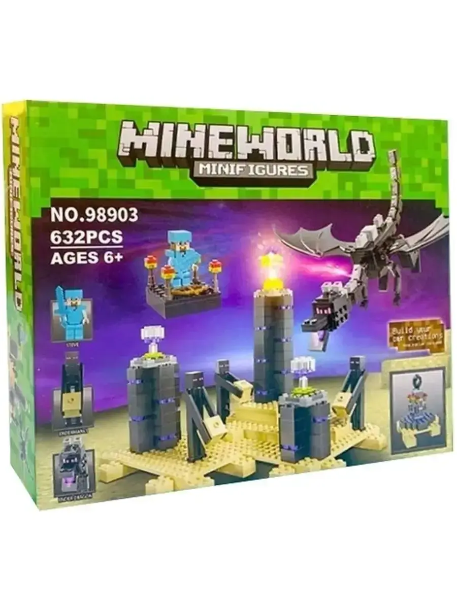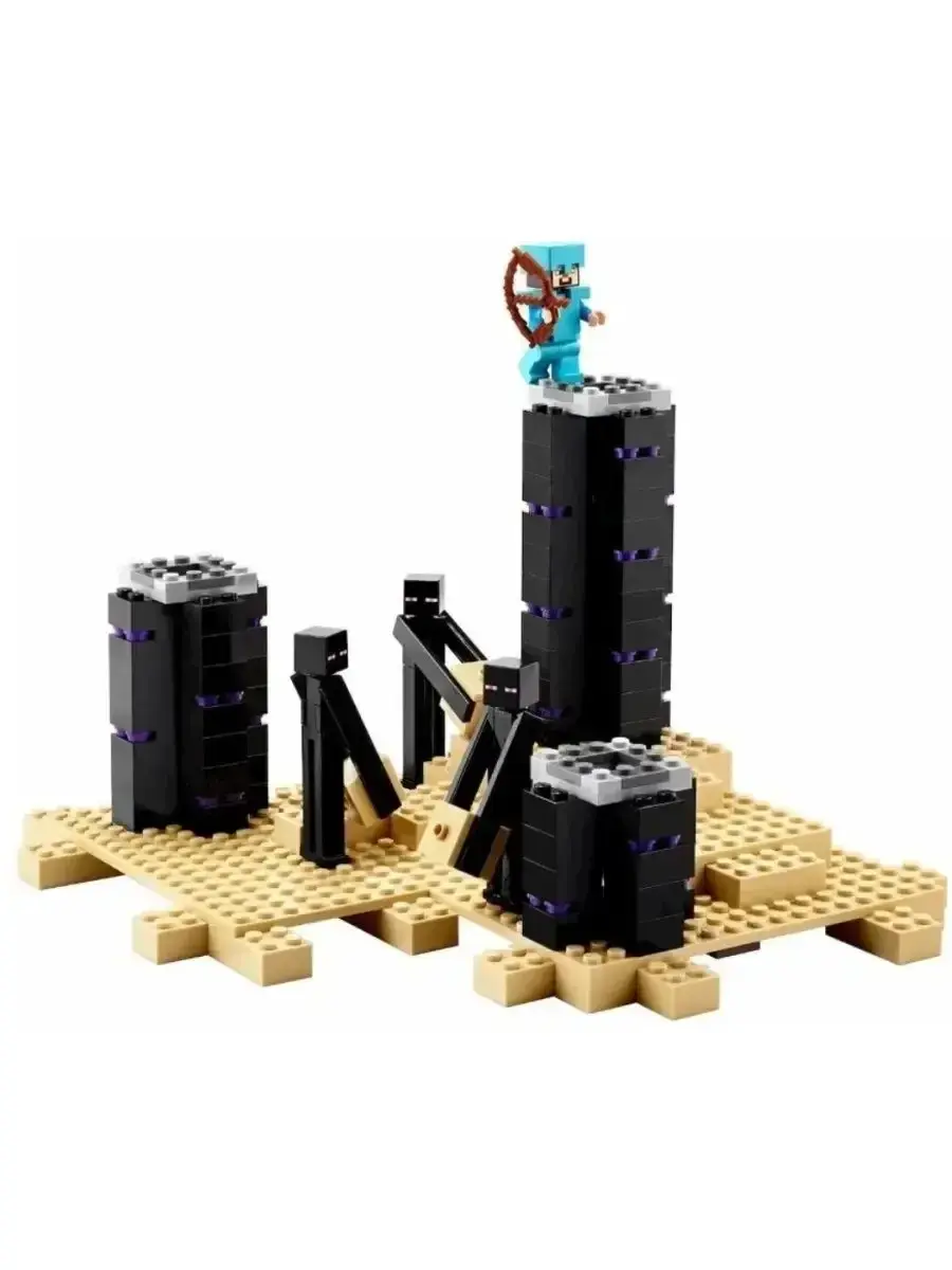 В комплект входят большая сборная фигура Дракона Края с подвижными крыльями, хвостом и головой, фигурка героя (чаще всего в алмазной броне), эндермены, обсидиановые колонны с кристаллами Края, оружие и игровые элементы. Дракон выглядит внушительно и позволяет разыгрывать сцену сражения с максимальной реалистичностью в рамках стиля Minecraft.