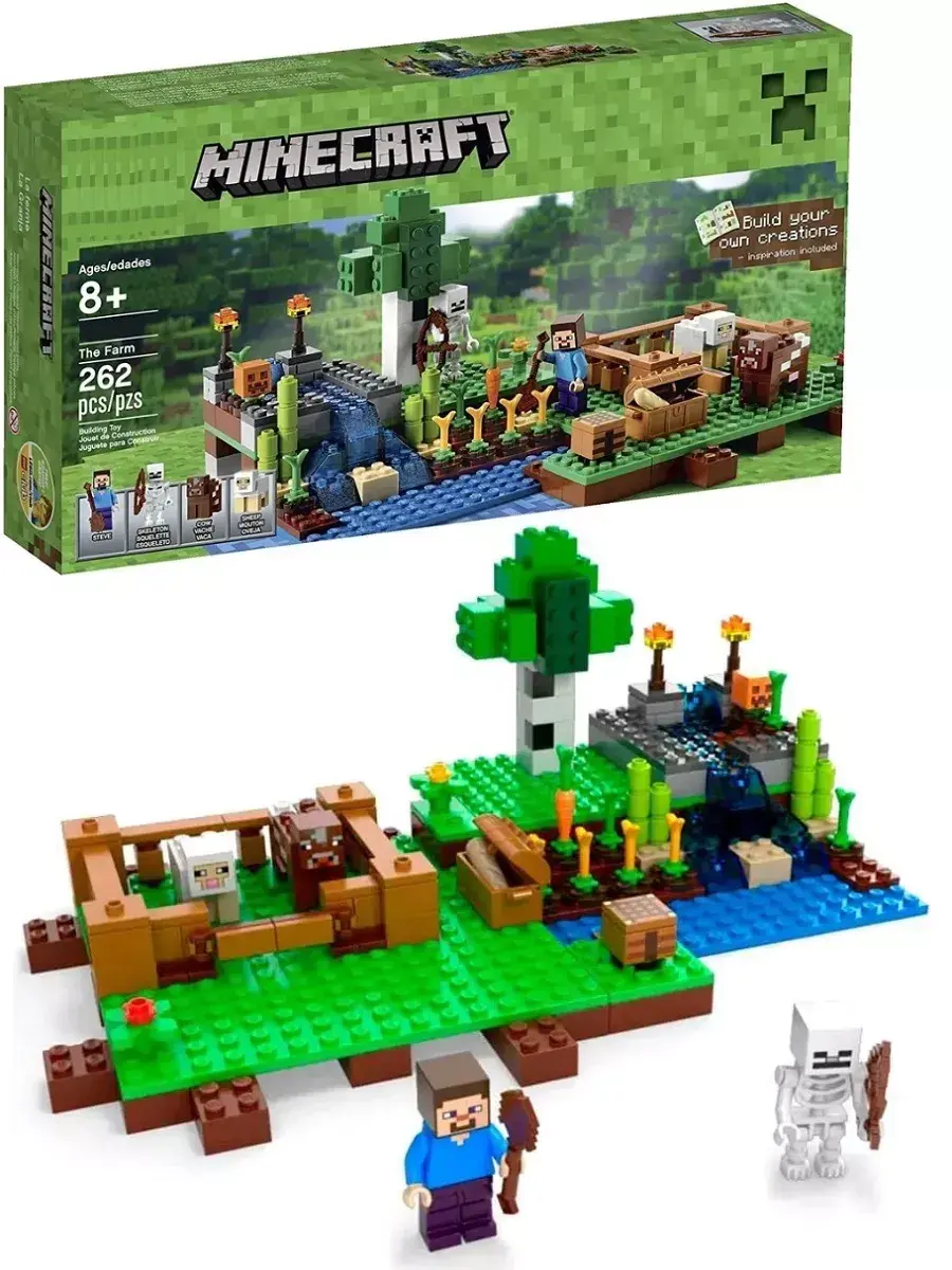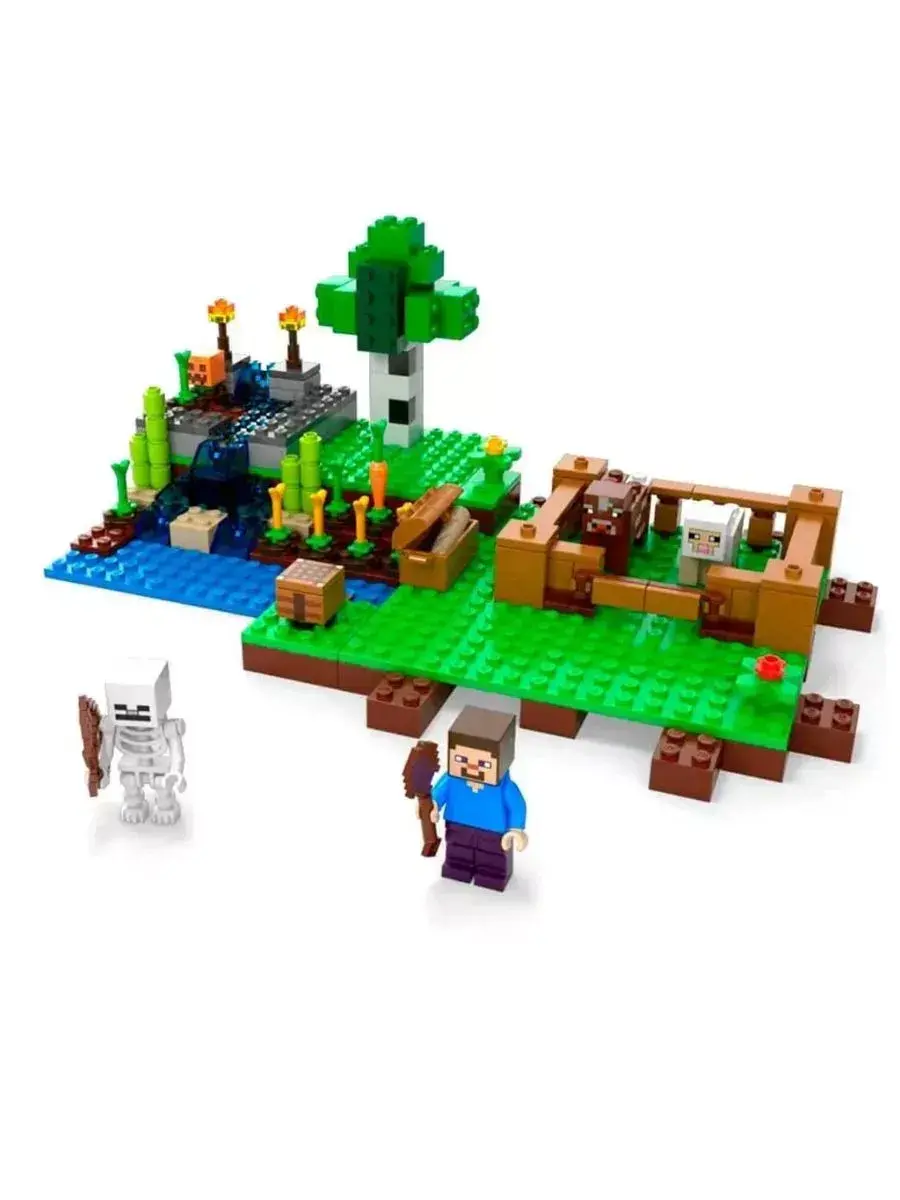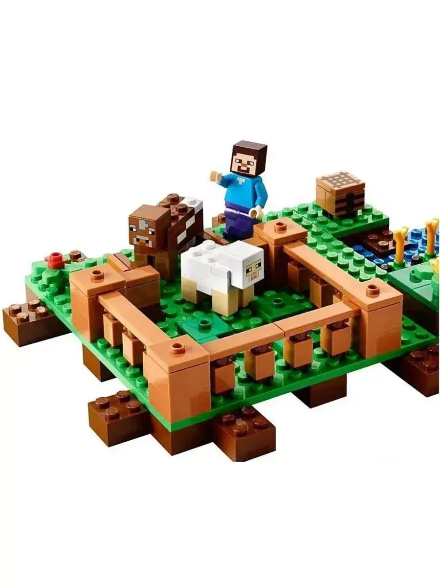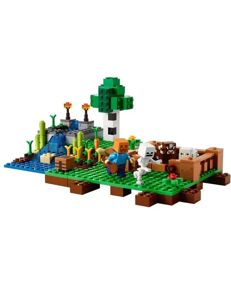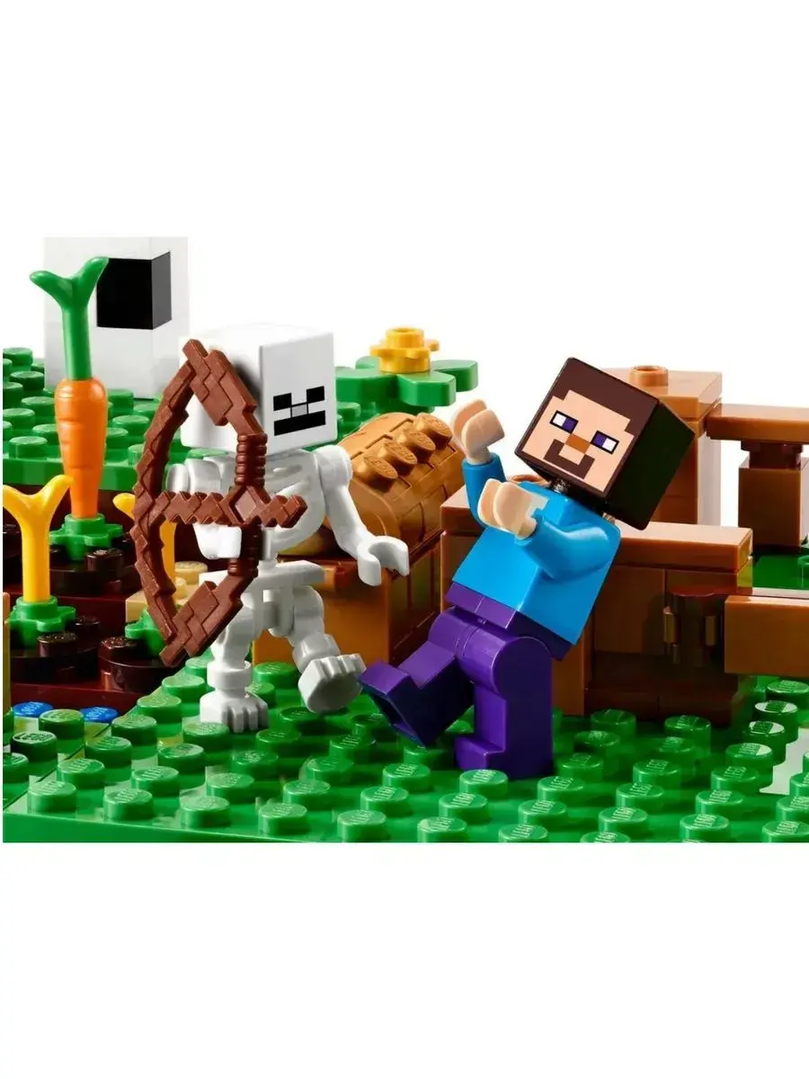 Собирай возобновляемые ресурсы на ферме. Тебе нужна еда, чтобы выжить, так что построй загон для скота и отведи реку на поля. Собирай тыквы, пшеницу, сахарный тростник и морковку. С помощью верстака можно сделать тыквенный шлем или фонарь. Но не забывай о скелете с луком и стрелами, который приходит ночью! В набор входит минифигурка Стива с различными аксессуарами, скелет, корова и овца. Конструктор упакован в яркую коробку, детали внутри запаяны в пакеты. Данный конструктор при полной сборки образует удивительный мир, благодаря которому ребенку будет еще более интересно строить и играть в него.