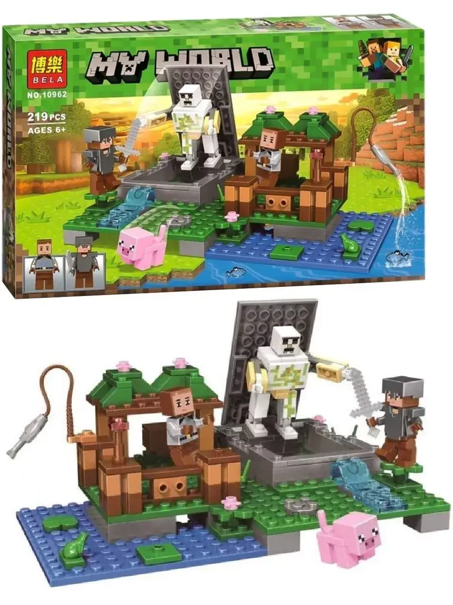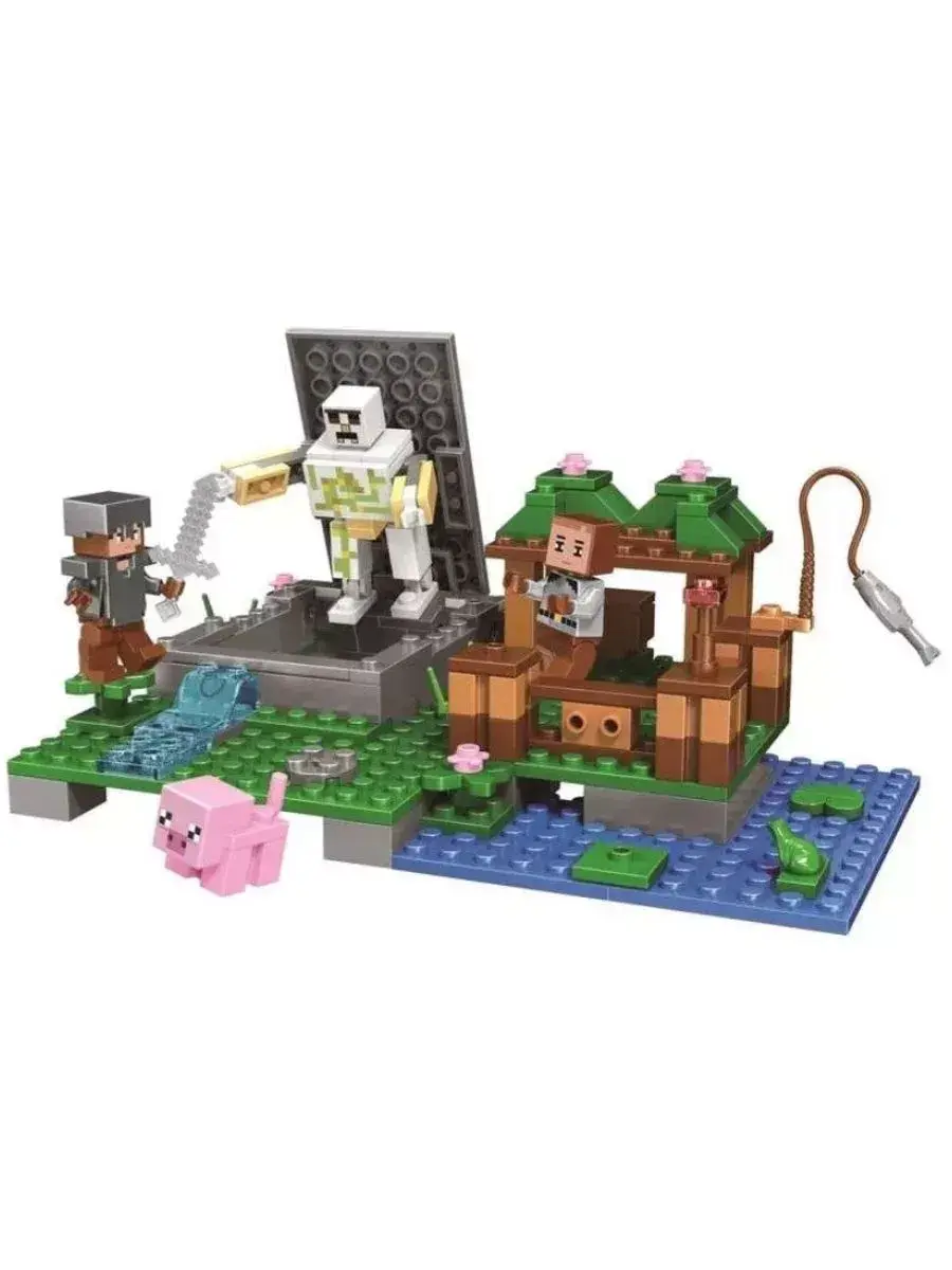 У водоема в конструкторе Майнкрафт Голем на ферме размещается загончик. Он состоит из светлых и темных коричневых блоков, а его крышу украшают зеленые насаждения. В темное время суток здесь коротает ночи маленькая свинка. В дневное время майнкрафтовский житель использует загончик как место для рыбного отлова.