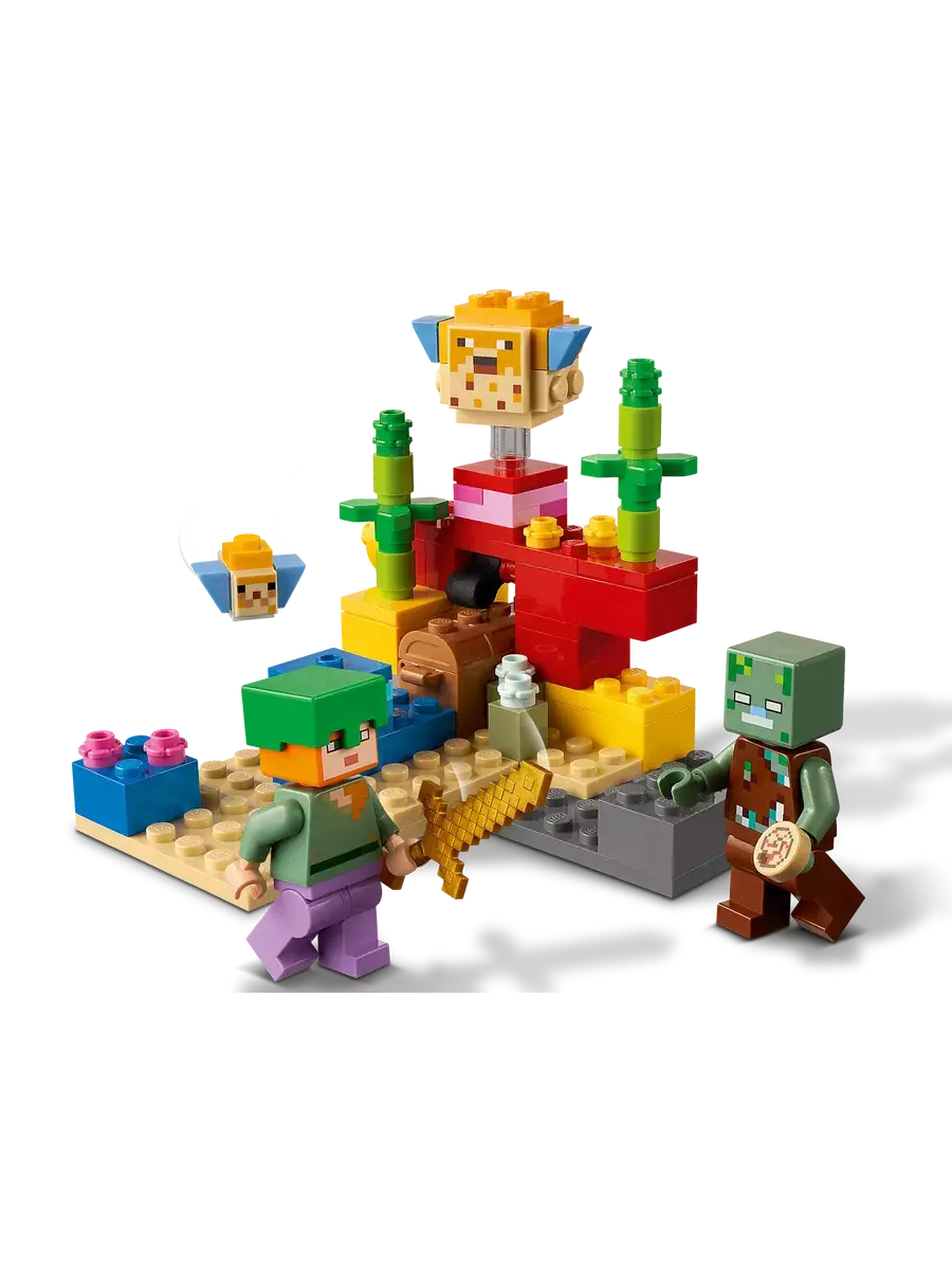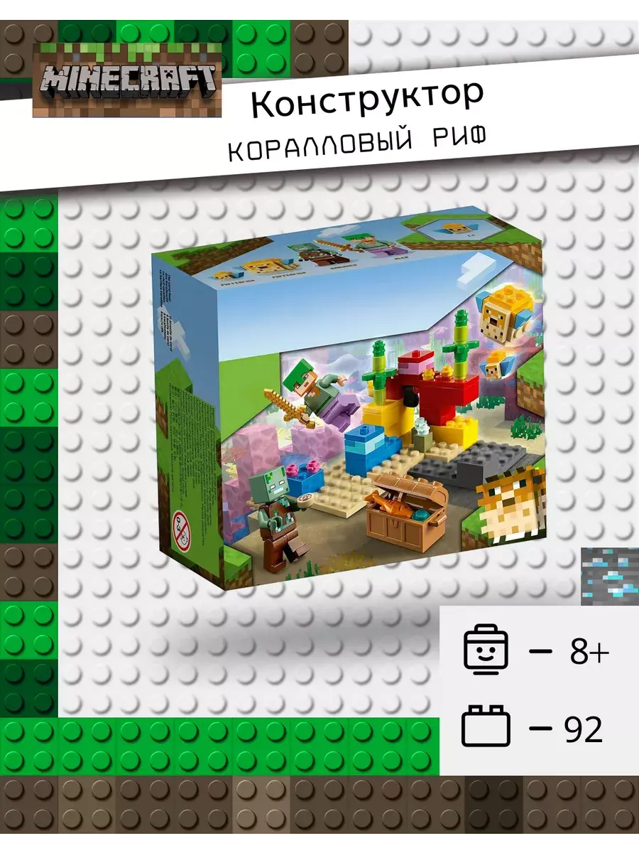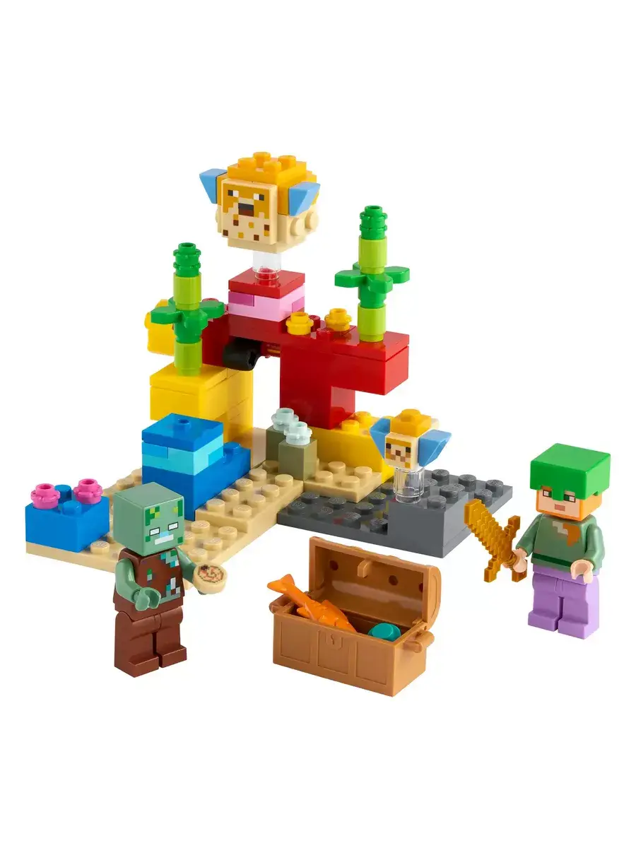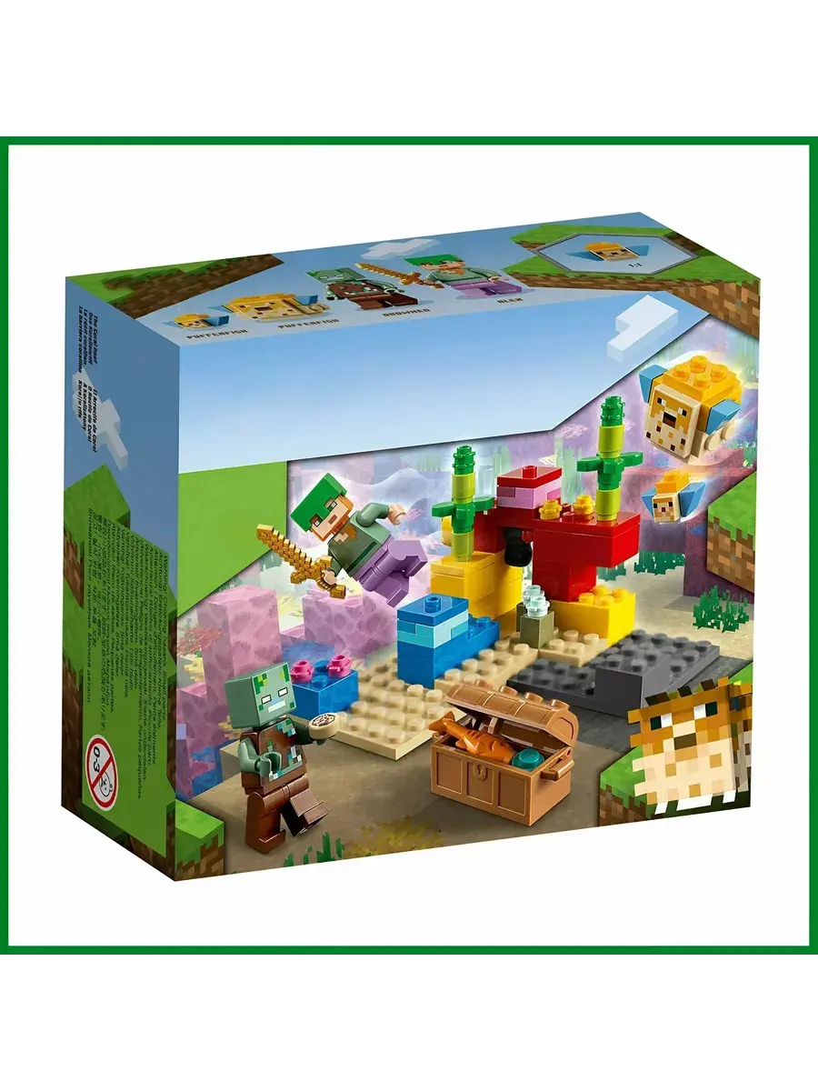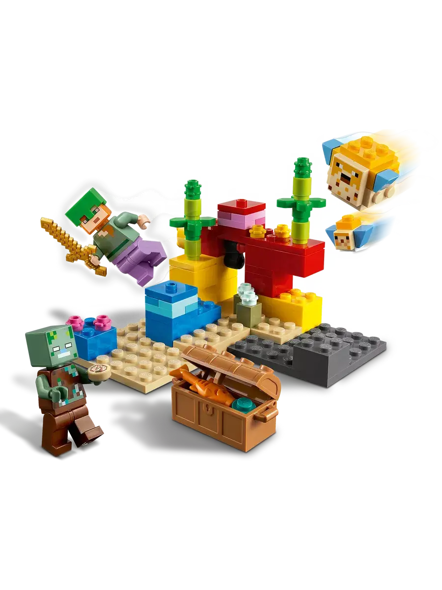 Конструктор "Мой мир: Майнкрафт. Коралловый риф" состоит из 92 деталей и приглашает вас отправиться на захватывающее подводное приключение. Вместе с Алексом вы сможете исследовать красочный коралловый риф в поисках сокровищ. Перевернув большой желтый камень, вы сможете обнаружить сундук с сокровищами и познакомиться с дружелюбными иглобрюхами. В сундуке спрятаны настоящая жемчужина и рыба. Однако будьте бдительны: рядом обитает утопленник. Вам предстоит защитить сокровища и победить всех зомби.