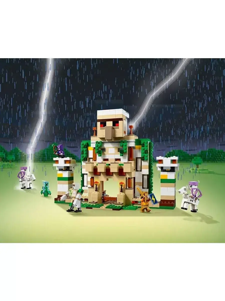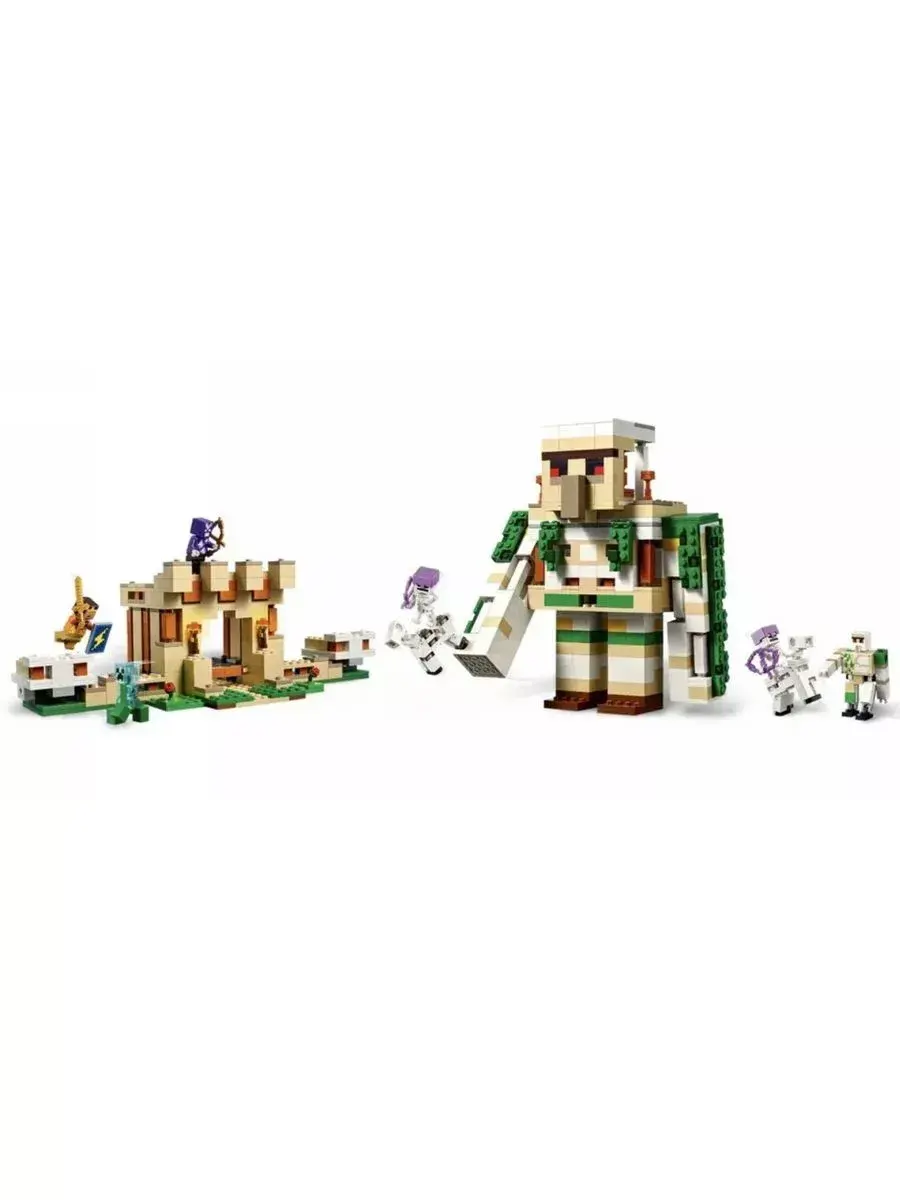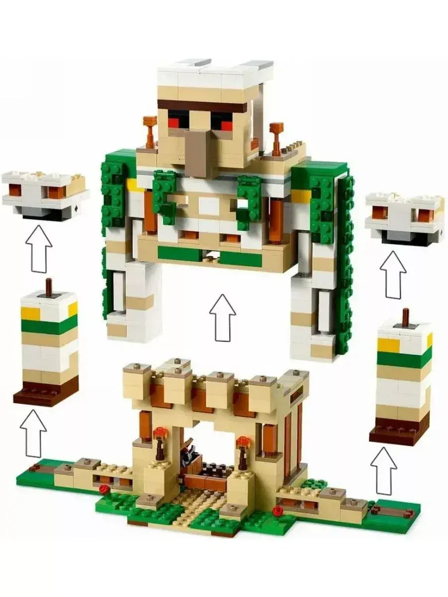 В комплект входят фигурки персонажей, включая воина, мирного жителя, враждебных мобов (например, скелета или крипера), а также сам Железный Голем. Основная конструкция — мощная крепость с башнями, стенами, воротами и боевыми позициями. Архитектура напоминает облик голема: узнаваемый силуэт, массивные формы и характерные цвета придают набору особую атмосферу.