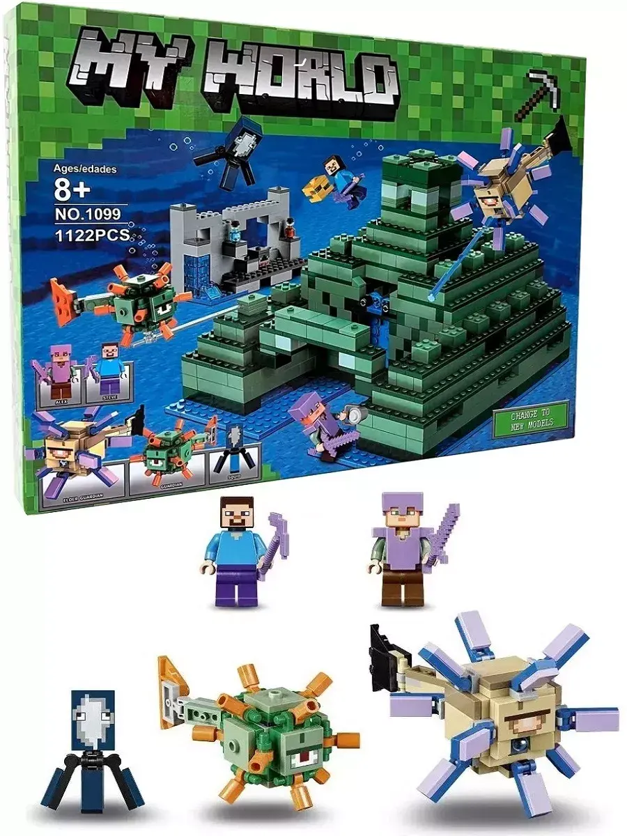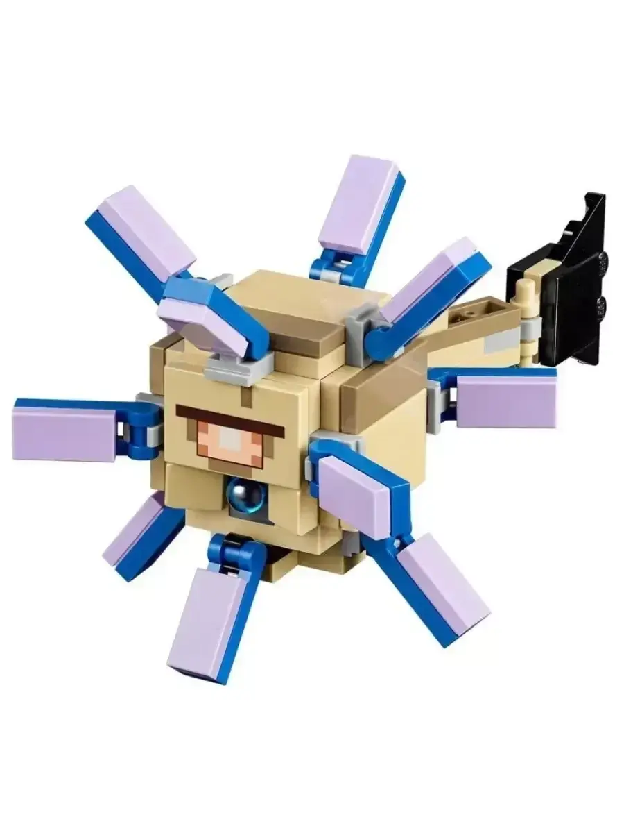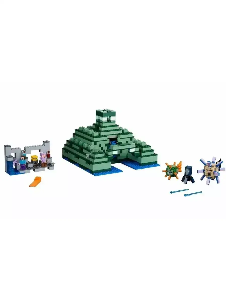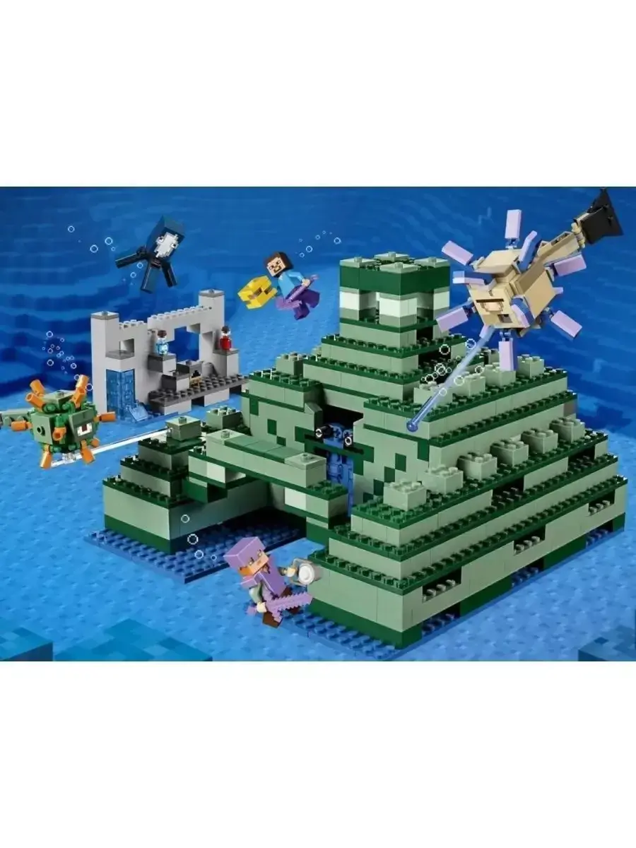 Из деталей набора "Подводная крепость" Вы сможете собрать масштабную модель подводного сооружения. Её корпус напоминает многоуровневую пирамиду. Центральный вход сделан в виде арочного проёма с массивной потолочной перекладиной. С помощью прозрачной подставки дежурящий Страж может реалистично двигаться и «плавать» вокруг крепости. Его грозным напарником является Древний Страж, способный сражать непрошеных гостей мощным лазером. Справа от входа устроен тайник. Отогнав спрута и подняв часть фасада, можно обнаружить ярко-жёлтую губку. Она необходима для удаления воды из главного зала крепости. Поместите губку над входом и проследите за тем, как струи воды, закрывавшие проход, разойдутся в разные стороны. Благодаря распашной конструкции, стены крепости можно раздвинуть и открыть доступ ко всем помещениям. В центральном зале располагается куб из тёмного Призмарина, украшенный морскими фонарями. В его торце устроен своеобразный противовес. Нажав на него, можно поднять крышку и увидеть, как из куба появятся 8 золотых блоков. Они служат главным сокровищем крепости и по совместительству долгожданной наградой для игрока. Размер пирамиды в собранном виде составляет 15х24х24 см.