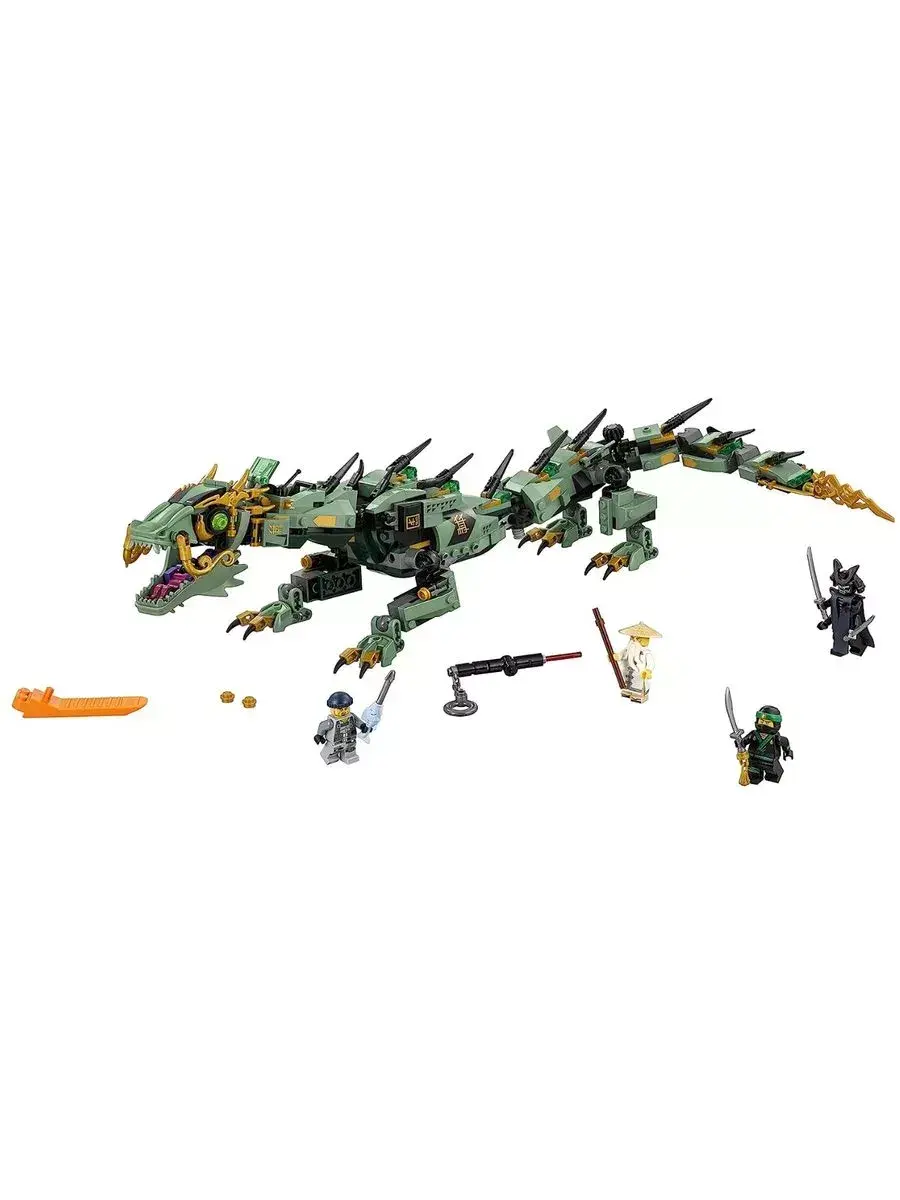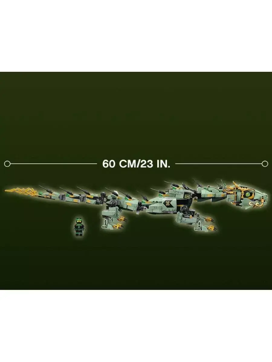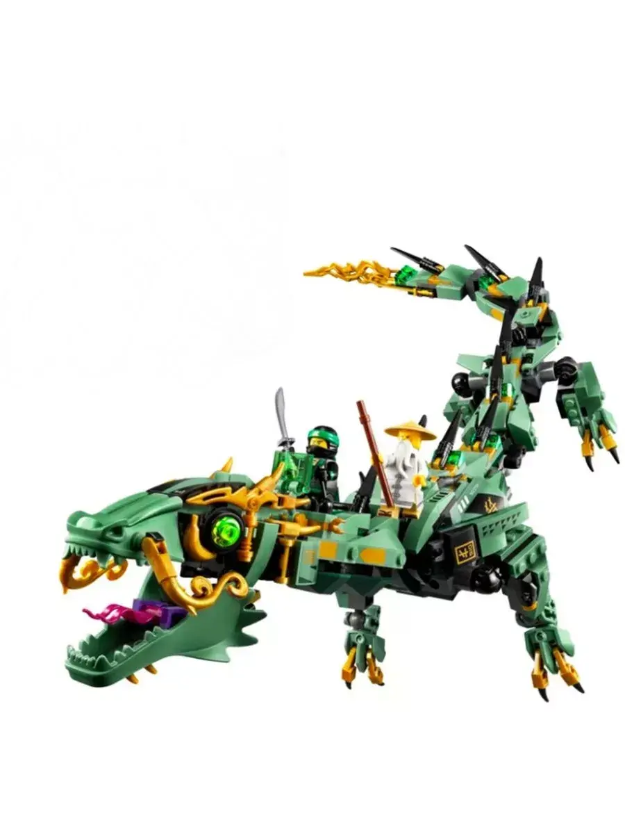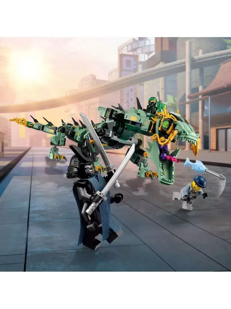 Конструктор Ниндзяго Муви "Механический Дракон Зелёного Ниндзя" – модель боевой машины Ллойда. Представленная игровым набором, включающим в свой состав 573 детали, она станет главным инструментом в борьбе между Гармадоном и его сыном – Зеленым Ниндзя. Механический Дракон Зеленого Ниндзя – это механическая птица зелено-черного цвета с вкраплением золотистых элементов. Ее мощная клыкастая пасть с розово-фиолетовым языком и светящиеся зеленым светом глаза наводят ужас на солдат армии акул. Длинная шея с местом для «управленца» перед монитором служит точкой расположения главного героя, отдающего приказы наносить точечные удары по цели врага. Уникальной особенностью этого робота является специфичное строение лап. Оборудованные полукруглыми бронированными щитками, они служат местом скрытого расположения двигателей, инструментом обстрела врага посредством активации пружинных шутеров на каждом из них. Шарнирное крепление конечностей модели придает роботу максимум реалистичных действий. Двигающийся в разные стороны хвост дает возможность игроку наносить противнику неожиданный удар.