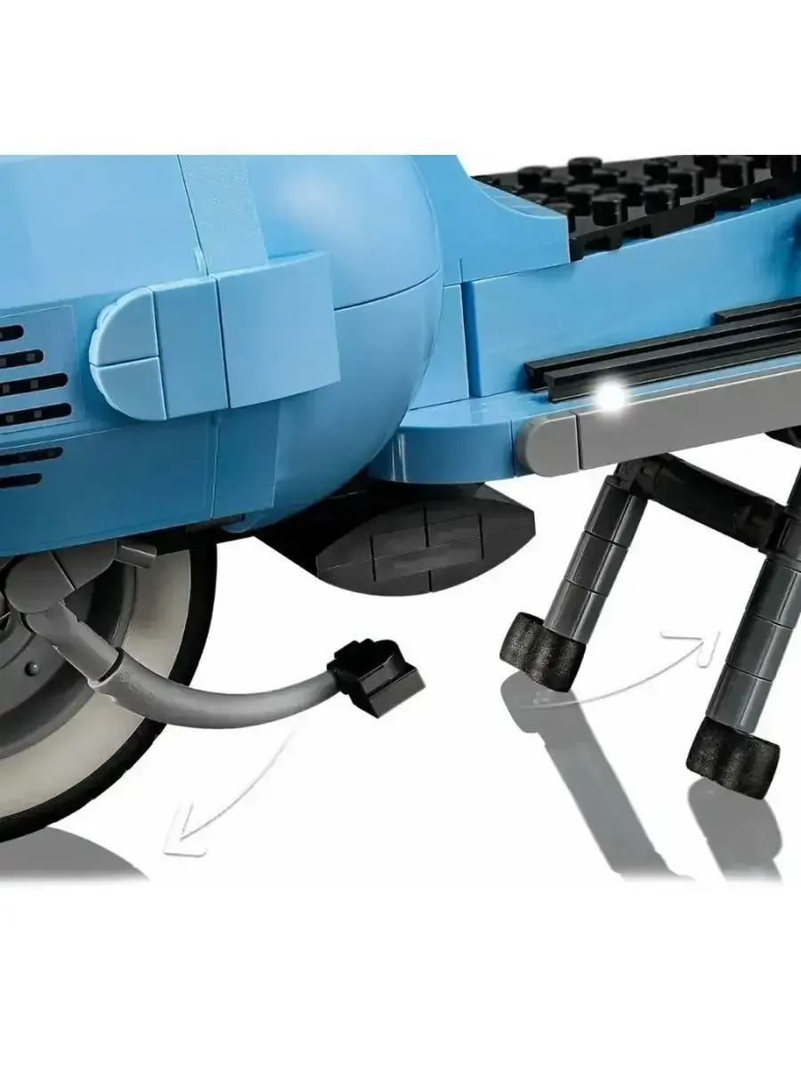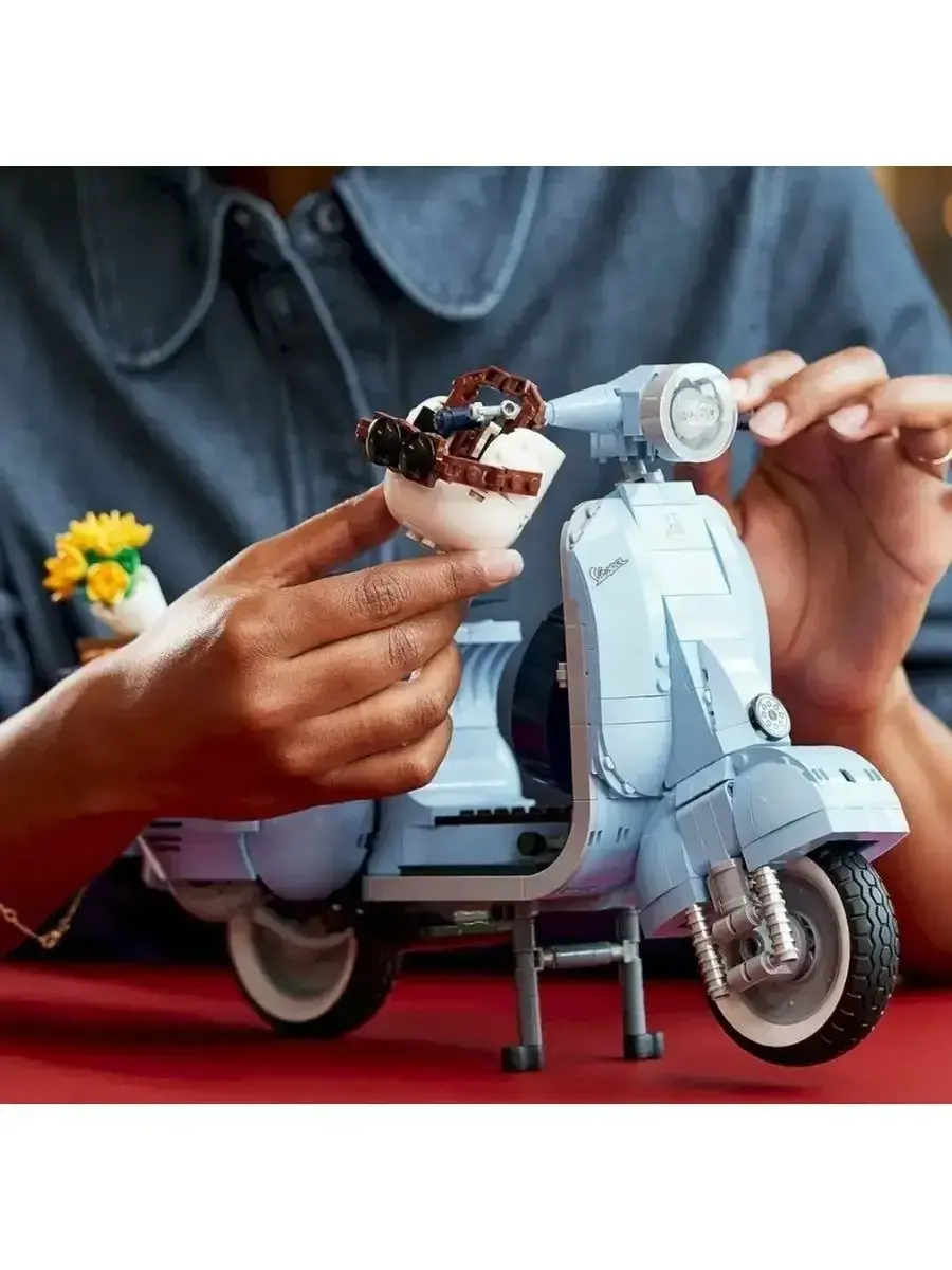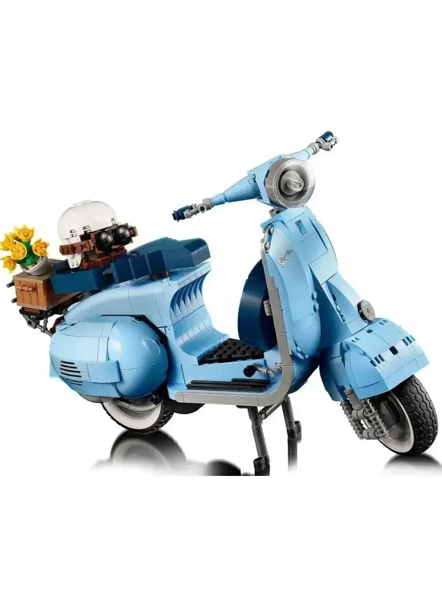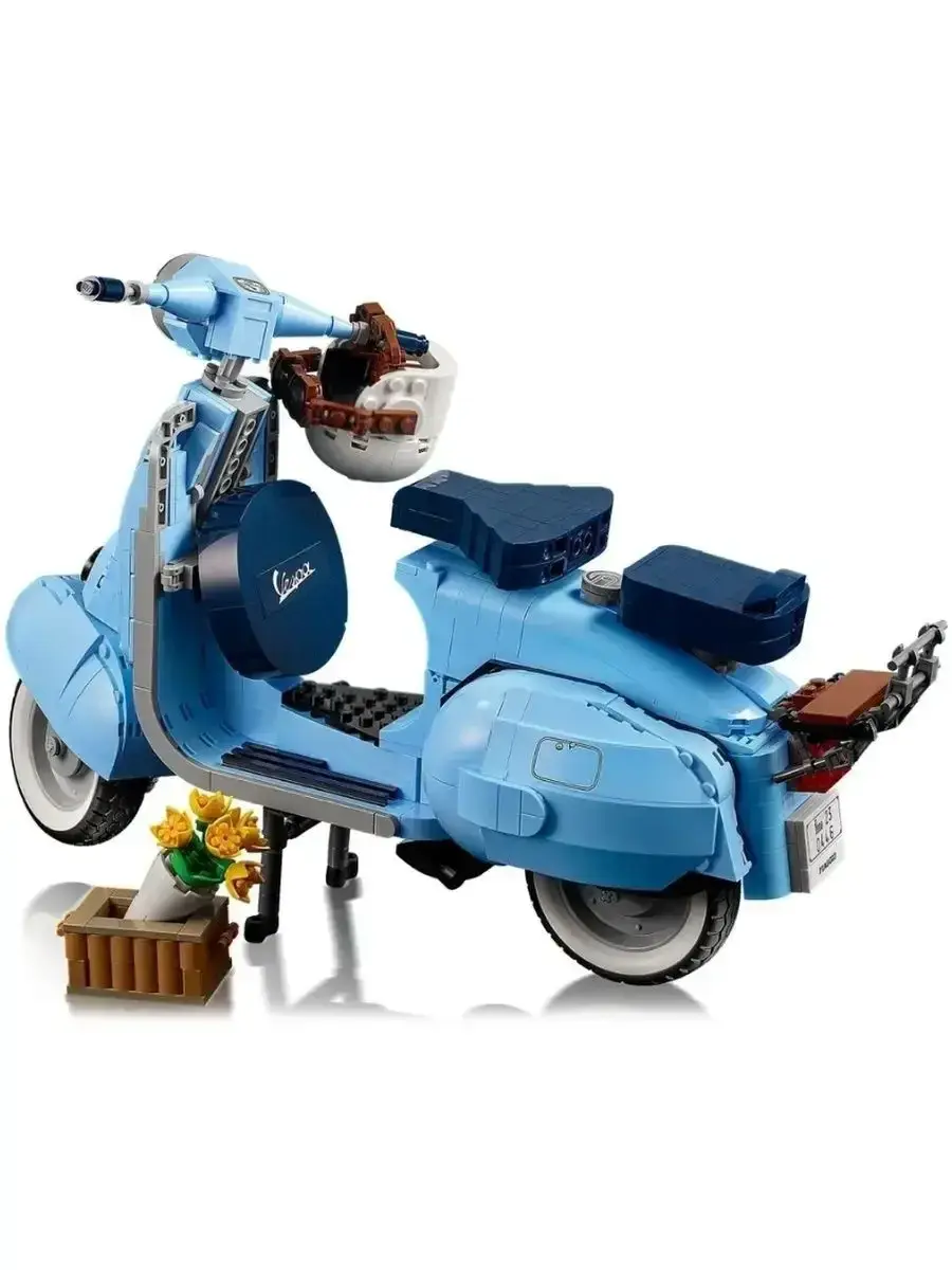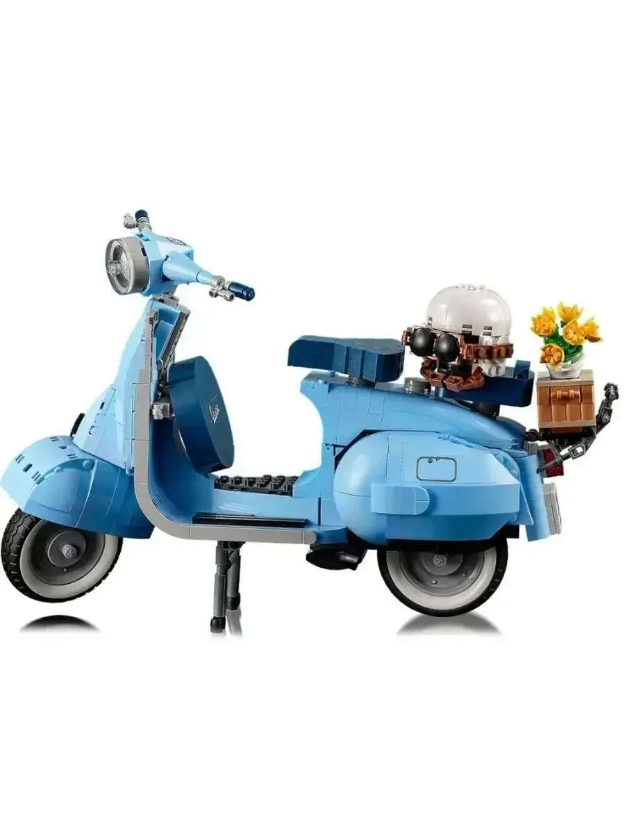 Этот набор для взрослых Vespa 125, созданный в честь 75-летия Vespa и основанный на классической модели Vespa Piaggio 1960-х годов, выполнен в пастельно-голубом, очень редком цвете, который наверняка понравится любителям конструирования. Готовая модель набора, собранная из 1106 предложенных деталей, достигает 35 см в длину и выглядит потрясающе. Миниатюрная копия культового скутера, который приобрел популярность в 1960-х годах и стал символом модной субкультуры Италии. За время существования этого скутера было выпущено множество моделей с разным рабочим объемом. В данном наборе представлена Vespa с рабочим объёмом 125 см³. Этот мотороллер собран из нежно-голубых деталей с наклейками, которые завершают образ. Проработанный двигатель, спрятанный под съемной крышкой, работающий руль, продуманные изгибы, два темно-синих сиденья, запасное колесо, номерной знак, подножка, шлем и корзинка с цветами. Всё это дополняет образ превосходной модели мечты Итальянца. Эта любовь к мотороллеру была показана в мультфильме «Лука» 2021 года, где двое друзей участвуют в гонке, чтобы на полученный приз купить Vespa, и стать свободными.