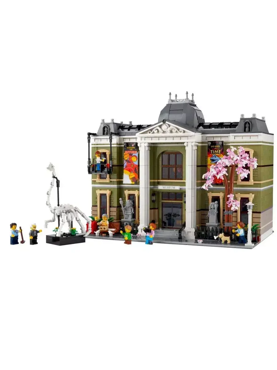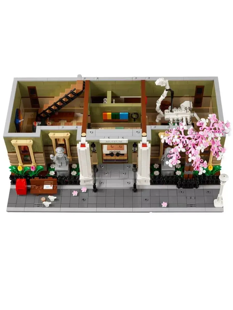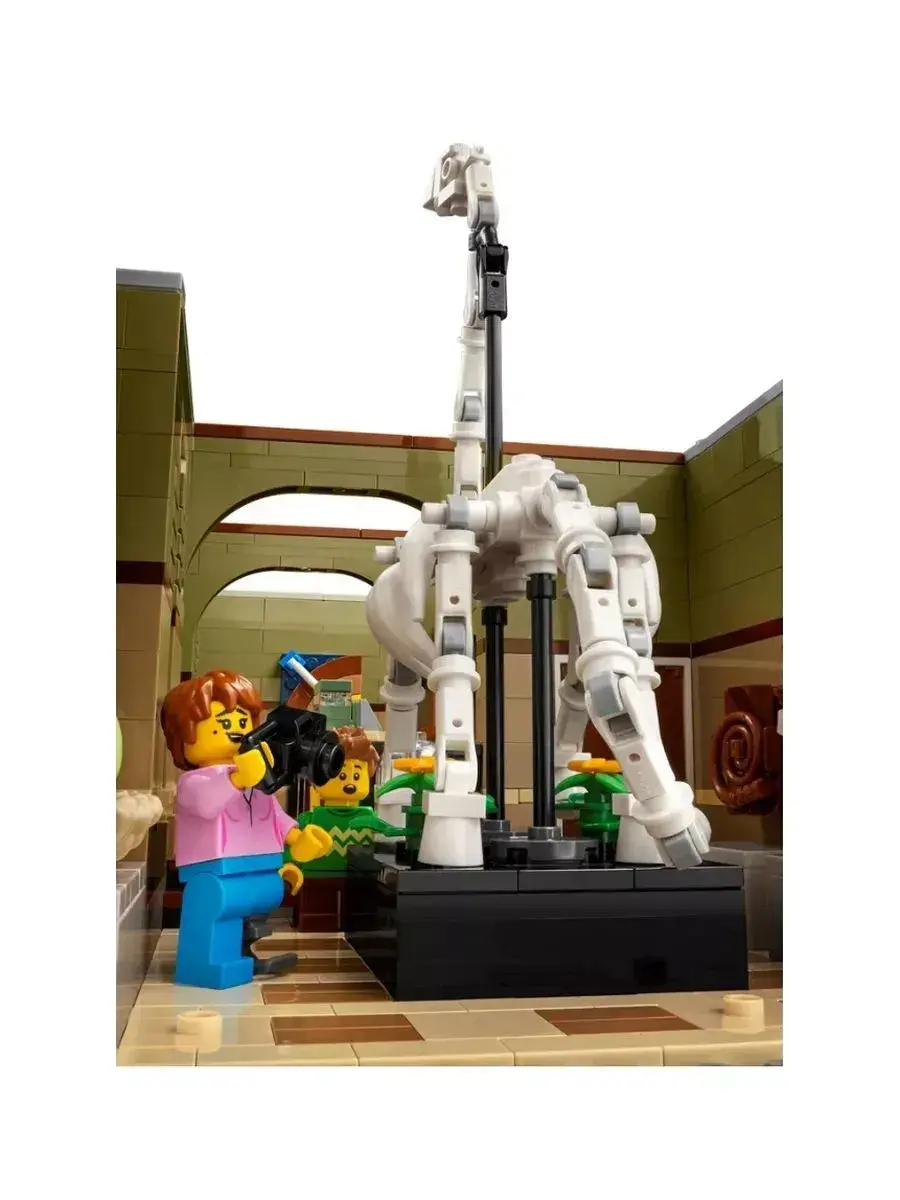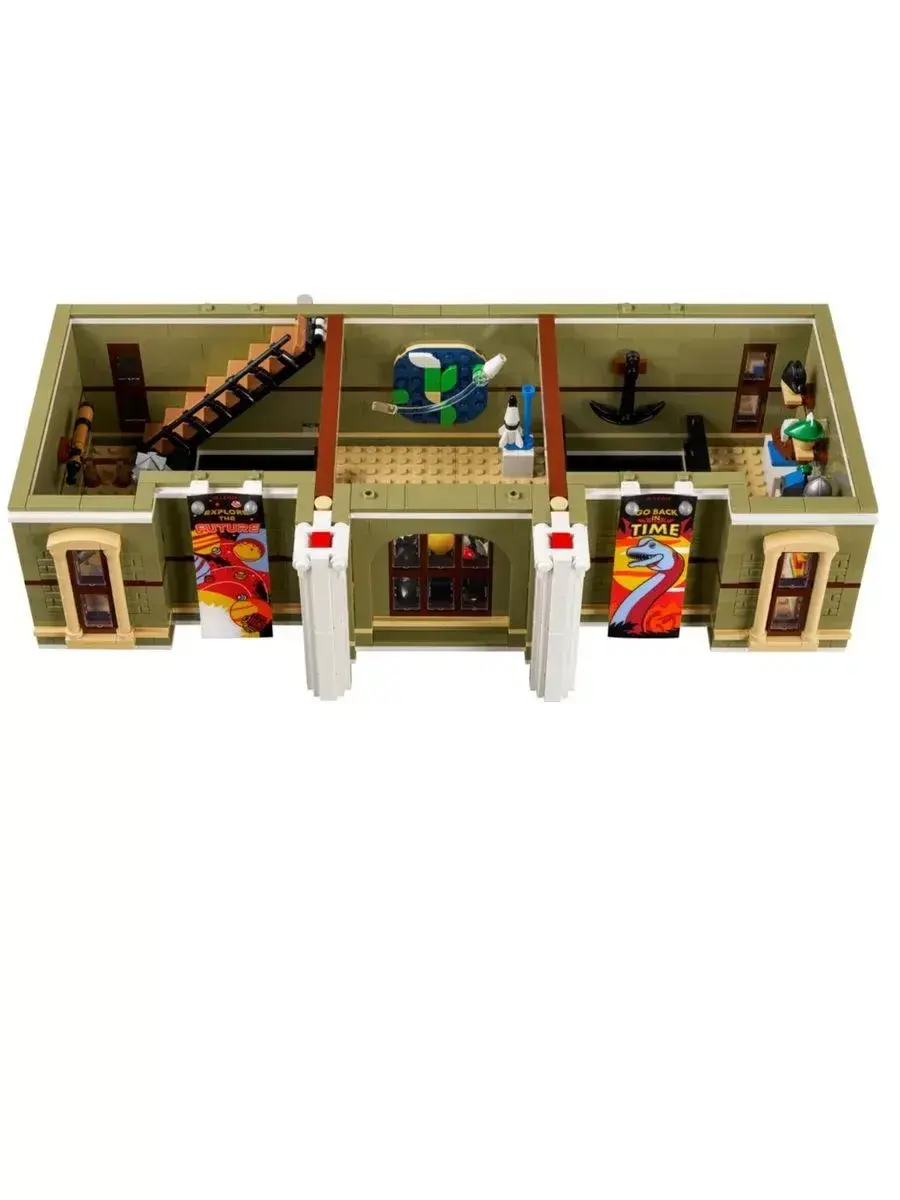 Конструктор Музей Естественной Истории — высококачественный конструктор из 4014 деталей в собранном виде имеет размеры 39*31*25 см. Окунитесь в мир истории развития нашей планеты: постройте двухэтажное модульное здание музея естествознания, и изучите вместе с гостями и опытным экскурсоводом ценные экспонаты. На первом этаже нас встречает сувенирный магазин и выставка первобытной истории, где размещены окаменелости, череп саблезубого тигра, вазы, модель вулкана и скелет брахиозавра, который возвышается через атриум на втором этаже музея. Лестница вдоль стены ведет на верхний этаж, где представлена коллекция, посвященная космосу: модель солнечной системы, в которой с поверхности Земли стартует ракета и другие модели космической тематики. На крыше сделаны большие полукруглые окна и кабинет директора с рабочим столом и печатной машинкой, а на открытой площадке установлен телескоп. В набор входят 7 минифигурок персонажей: руководитель музей в очках, женщина-экскурсовод, уборщик с метлой и шваброй, мойщик окон в кепке с ведром, посетитель музея в жилетке, гостья с фотоаппаратом, подросток в свитере, а так же две статуи эльфов из Ривенделла и фигурки собаки и голубя.
