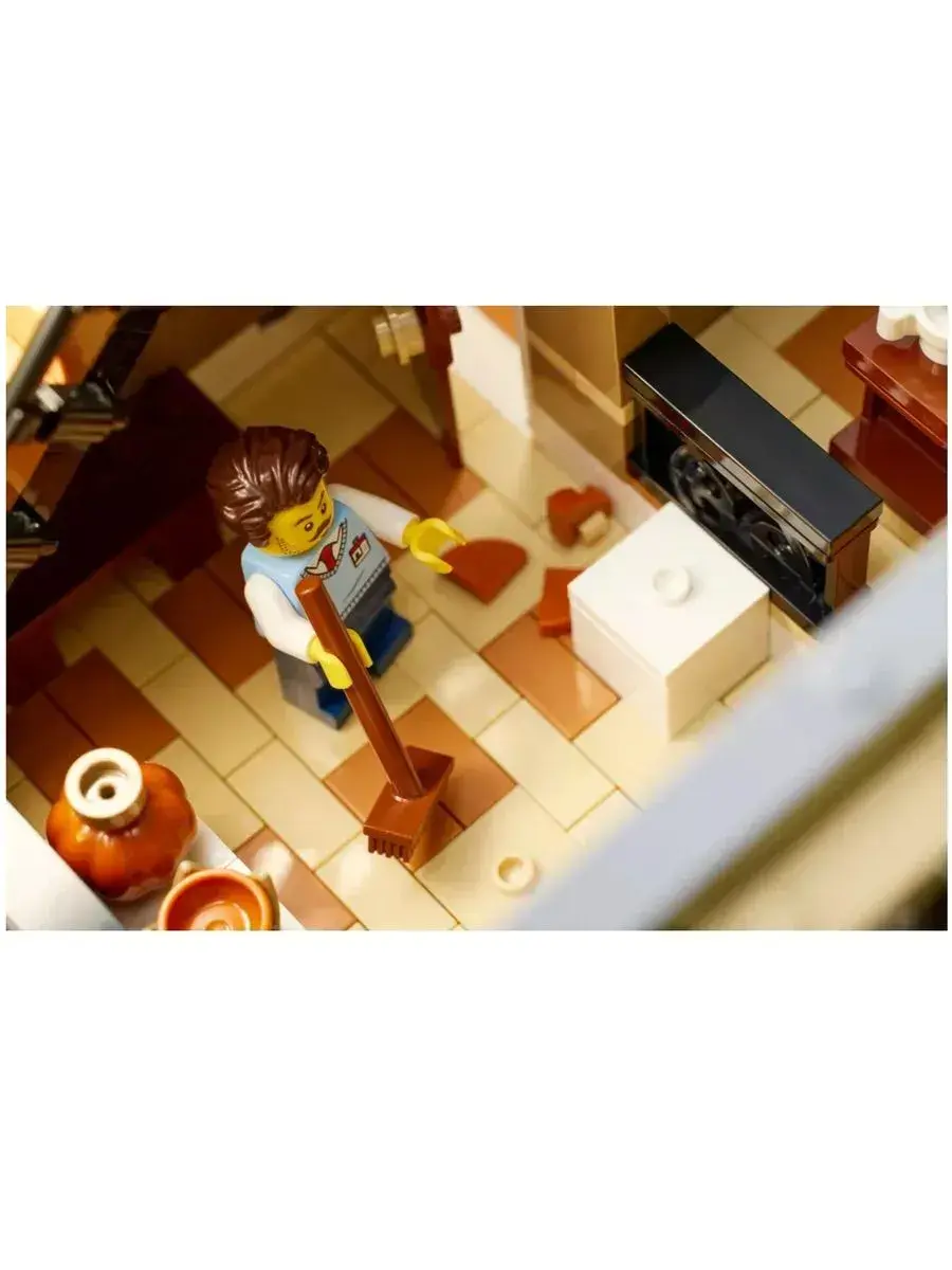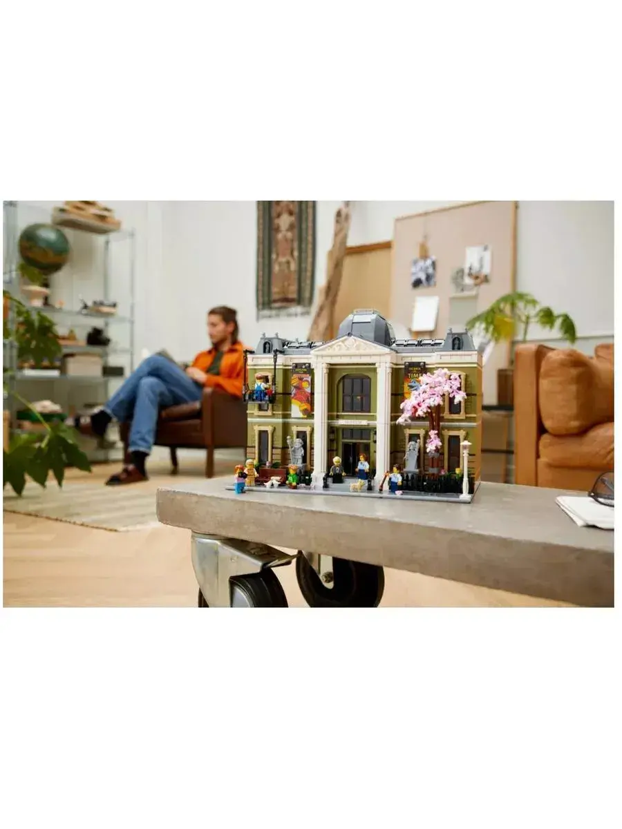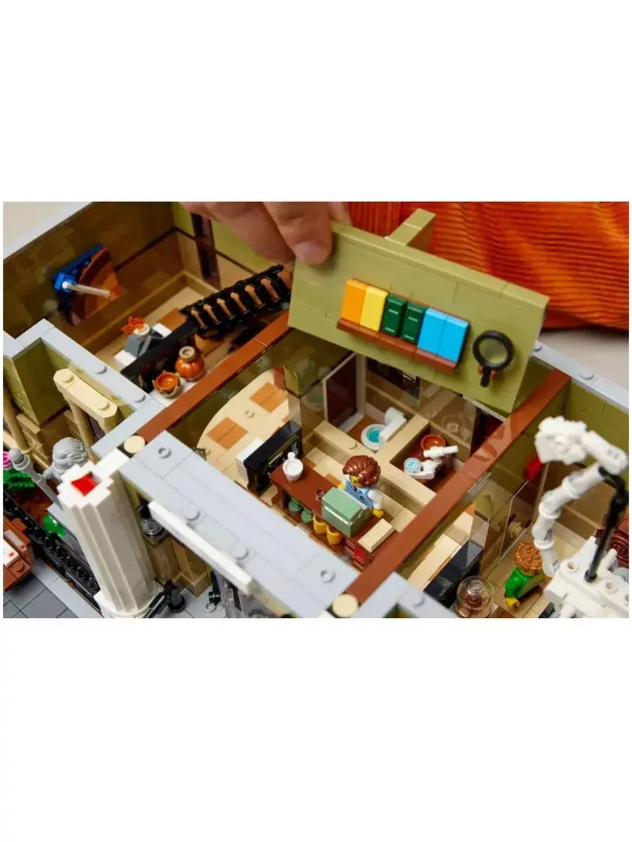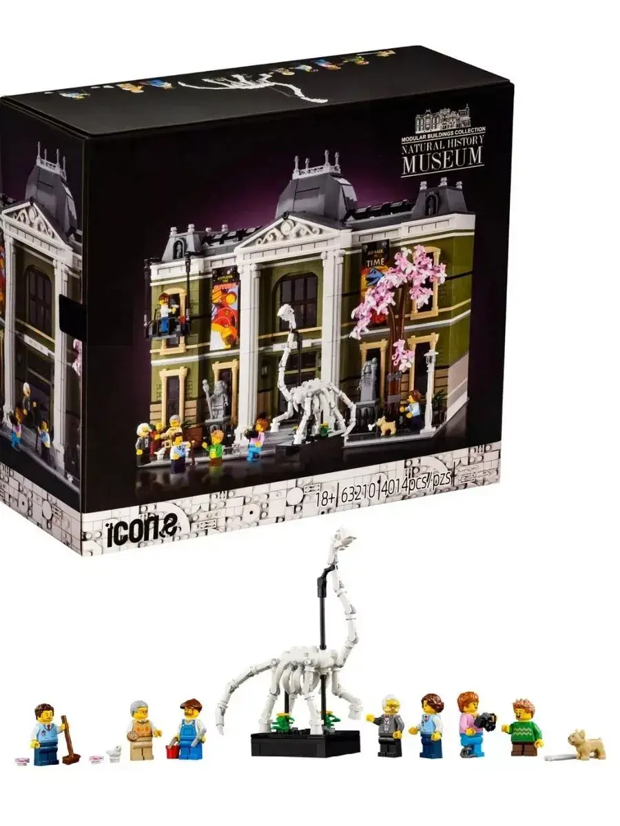 Конструктор Музей Естественной Истории — высококачественный конструктор из 4014 деталей в собранном виде имеет размеры 39*31*25 см. Окунитесь в мир истории развития нашей планеты: постройте двухэтажное модульное здание музея естествознания, и изучите вместе с гостями и опытным экскурсоводом ценные экспонаты. На первом этаже нас встречает сувенирный магазин и выставка первобытной истории, где размещены окаменелости, череп саблезубого тигра, вазы, модель вулкана и скелет брахиозавра, который возвышается через атриум на втором этаже музея. Лестница вдоль стены ведет на верхний этаж, где представлена коллекция, посвященная космосу: модель солнечной системы, в которой с поверхности Земли стартует ракета и другие модели космической тематики. На крыше сделаны большие полукруглые окна и кабинет директора с рабочим столом и печатной машинкой, а на открытой площадке установлен телескоп. В набор входят 7 минифигурок персонажей: руководитель музей в очках, женщина-экскурсовод, уборщик с метлой и шваброй, мойщик окон в кепке с ведром, посетитель музея в жилетке, гостья с фотоаппаратом, подросток в свитере, а так же две статуи эльфов из Ривенделла и фигурки собаки и голубя.