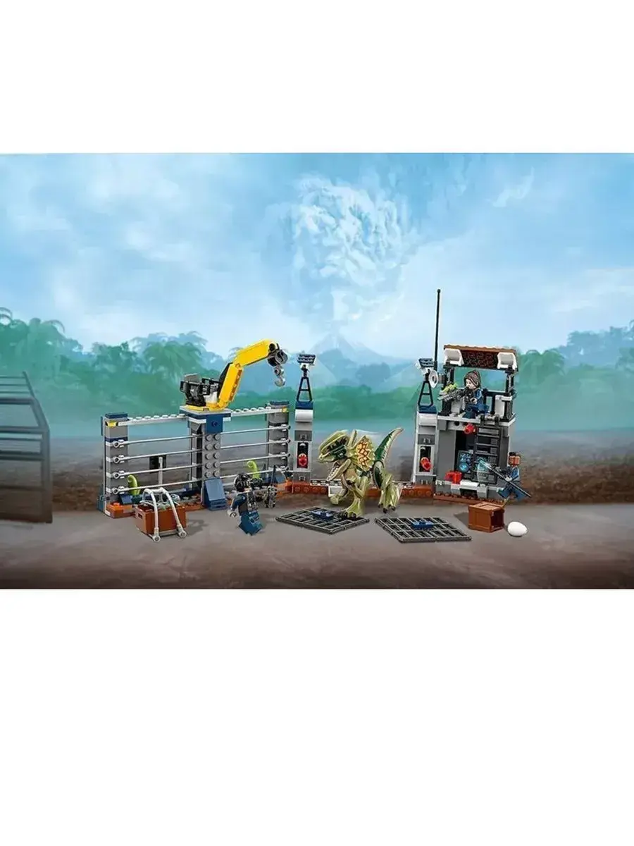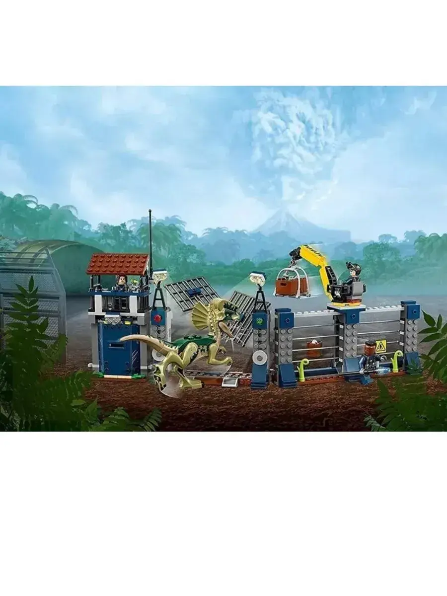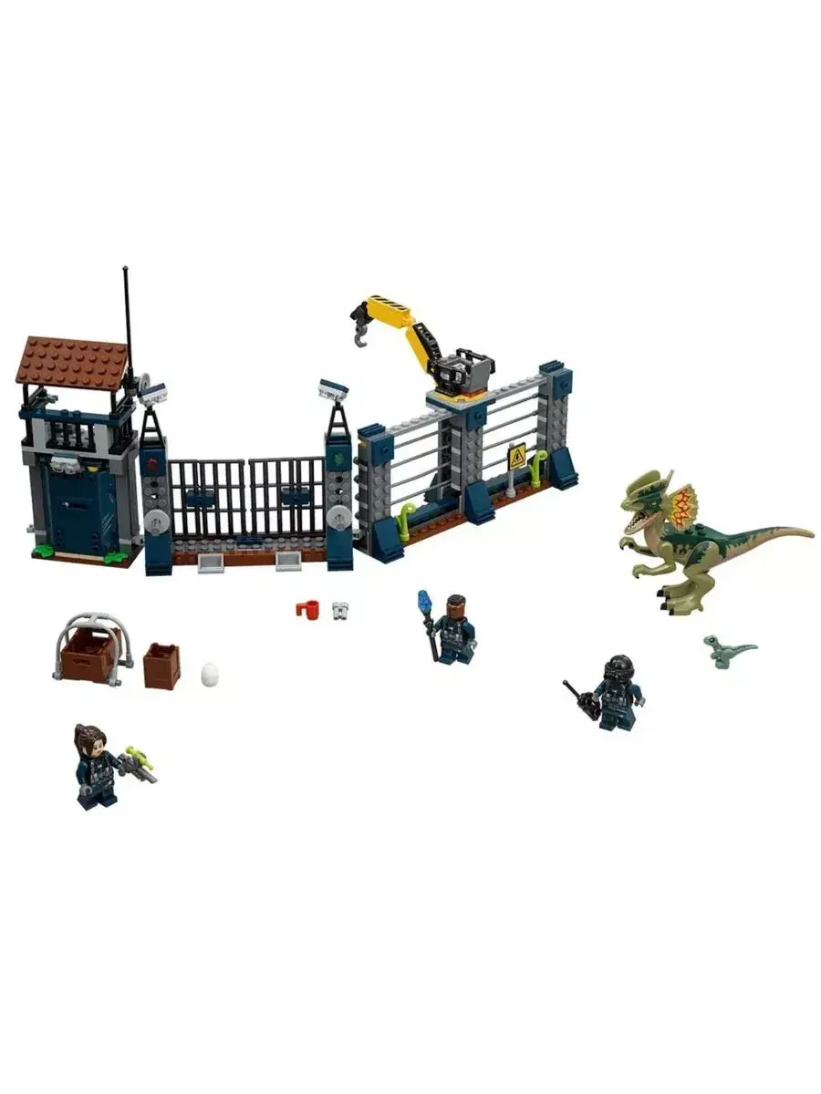 В парке Юрского периода сделано всё, чтобы посетители парка и травоядные динозавры были в безопасности. Хищных ящеров держат в специальной зоне, обнесенной забором с электрическим током. Но бывают и форс-мажорные ситуации. Например, сегодня малыш динозавр смог пробраться через забор в отсек хищников. Свирепый Дилофозавр устроил настоящую охоту и разошелся настолько, что выбил ворота сторожевой вышки и покинул вольер. Хорошо, что у сотрудников парка есть ружье со снотворным. Меткий выстрел и страшный хищник спит как младенец на лужайке. Пока монстр не проснулся, работники должны перенести Дилофозавра обратно в зону, починить забор и вернуть малыша динозавра маме. Детали конструктора позволяют собрать часть стены (14х37х6 см), окружающей парк динозавров.Конструкция делится на 2 зоны.Левая зона – сторожевая башня с прожекторами и антенной. На первом этаже обустроен рабочий кабинет сотрудника парка с монитором слежения, рацией и ружьем со снотворным. Второй этаж – дозорная вышка, с которой можно обозревать все самые дальние уголки парка. Между этажами спрятан рычаг, активировав который, можно выбить дверь.Правая зона – забор, находящийся под напряжением. На вершине ограды можно заметить подъемный кран. С его помощью работники кормят хищников и спасают малышей динозавров, оказавшихся на чужой территории. Между забором и сторожевой башней находятся распашные ворота. Их можно разрушить, надавив на рычаги у боковых опор, что и сделал Дилофозавр.