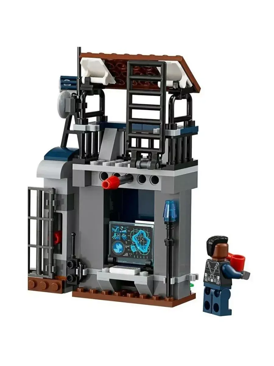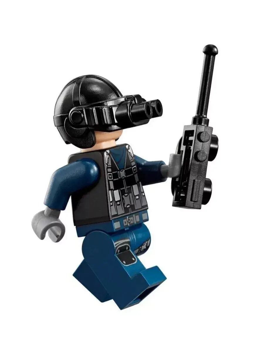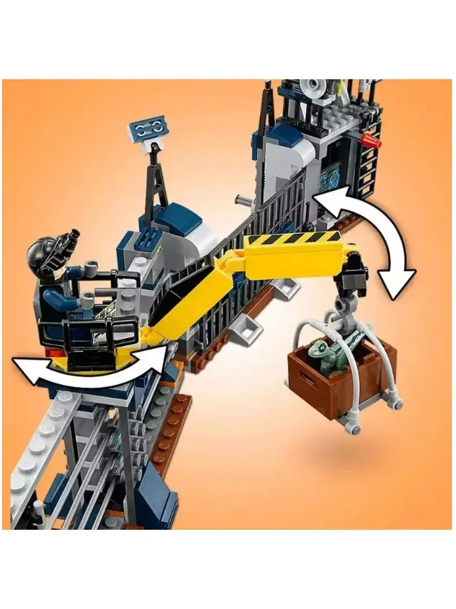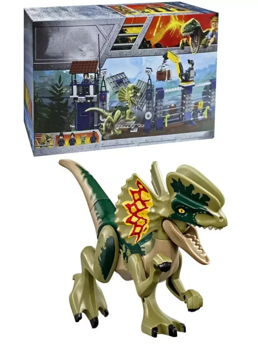 В парке Юрского периода сделано всё, чтобы посетители парка и травоядные динозавры были в безопасности. Хищных ящеров держат в специальной зоне, обнесенной забором с электрическим током. Но бывают и форс-мажорные ситуации. Например, сегодня малыш динозавр смог пробраться через забор в отсек хищников. Свирепый Дилофозавр устроил настоящую охоту и разошелся настолько, что выбил ворота сторожевой вышки и покинул вольер. Хорошо, что у сотрудников парка есть ружье со снотворным. Меткий выстрел и страшный хищник спит как младенец на лужайке. Пока монстр не проснулся, работники должны перенести Дилофозавра обратно в зону, починить забор и вернуть малыша динозавра маме. Детали конструктора позволяют собрать часть стены (14х37х6 см), окружающей парк динозавров.Конструкция делится на 2 зоны.Левая зона – сторожевая башня с прожекторами и антенной. На первом этаже обустроен рабочий кабинет сотрудника парка с монитором слежения, рацией и ружьем со снотворным. Второй этаж – дозорная вышка, с которой можно обозревать все самые дальние уголки парка. Между этажами спрятан рычаг, активировав который, можно выбить дверь.Правая зона – забор, находящийся под напряжением. На вершине ограды можно заметить подъемный кран. С его помощью работники кормят хищников и спасают малышей динозавров, оказавшихся на чужой территории. Между забором и сторожевой башней находятся распашные ворота. Их можно разрушить, надавив на рычаги у боковых опор, что и сделал Дилофозавр.