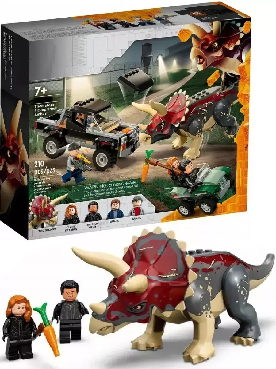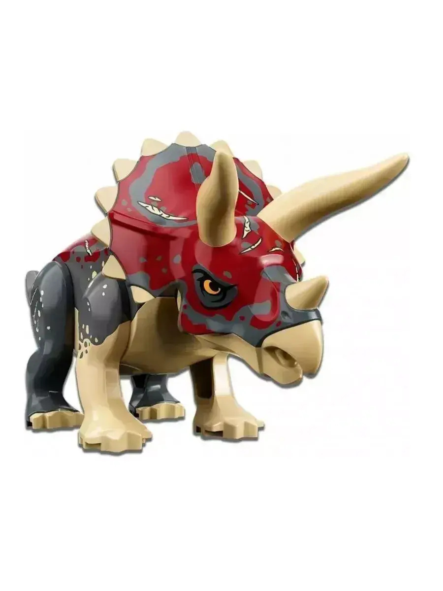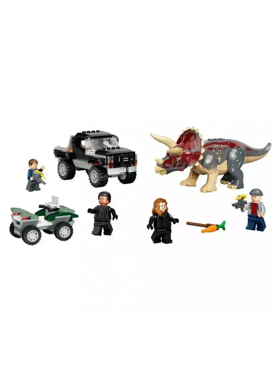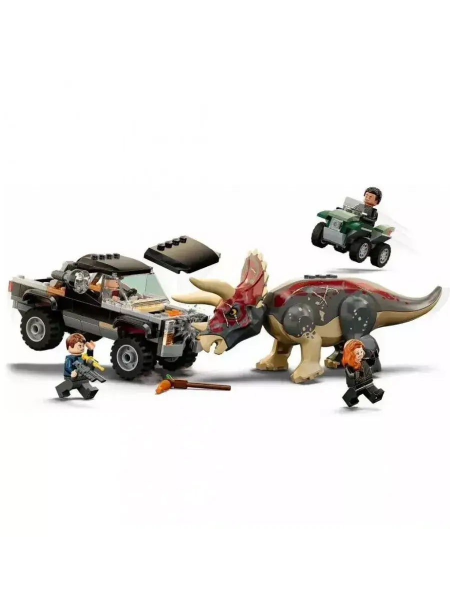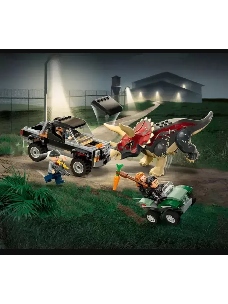 Конструктор позволит погрузиться в «Мир Юрского периода: Господство», или создать собственную версию событий. Набор включает фигурку трицератопса, сборный пикап, багги и 4 минифигурки. В пикап и багги помещаются по 2 фигурки. Передняя часть пикапа легко ломается и собирается заново. 4 минифигурки героев позволят разыграть сюжеты по мотивам любимого фильма.