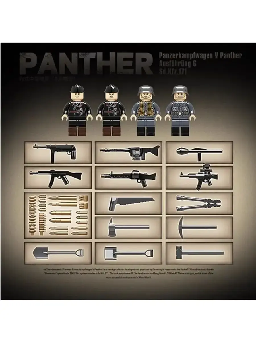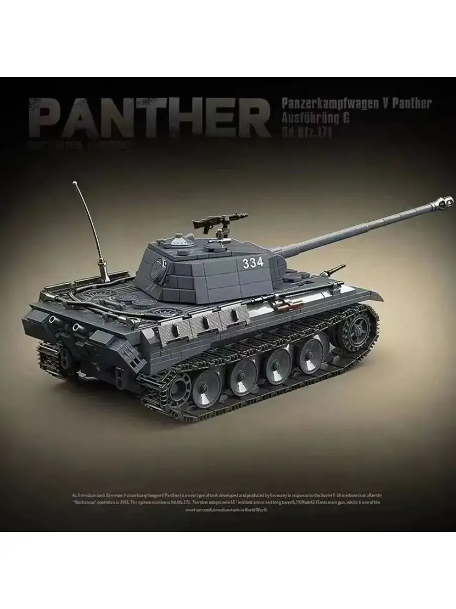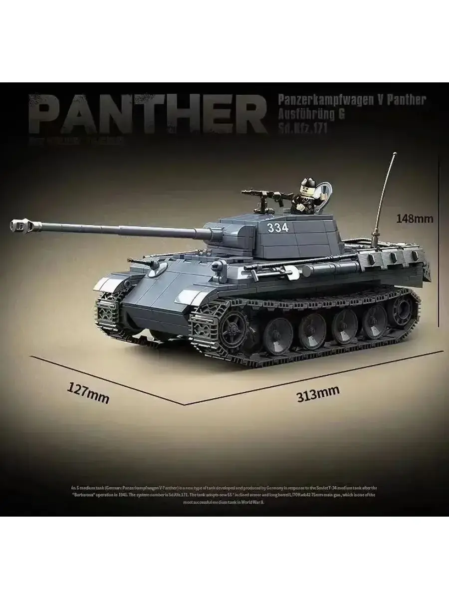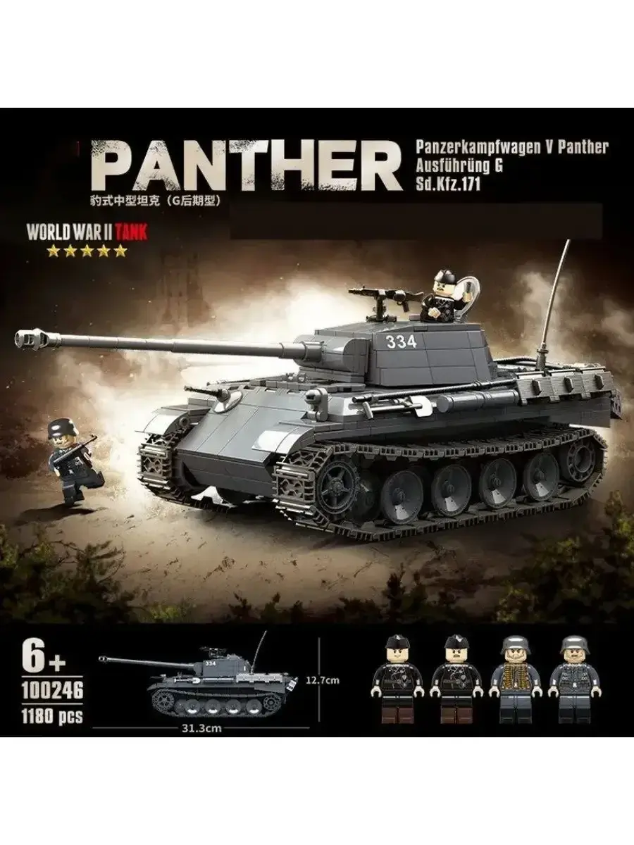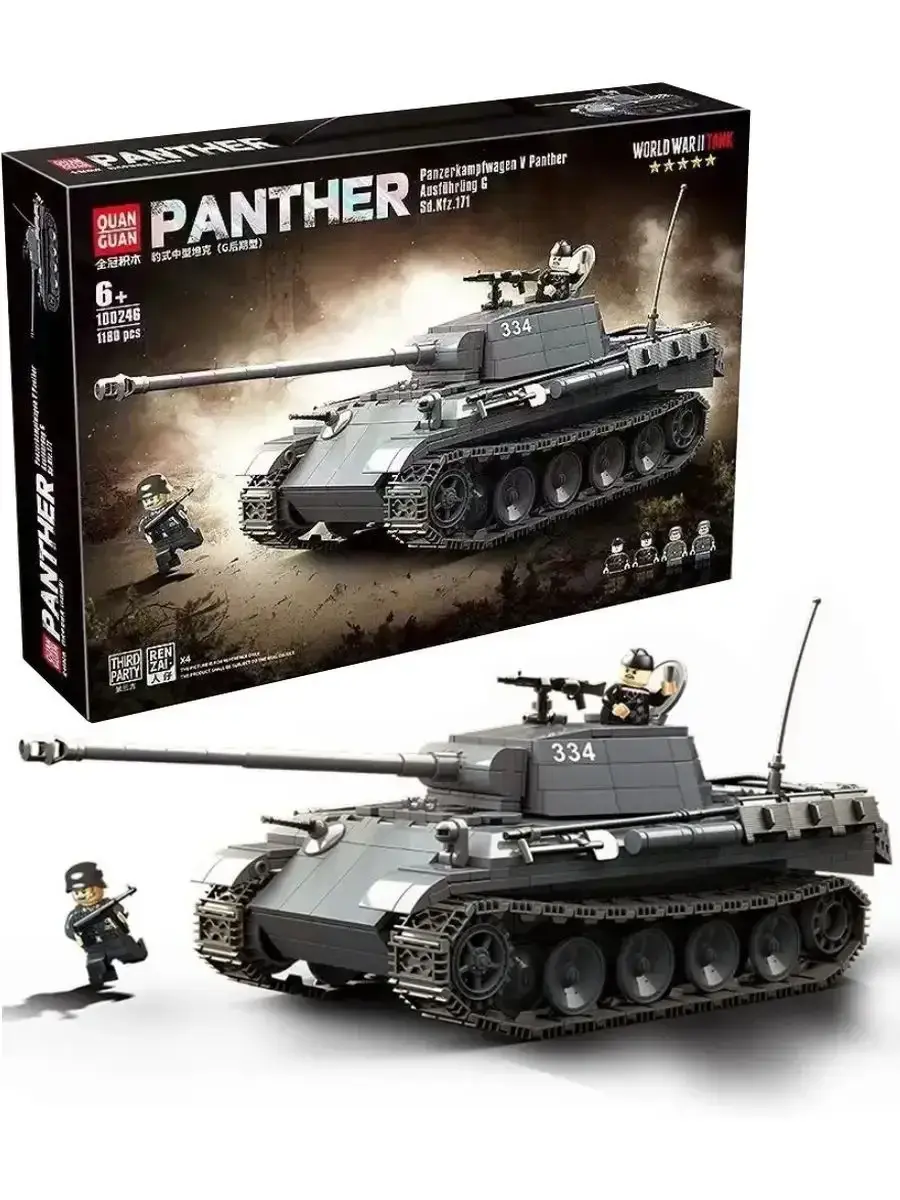 Набор конструктора Panther призван вдохновлять детей в возрасте от 6 лет на самостоятельные творческие игры. Реалистичные модели танка приводят в восторг всех детей с самого юного возраста. Конструктор, посвященный технике периода Второй мировой войны. Теперь у вас есть возможность собрать свою модель танка Пантера 334 Машина танк очень качественная и детализированная. В комплект входит оружие и военные минифигурки солдатики. В конструкторе из пластика производители постарались воссоздать точный уменьшенный вариант этой бронетанковой машины. Ребёнку предстоит собрать танк Пантера. Играйте и получайте пользу! Конструктор развивает мелкую моторику детских рук . Когда ребёнок соединяет детали, он учится делать точные, аккуратные движения. Также детские конструкторы развивают логическое мышление и внимательность необходимые при собирании модели полностью.