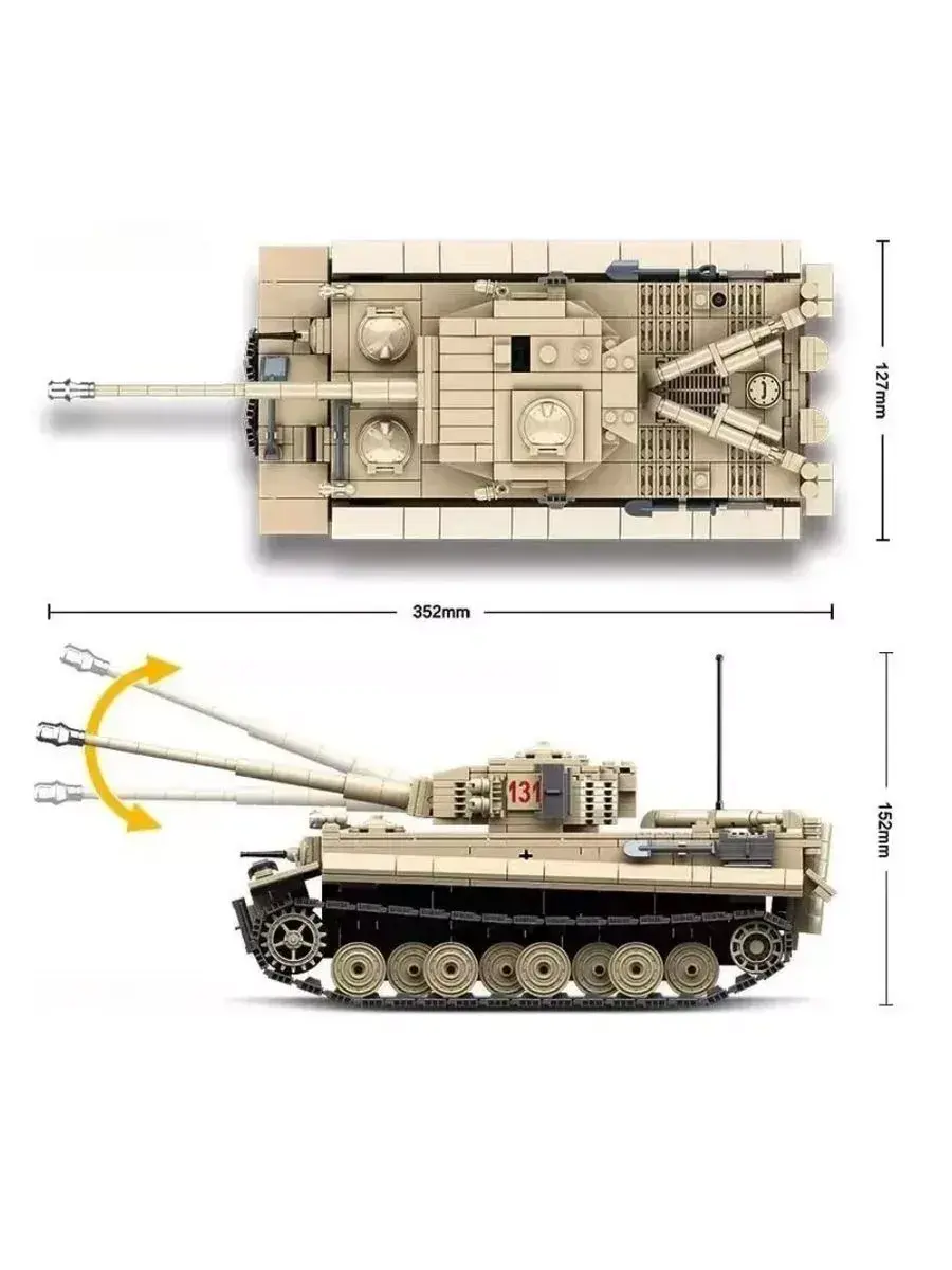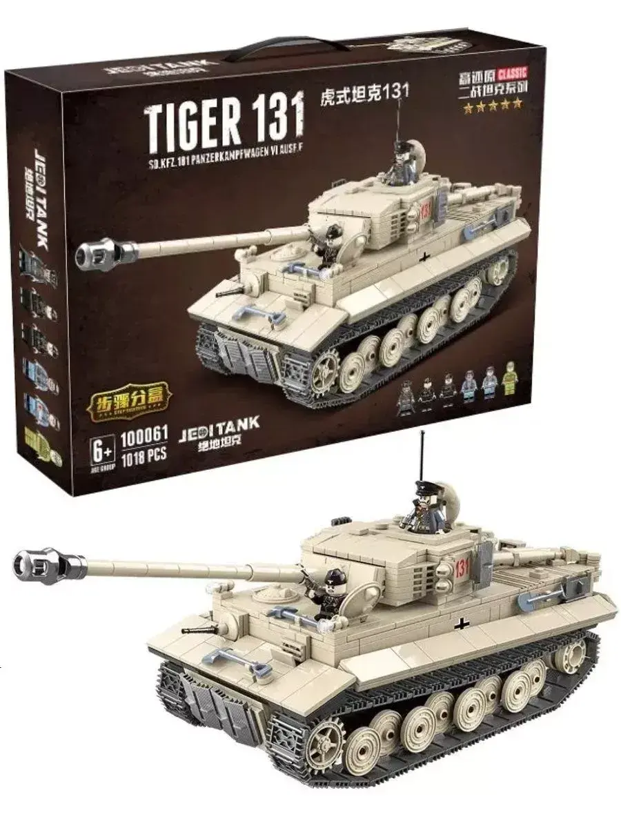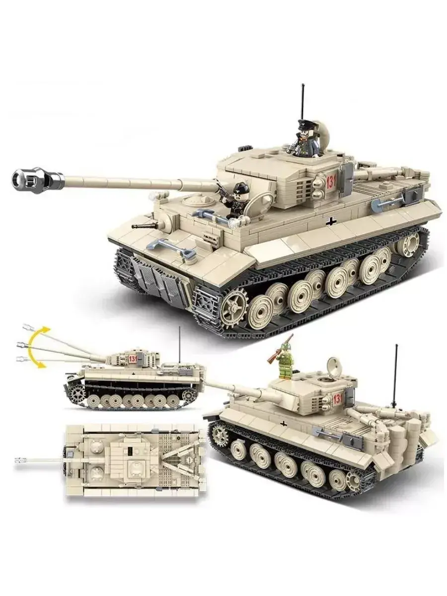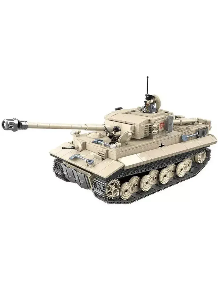 Конструктор Танк Тигр 131 100061 – это сборная модель, без которой не обойдется ни одно военное сражение. Представленный набором на 1018 деталей, он позволит соорудить один из трех видов боевого транспорта.Главный объект сборки в конструкторе – это бронированная боевая машина. Выполненная в черном и глиняном цвете, она украшается белой вставкой в виде эмблемы боевого отряда и красными и желтыми огоньками системы освещения. Ходовая часть танка в конструкторе имеет вид мощной подвески, базирующейся на пяти попарно расположенных колесах. Бездорожье, песчаная насыпь, покрытая гравием дорога, степь, перемежающаяся с топью – не существует никаких границ для этого вида транспорта.В передней части сборной модели конструктора находится мощный бампер. В центре транспортного средства располагается способная вращаться огневая башня. По бокам от нее размещаются радары, венчают огневую башню длинные антенны. Из люка танка, ведущего в боевое отделение, может высовываться солдат и вести обстрел противника с пулемета. Для уничтожения дальних целей в бою используется длинная, выносная пушка.