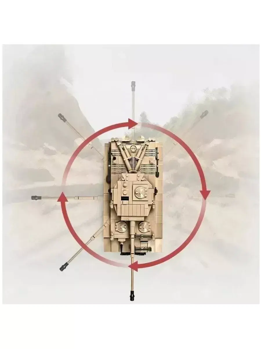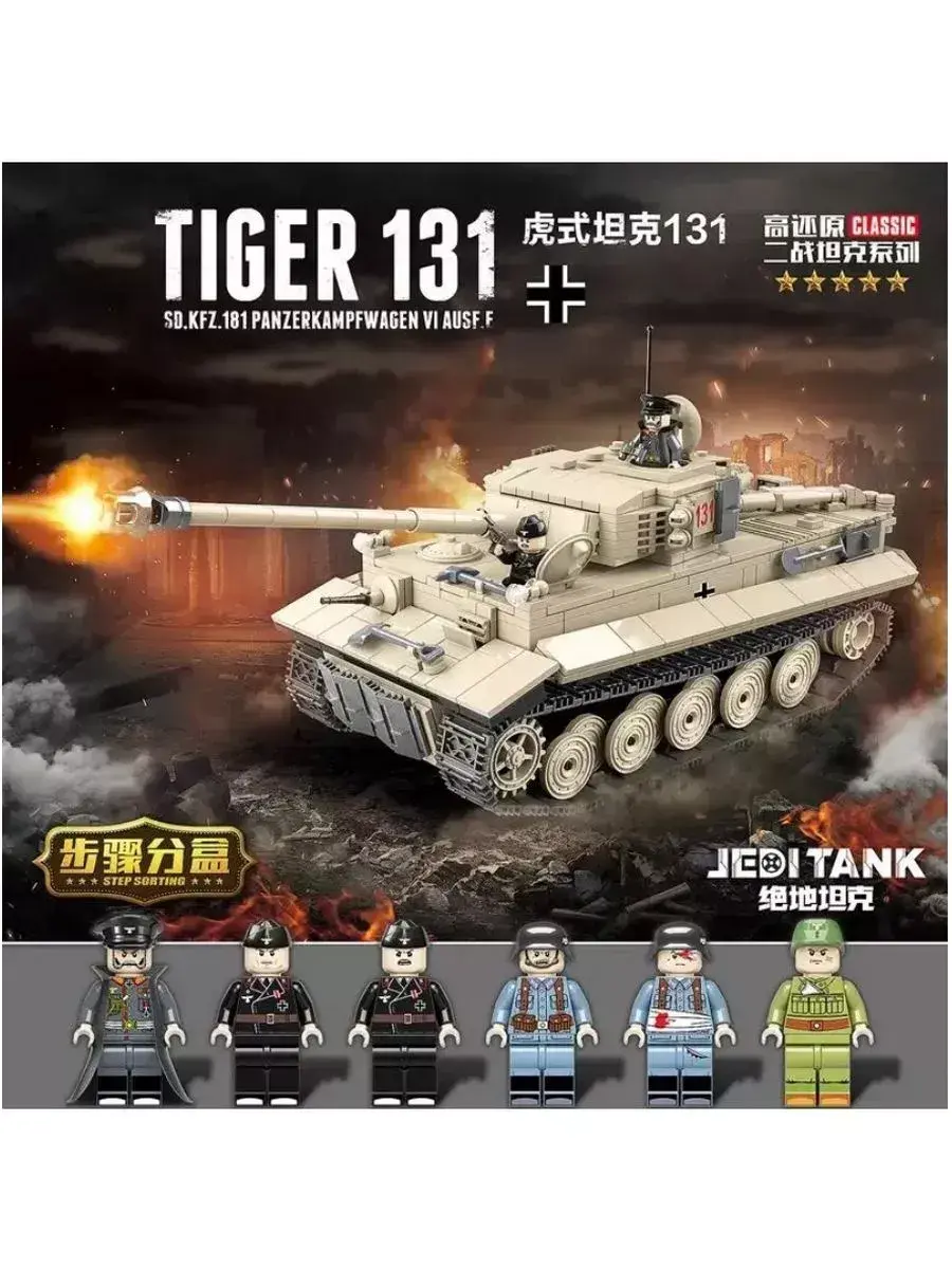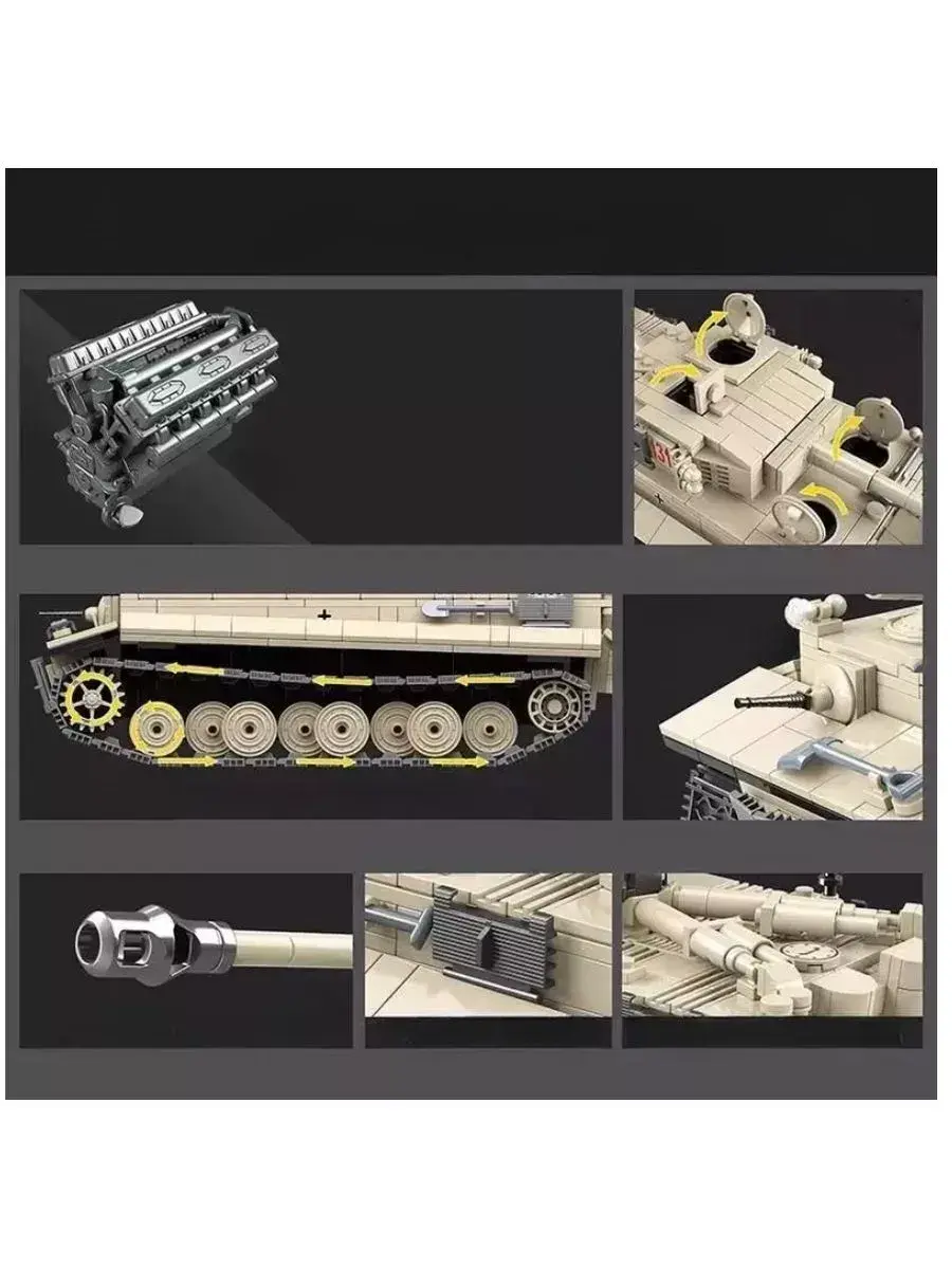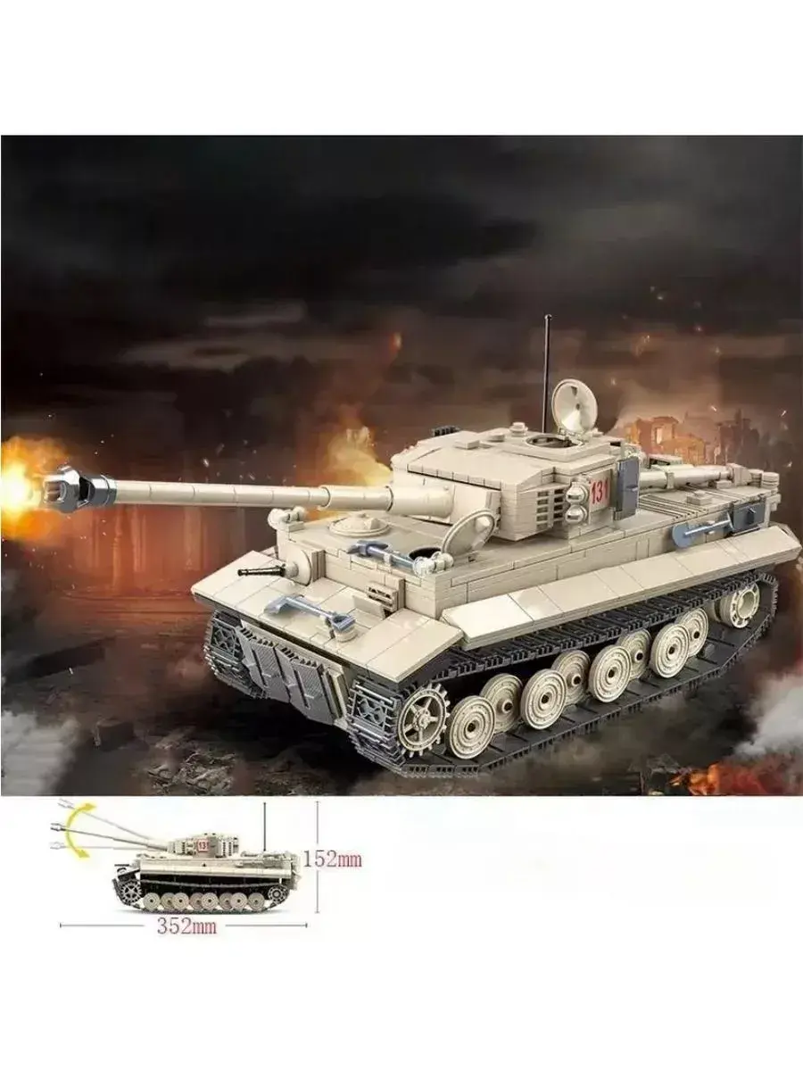 Конструктор Танк Тигр 131 100061 – это сборная модель, без которой не обойдется ни одно военное сражение. Представленный набором на 1018 деталей, он позволит соорудить один из трех видов боевого транспорта.Главный объект сборки в конструкторе – это бронированная боевая машина. Выполненная в черном и глиняном цвете, она украшается белой вставкой в виде эмблемы боевого отряда и красными и желтыми огоньками системы освещения. Ходовая часть танка в конструкторе имеет вид мощной подвески, базирующейся на пяти попарно расположенных колесах. Бездорожье, песчаная насыпь, покрытая гравием дорога, степь, перемежающаяся с топью – не существует никаких границ для этого вида транспорта.В передней части сборной модели конструктора находится мощный бампер. В центре транспортного средства располагается способная вращаться огневая башня. По бокам от нее размещаются радары, венчают огневую башню длинные антенны. Из люка танка, ведущего в боевое отделение, может высовываться солдат и вести обстрел противника с пулемета. Для уничтожения дальних целей в бою используется длинная, выносная пушка.
