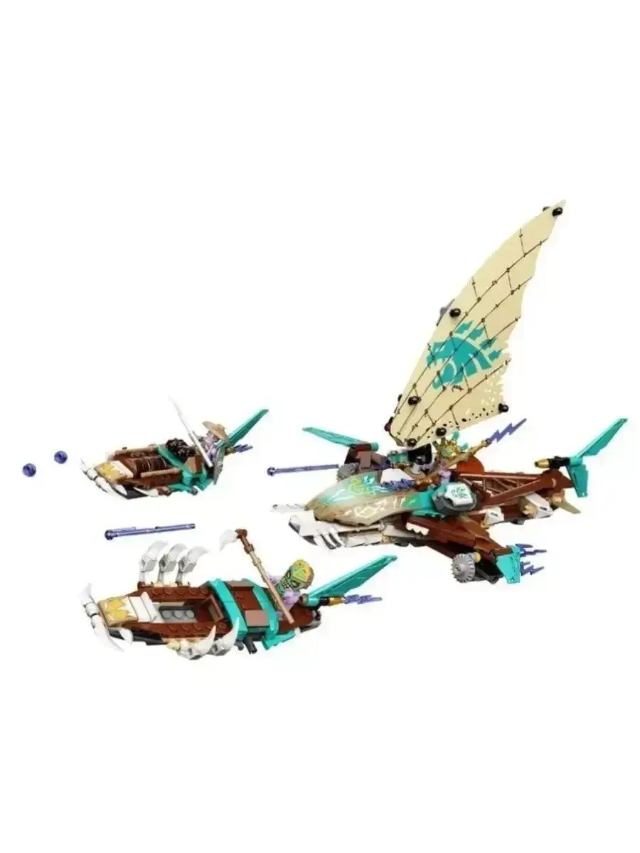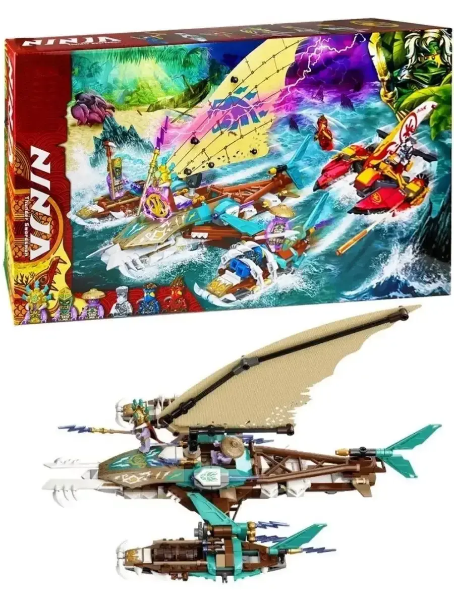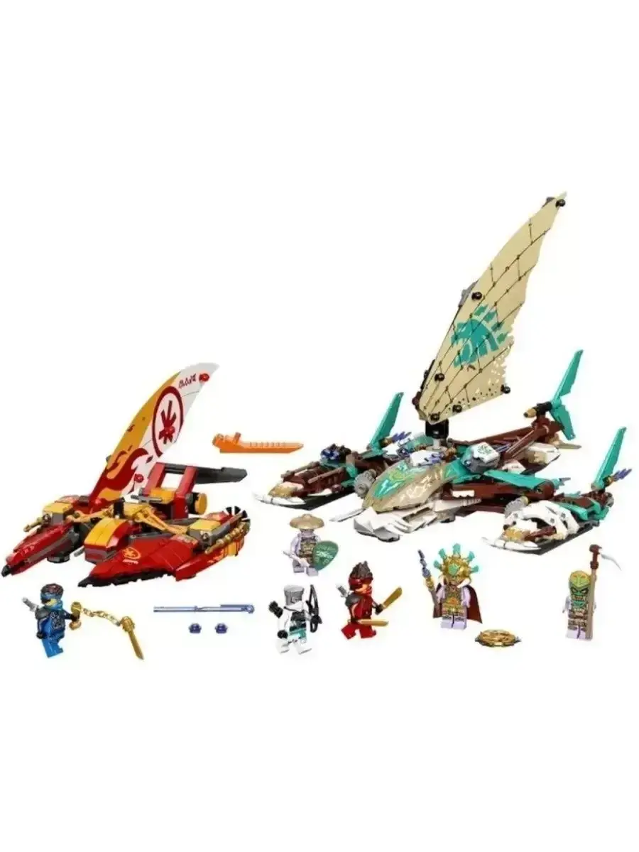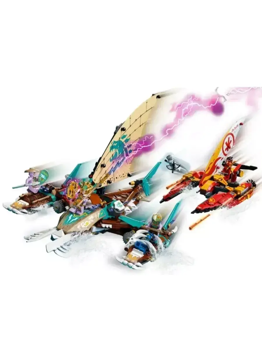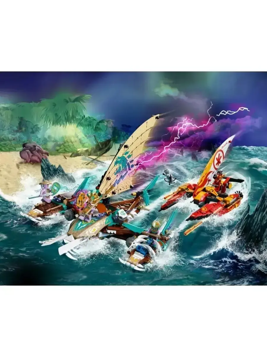 Конструктор Ниндзя Морская битва на катамаране — это захватывающий набор из 820 деталей, в котором вас ждёт масштабное сражение на воде. Главной особенностью конструктора являются два мощных катамарана — один принадлежит ниндзя, второй — их противникам. Каждый из них оснащён подвижными элементами, метательными установками и скрытыми деталями, позволяющими устраивать настоящие морские схватки.