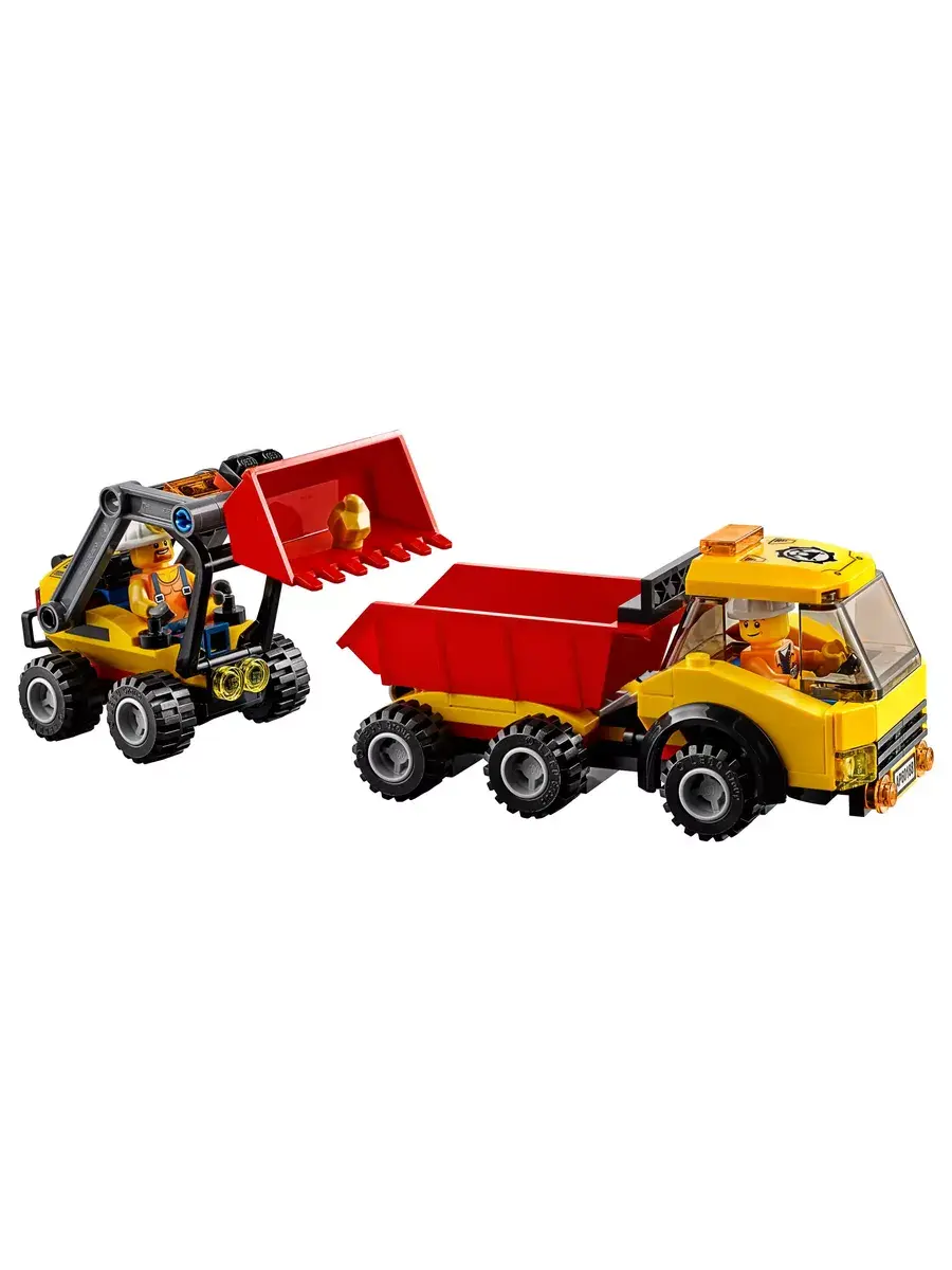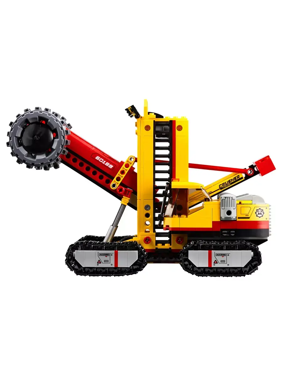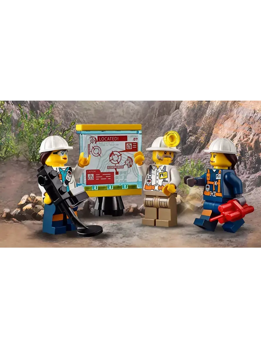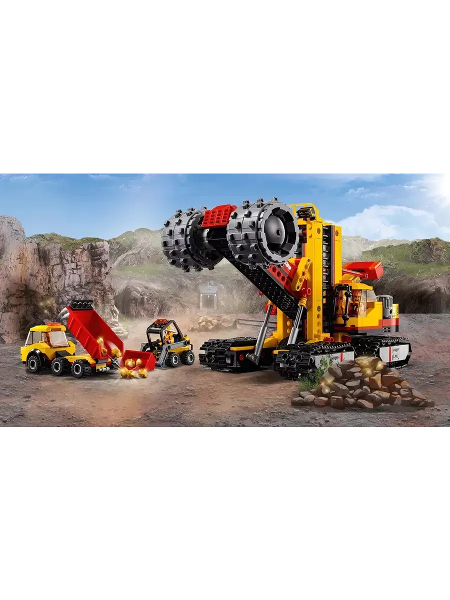 Конструктор из серии Сити Шахта состоит из 919 деталей. В наборе достаточно много разнообразной техники, которая применяется при подземных горных выработках. Среди всех представленных моделей самой внушительной получится дробильной машины на гусеничном ходу. Техника привлекает внимание большой дробильно буровой установкой роторного типа. В модели она рабочая приводится в действие при поднятии и опускании противовеса. Затем необычным выглядит устройство ходовой части. Именно оригинальные четыре выносных опоры на широких гусеничных лентах позволяют внешне неуклюжему гиганту легко передвигаться и маневрировать. Дополнительно из деталей собирается самосвал для перевозки грузов и небольшой погрузчик с ковшом. Для более полного погружения в жизнь шахтеров из деталей также собирается фрагмент горы с проложенными шахтерскими путями. В этой локации вы найдете разрушающуюся каменную стену, тоннель, цех для погрузки, элементы железной дороги и вагонетки. В комплект входят 6 фигурок с профессиональными шахтерскими аксессуарами.