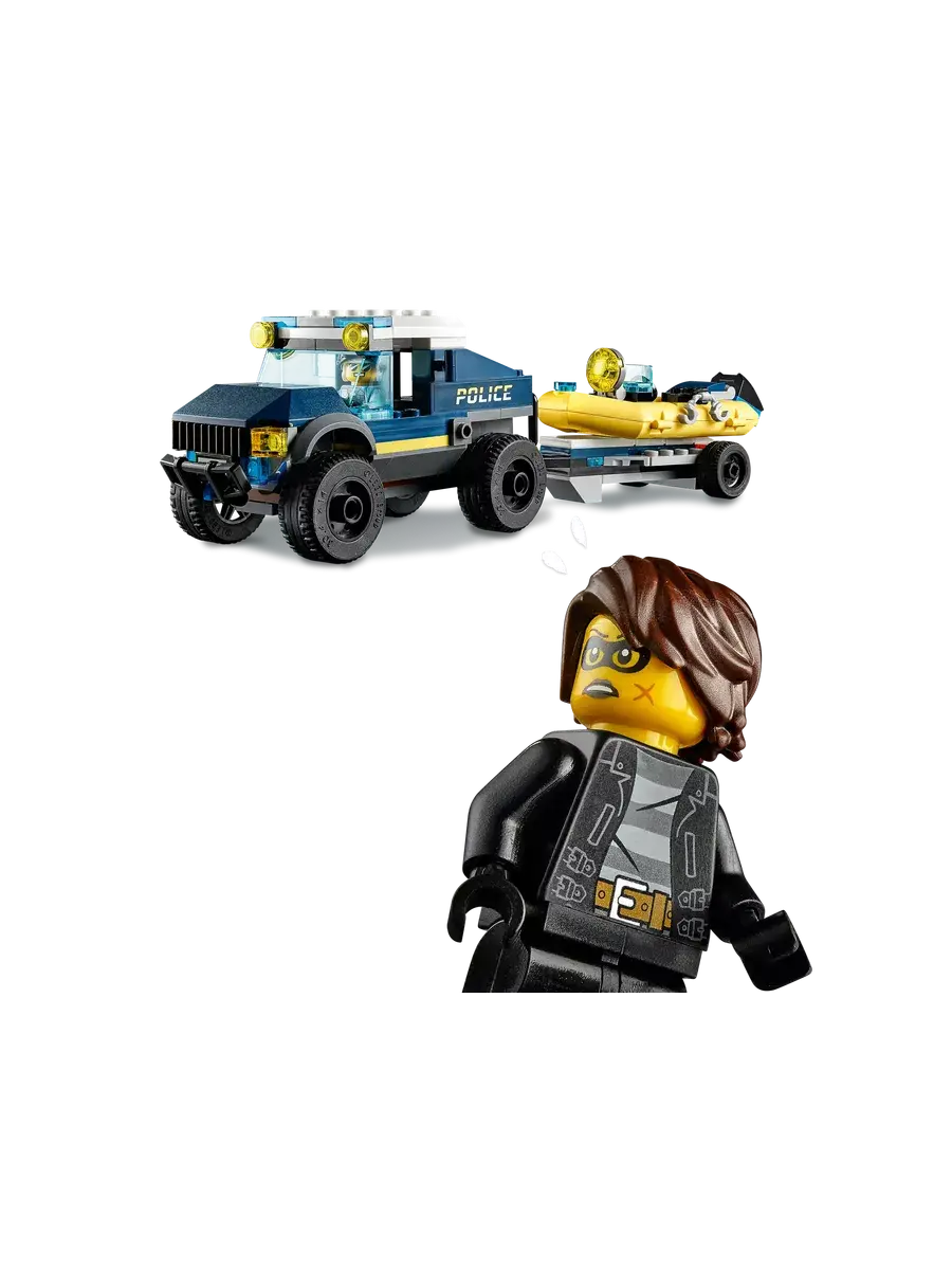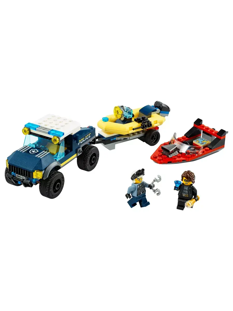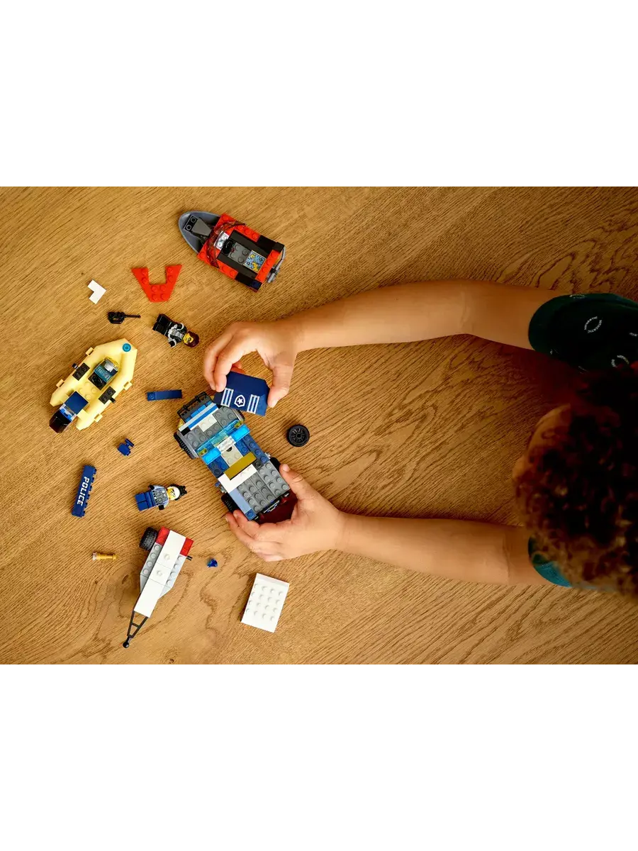 Воришка пытается скрыться с награбленными драгоценностями на суперскоростном катере. Скорее гони к месту преступления на бронированном внедорожнике. Выгрузи крутую полицейскую лодку из прицепа, хватай бинокль ночного видения и отправляйся в погоню за воришкой, который вот-вот скроется в темноте. Это всего лишь ещё один обычный день элитного отряда Полиции. В этот набор входит бронированный полицейский внедорожник с открепляемым прицепом для лодок, надувная лодка и крутой катер. Простая в сборке модель. Крутые игрушки из этого набора предлагают увлекательные сценарии для игр, которые являются творческим переосмыслением реальной жизни. Реалистичные транспортные средства и забавные персонажи призваны пробуждать воображение и вдохновлять на творческие игры детей и взрослых. Конструктор станет отличным подарком на день рождения или другой праздник. Данный конструктор совместим с Лего